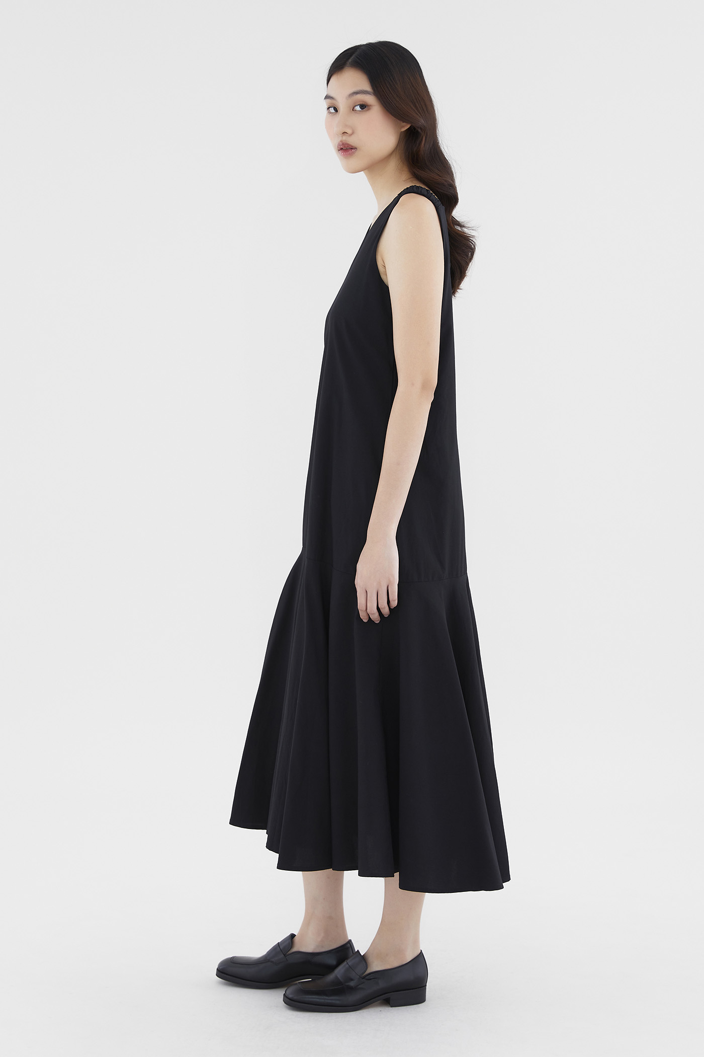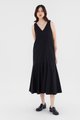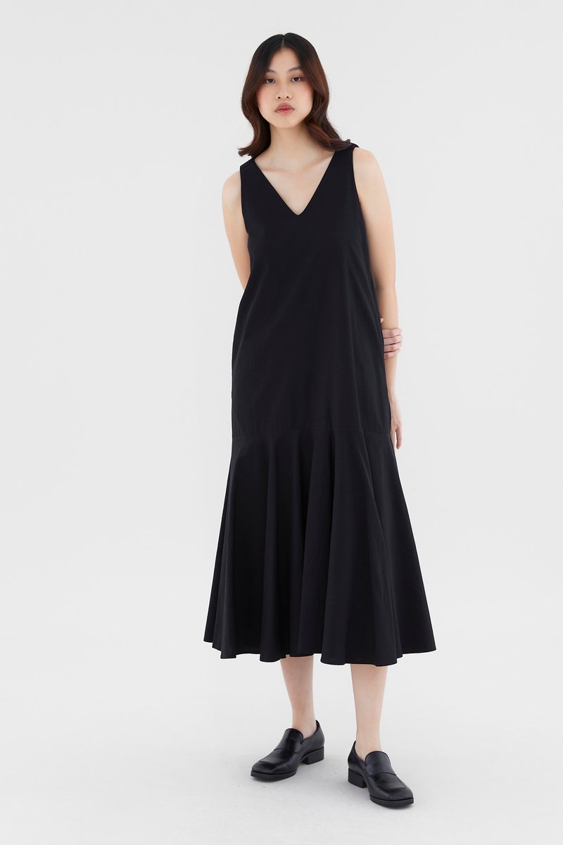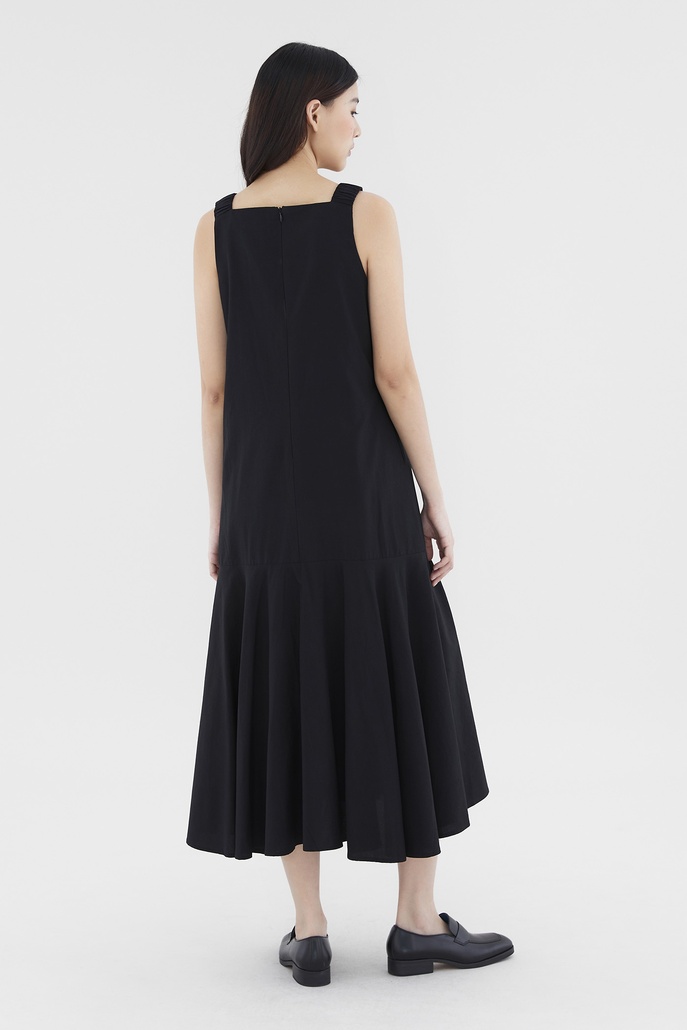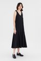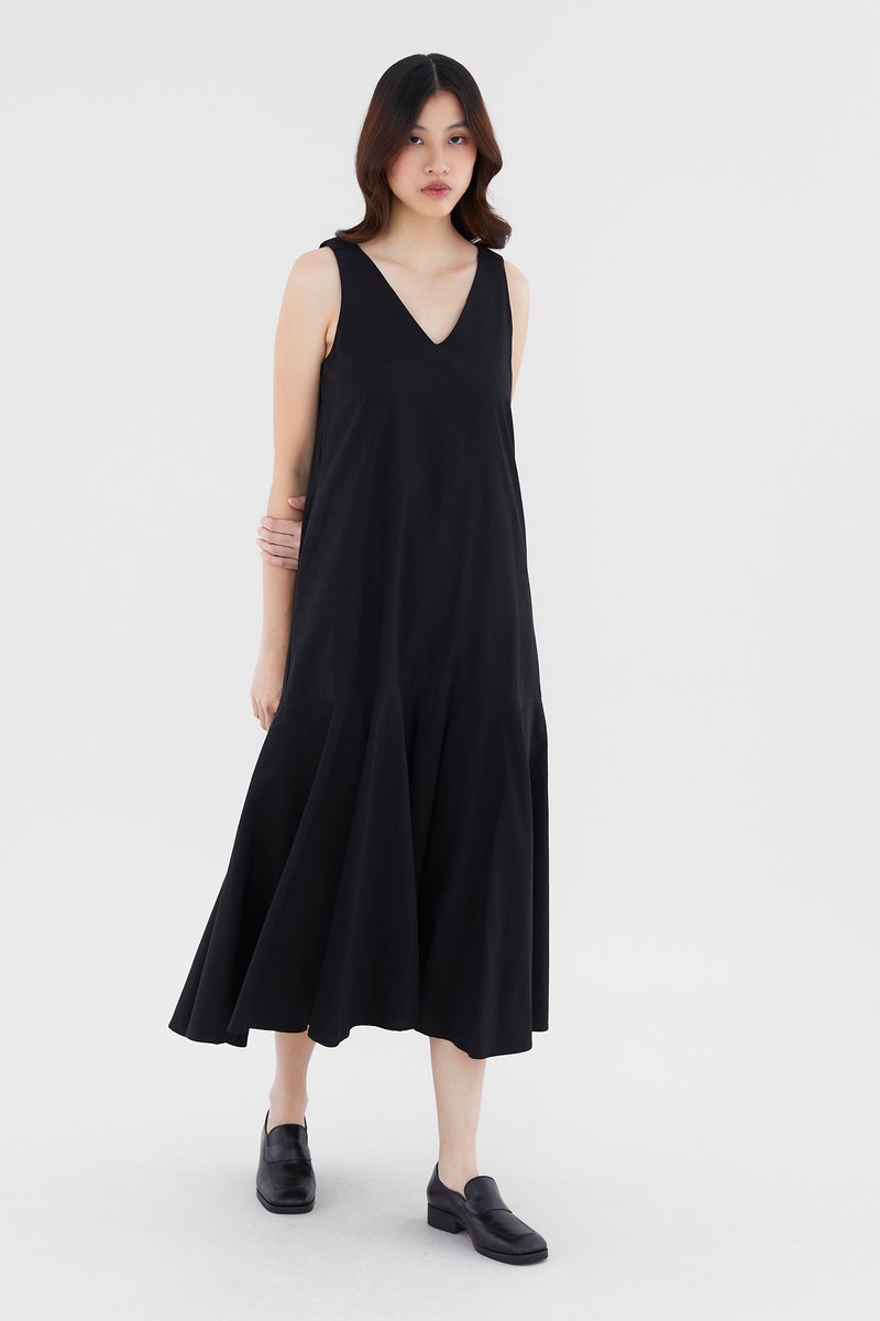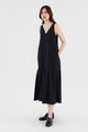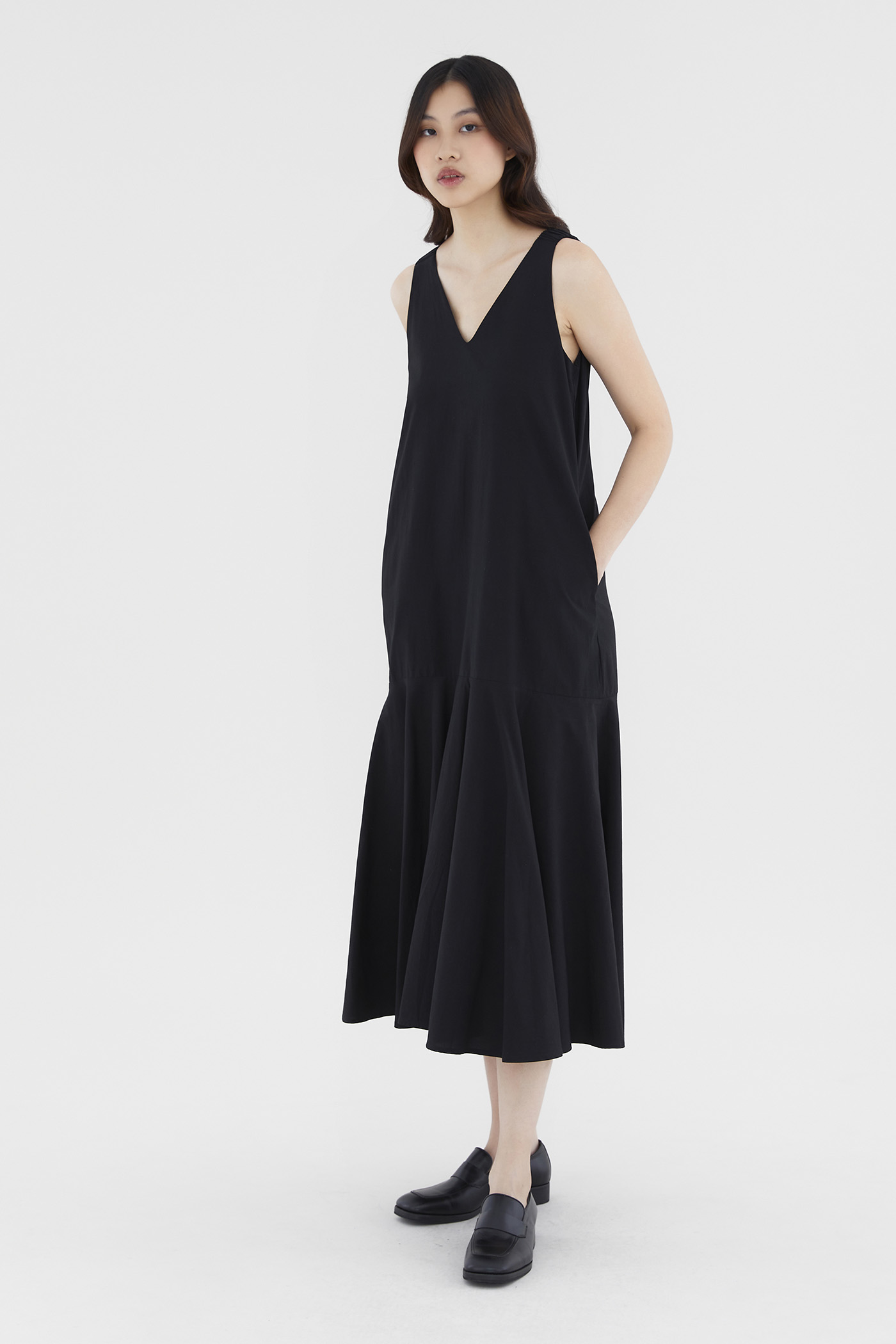 Minimalist silhouette, outstanding details. Made from smooth and non-stretch fabric, this V-neck maxi dress flaunts a structured drape, elasticated ruched shoulder straps and a tiered, drop-waist silhouette. Worn in a relaxed fit with a zip closure on the back.