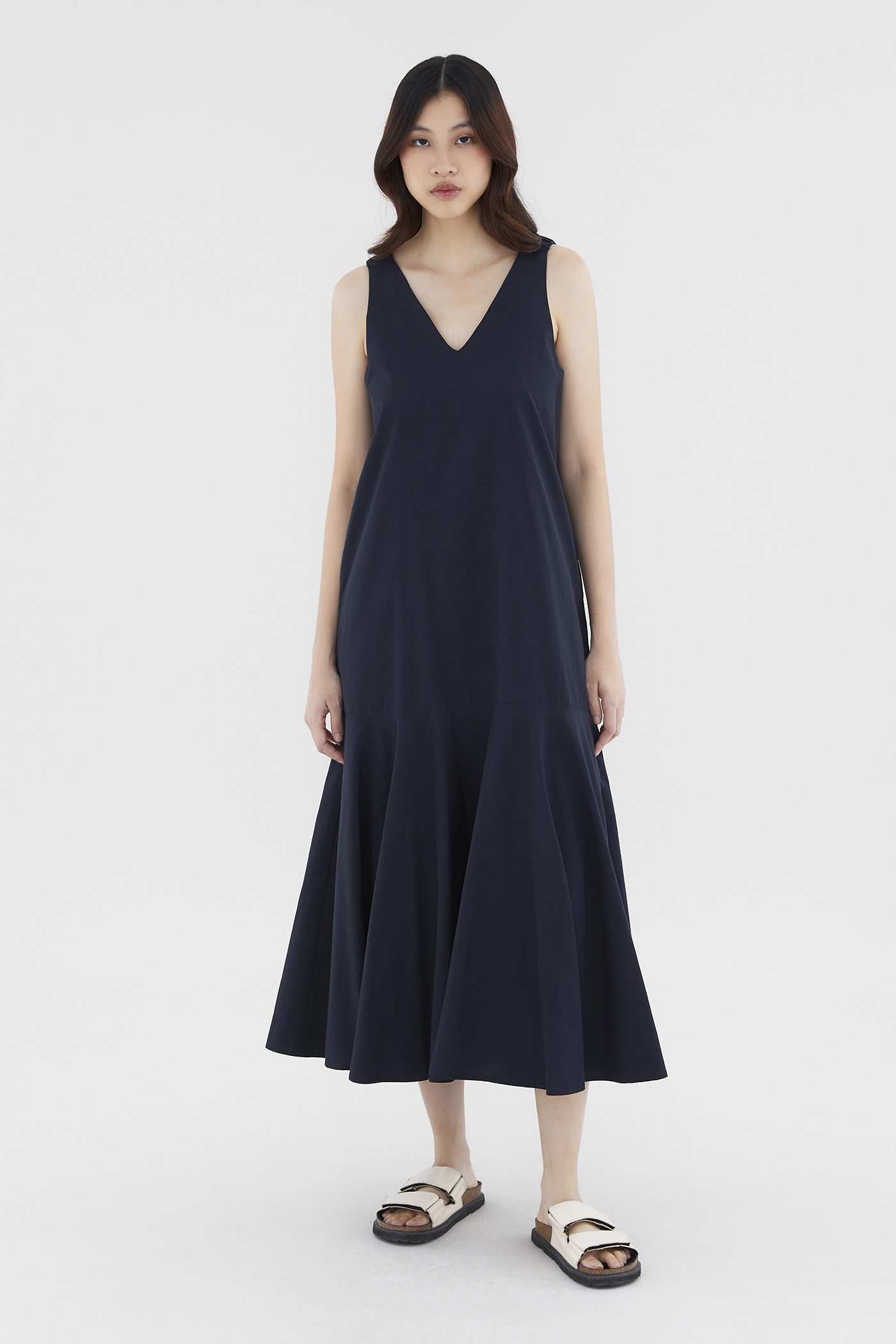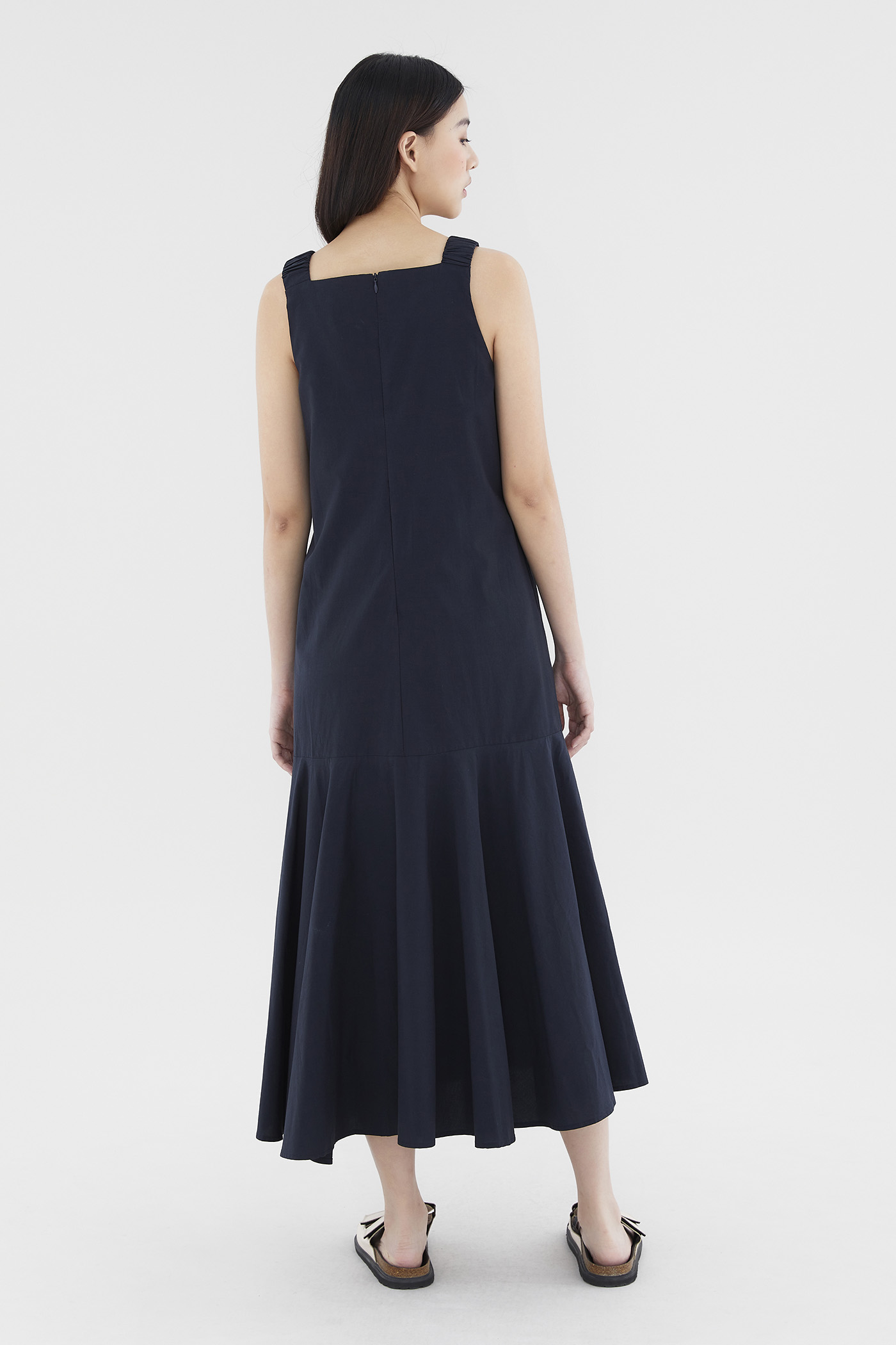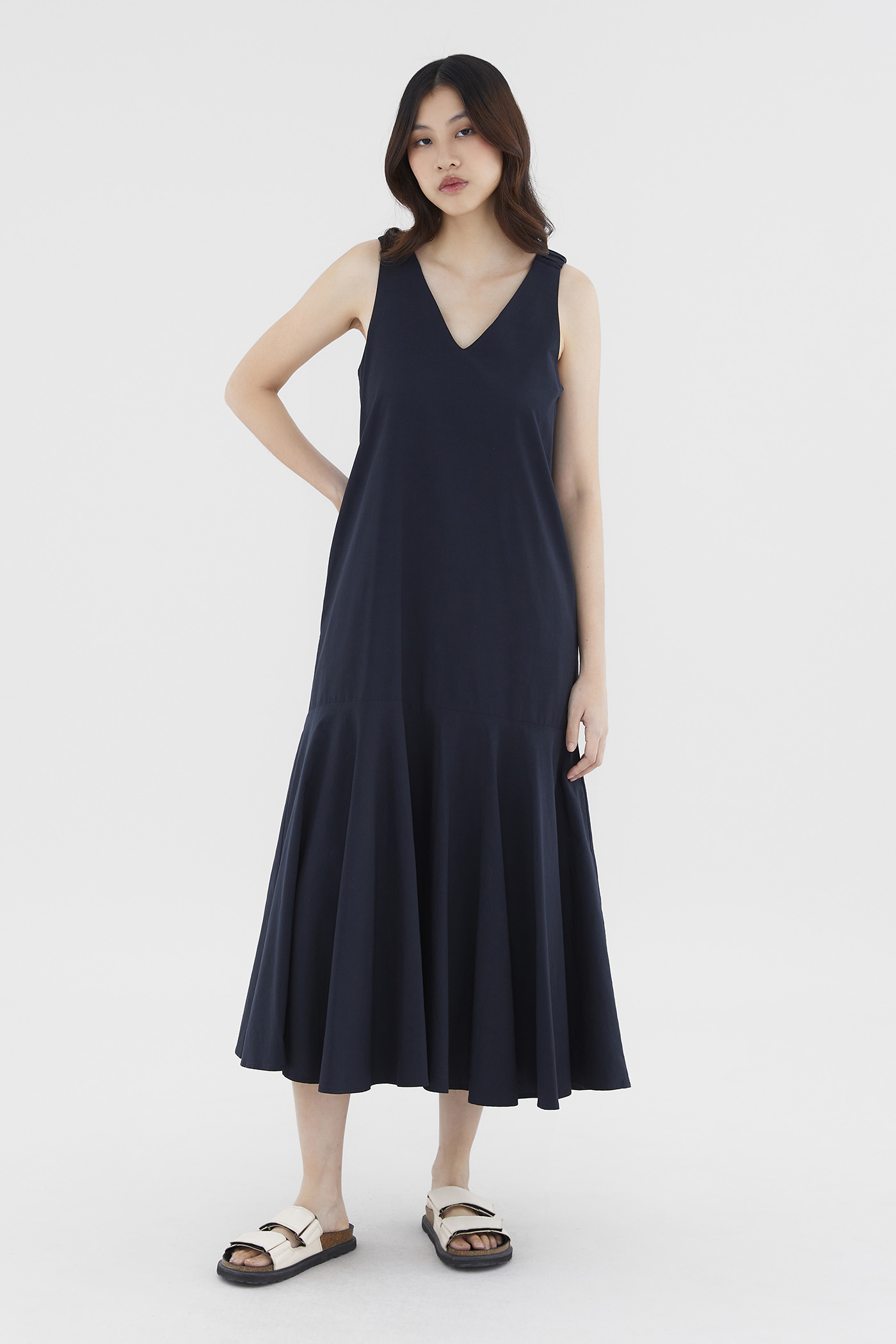 Minimalist silhouette, outstanding details. Made from smooth and non-stretch fabric, this V-neck maxi dress flaunts a structured drape, elasticated ruched shoulder straps and a tiered, drop-waist silhouette. Worn in a relaxed fit with a zip closure on the back.