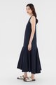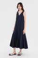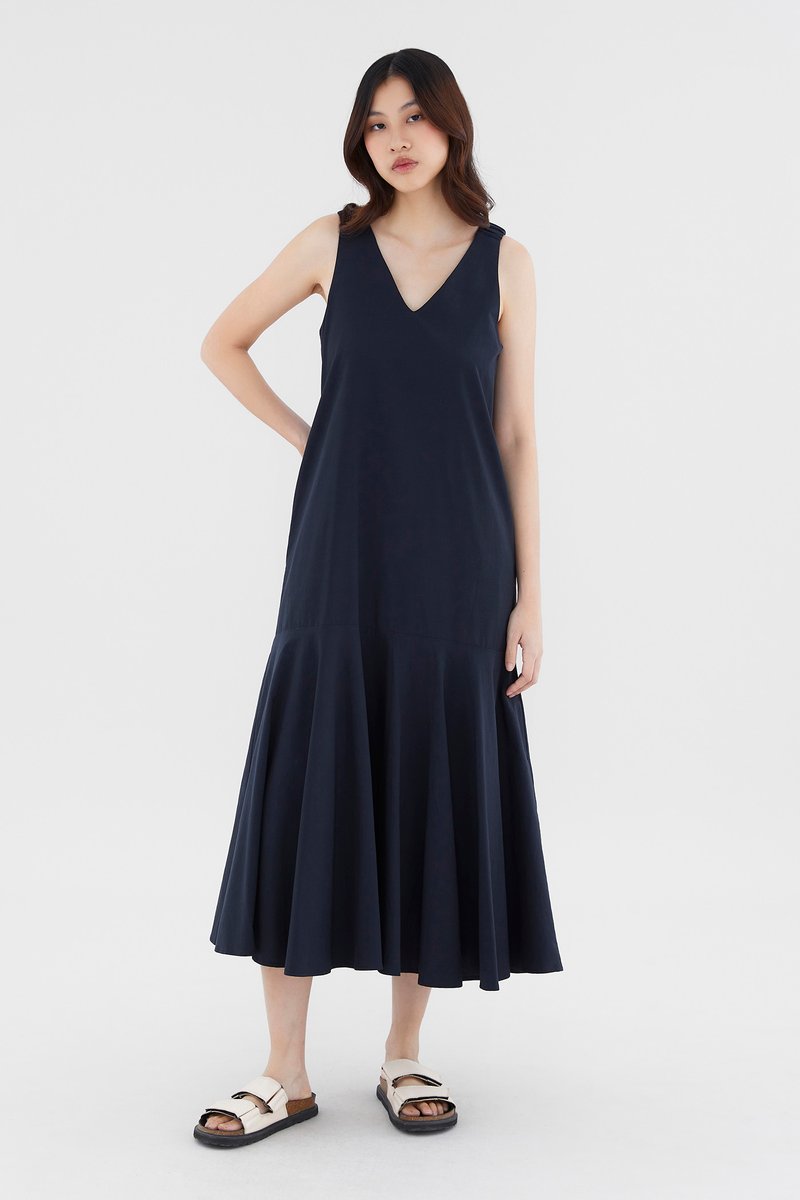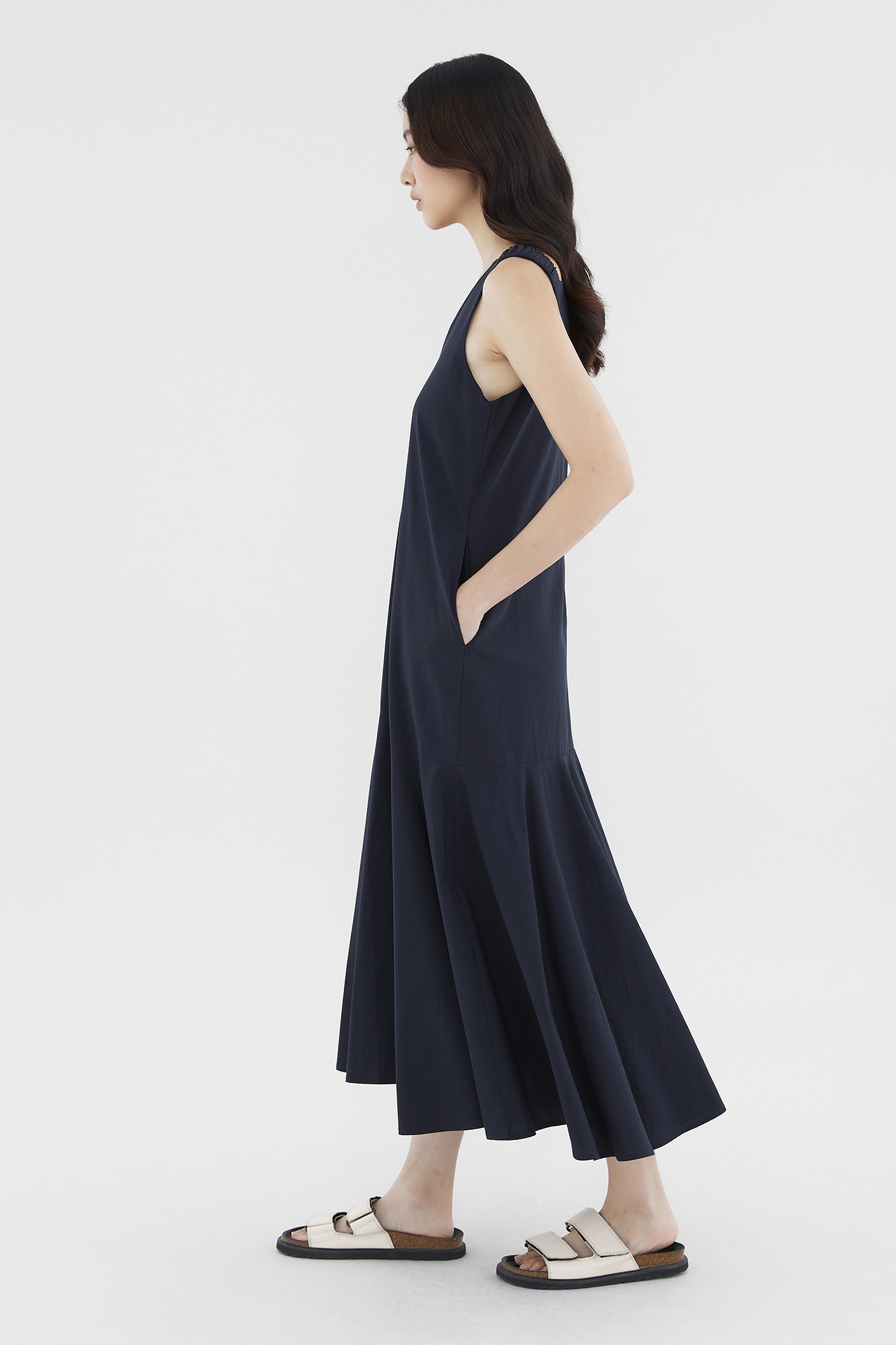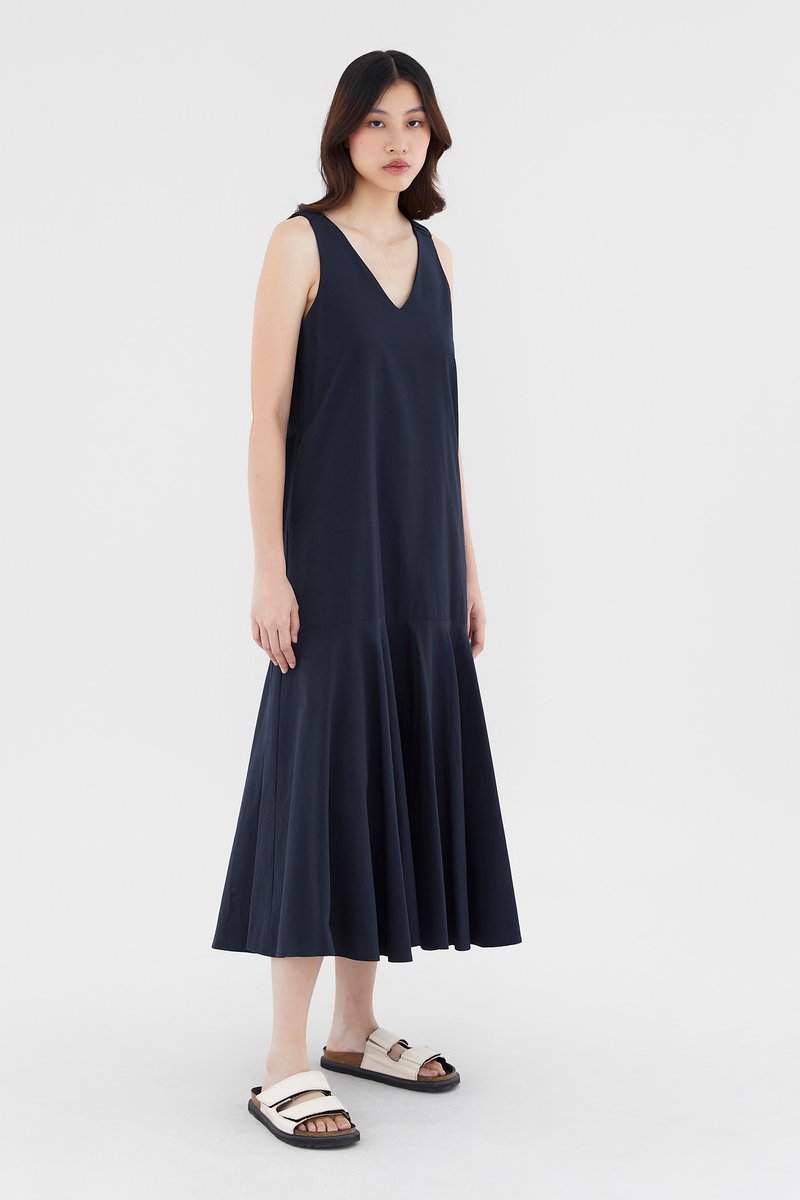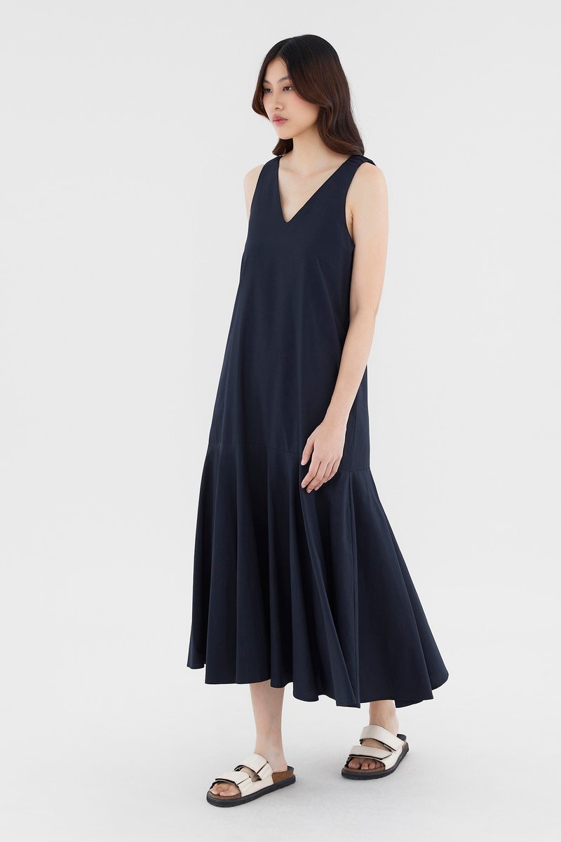 Minimalist silhouette, outstanding details. Made from smooth and non-stretch fabric, this V-neck maxi dress flaunts a structured drape, elasticated ruched shoulder straps and a tiered, drop-waist silhouette. Worn in a relaxed fit with a zip closure on the back.