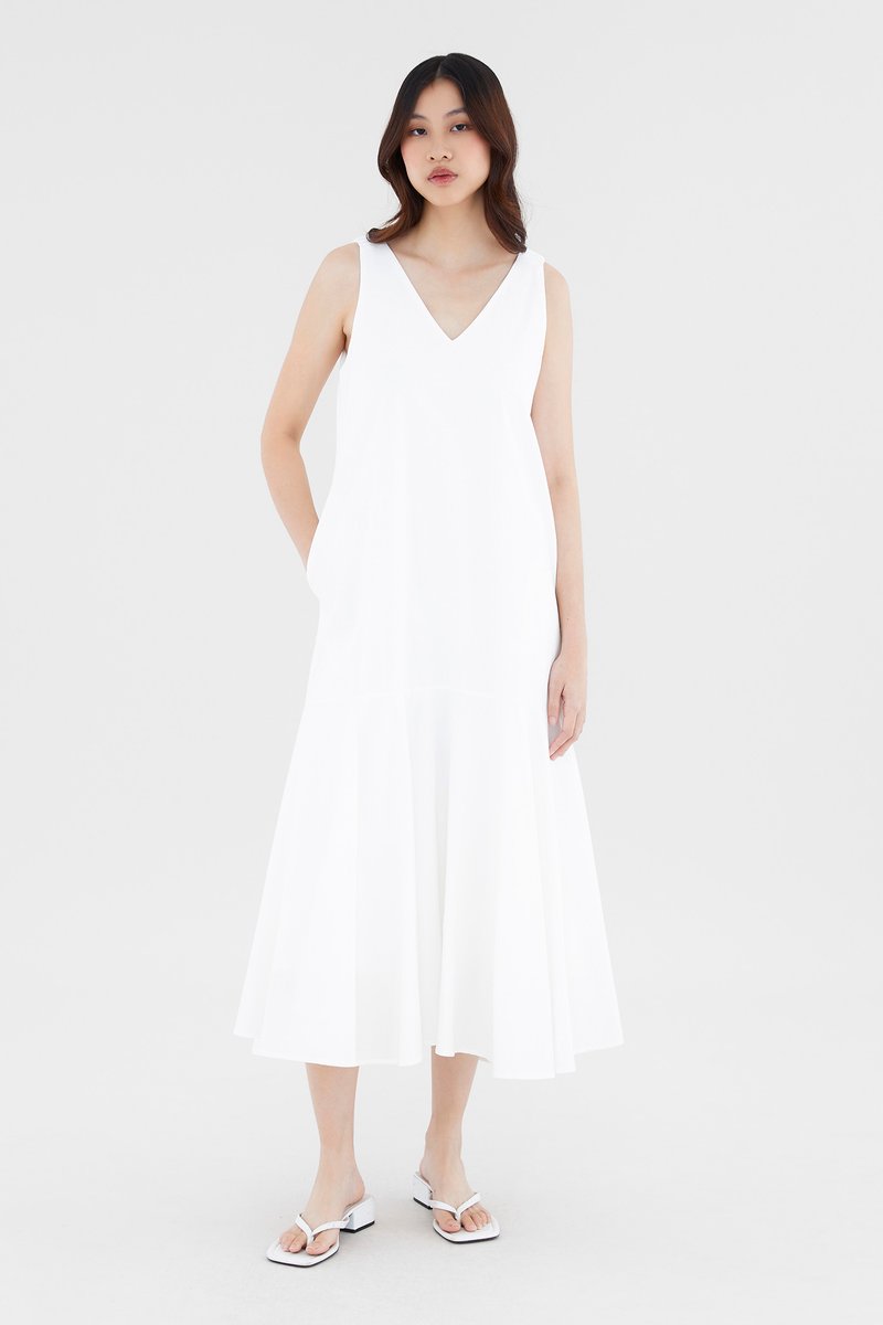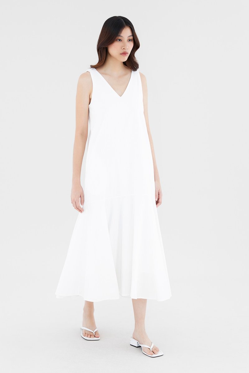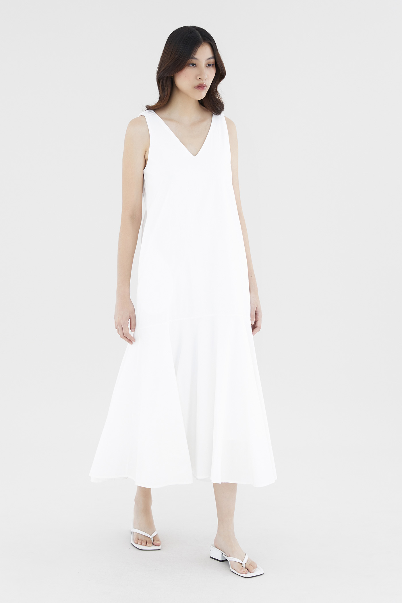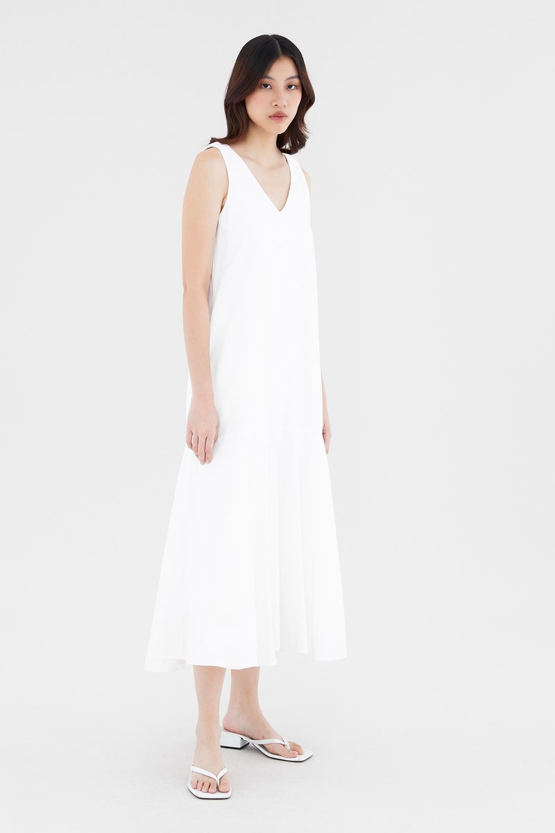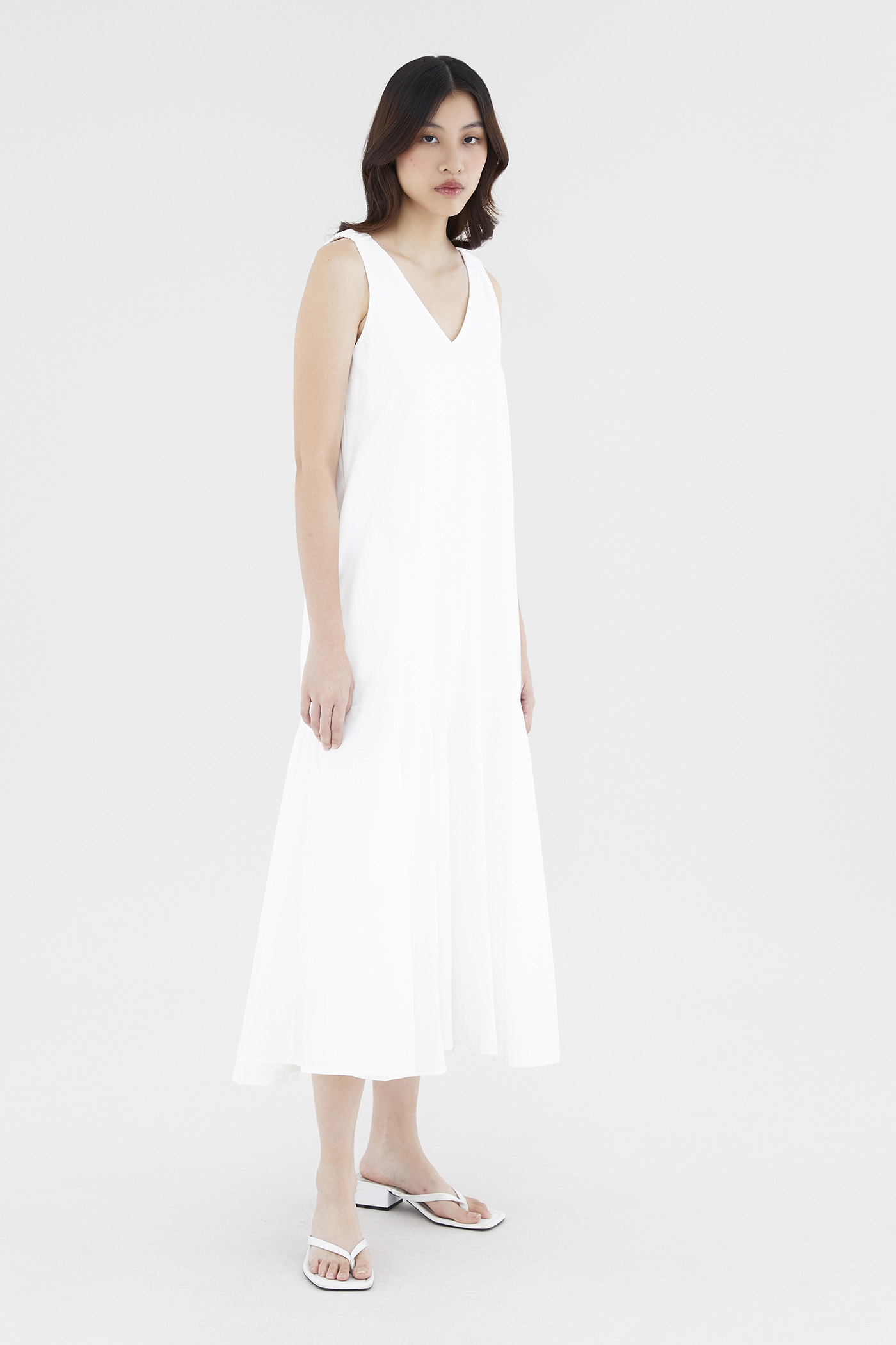 Minimalist silhouette, outstanding details. Made from smooth and non-stretch fabric, this V-neck maxi dress flaunts a structured drape, elasticated ruched shoulder straps and a tiered, drop-waist silhouette. Worn in a relaxed fit with a zip closure on the back.
