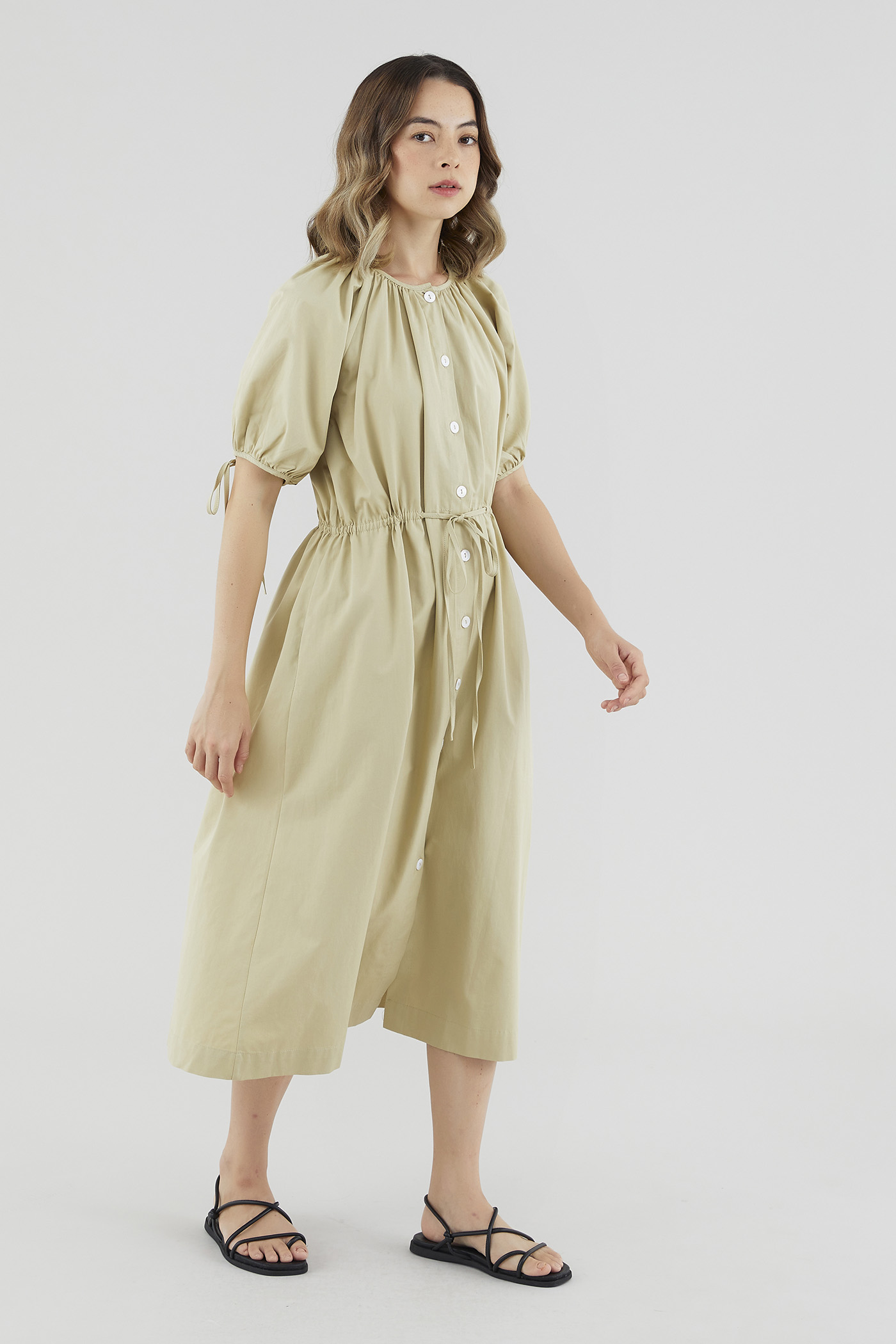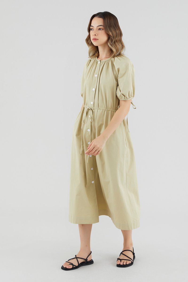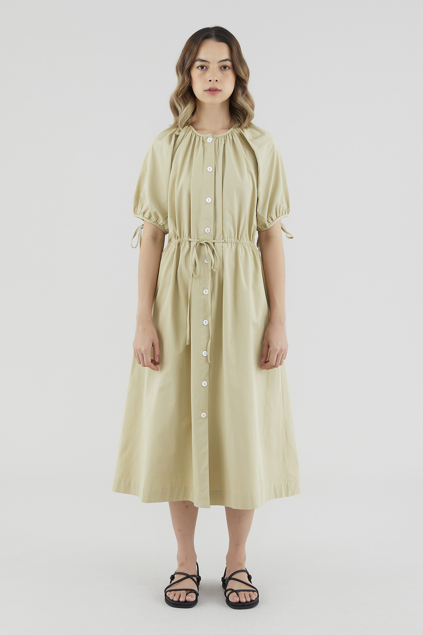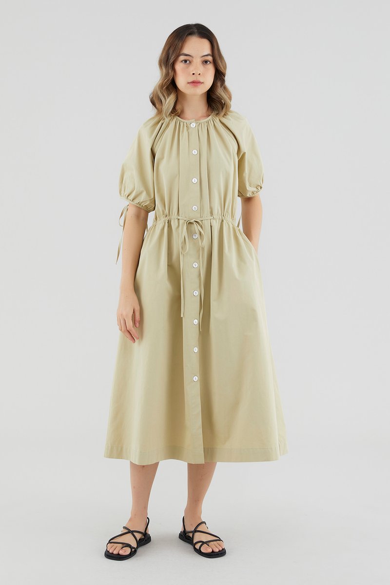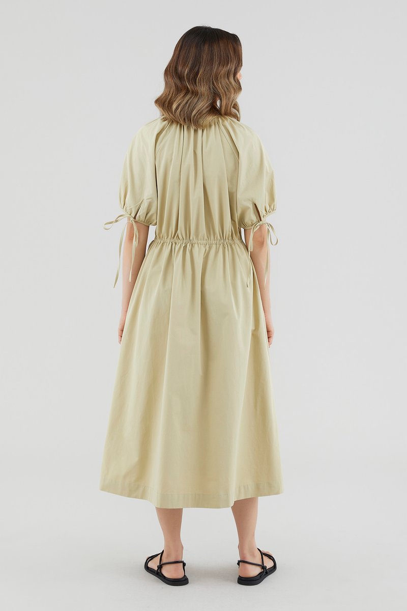 Your new brunch-to-boardroom favourite. Cut from crisp cotton with a structured drape, this maxi dress features a round and ruched neckline, short puffed sleeves with tie straps, an adjustable drawstring waist and a front button-down closure. Worn in a relaxed fit.