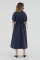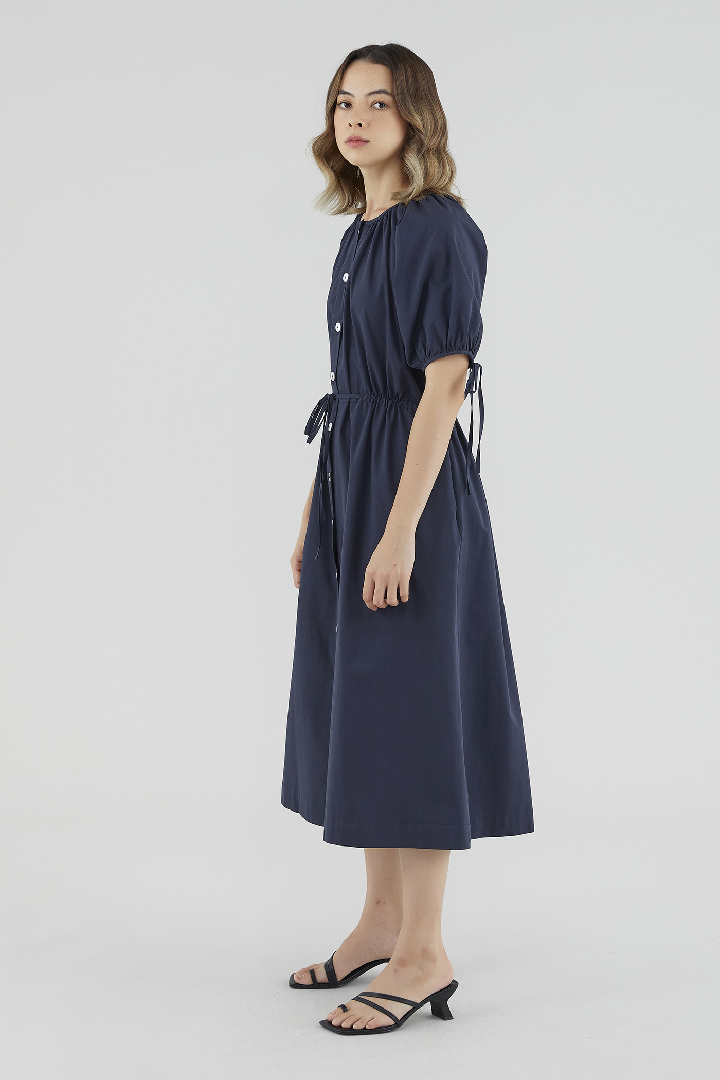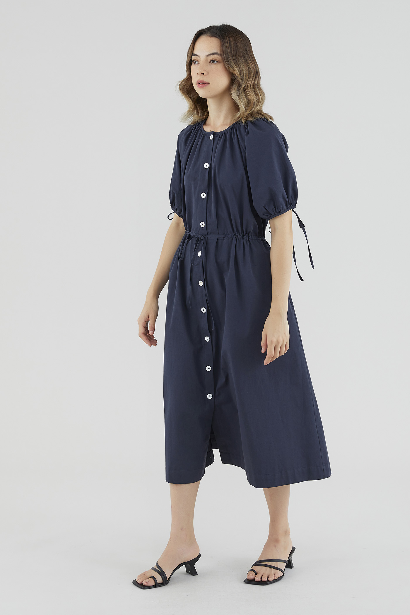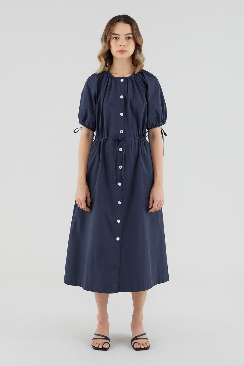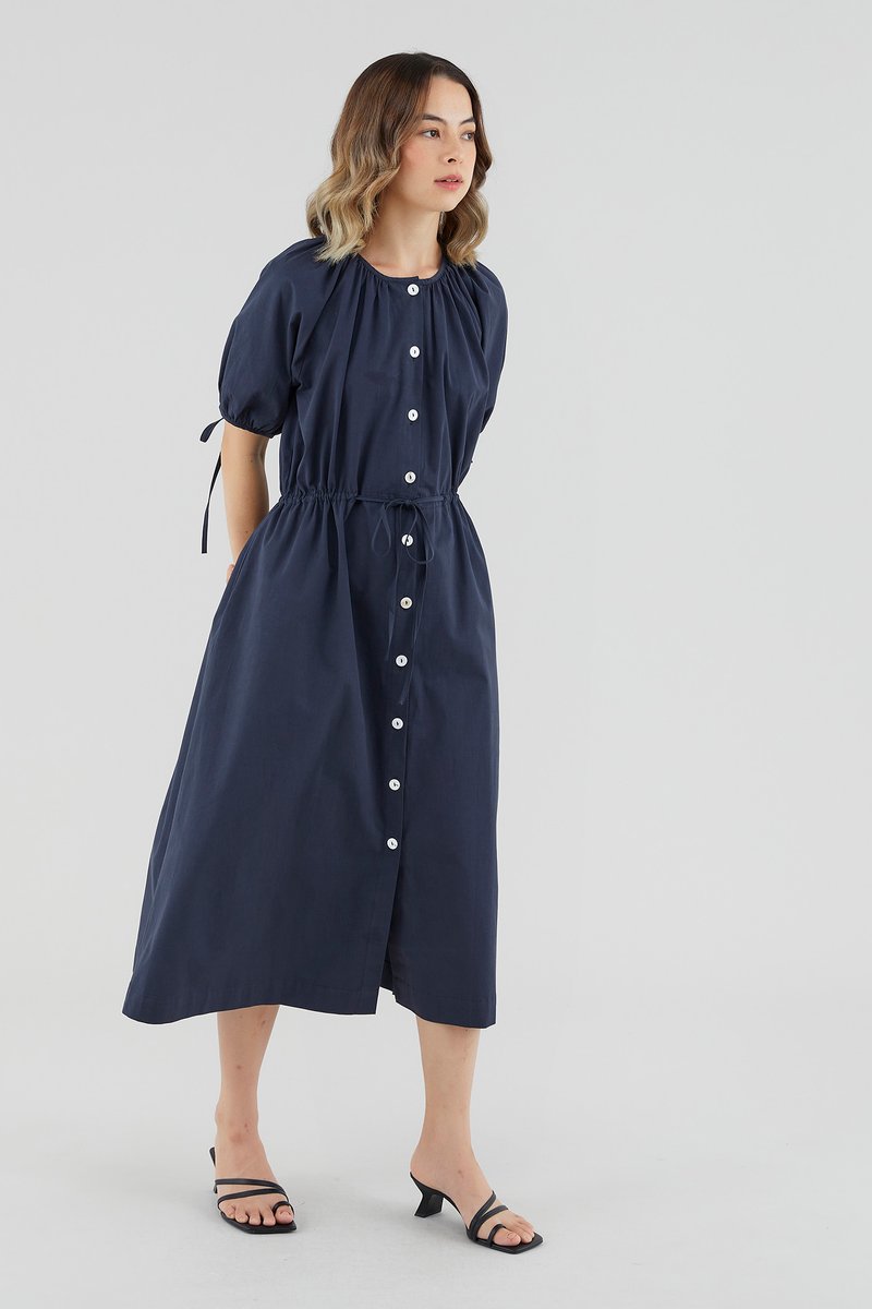 Your new brunch-to-boardroom favourite. Cut from crisp cotton with a structured drape, this maxi dress features a round and ruched neckline, short puffed sleeves with tie straps, an adjustable drawstring waist and a front button-down closure. Worn in a relaxed fit.