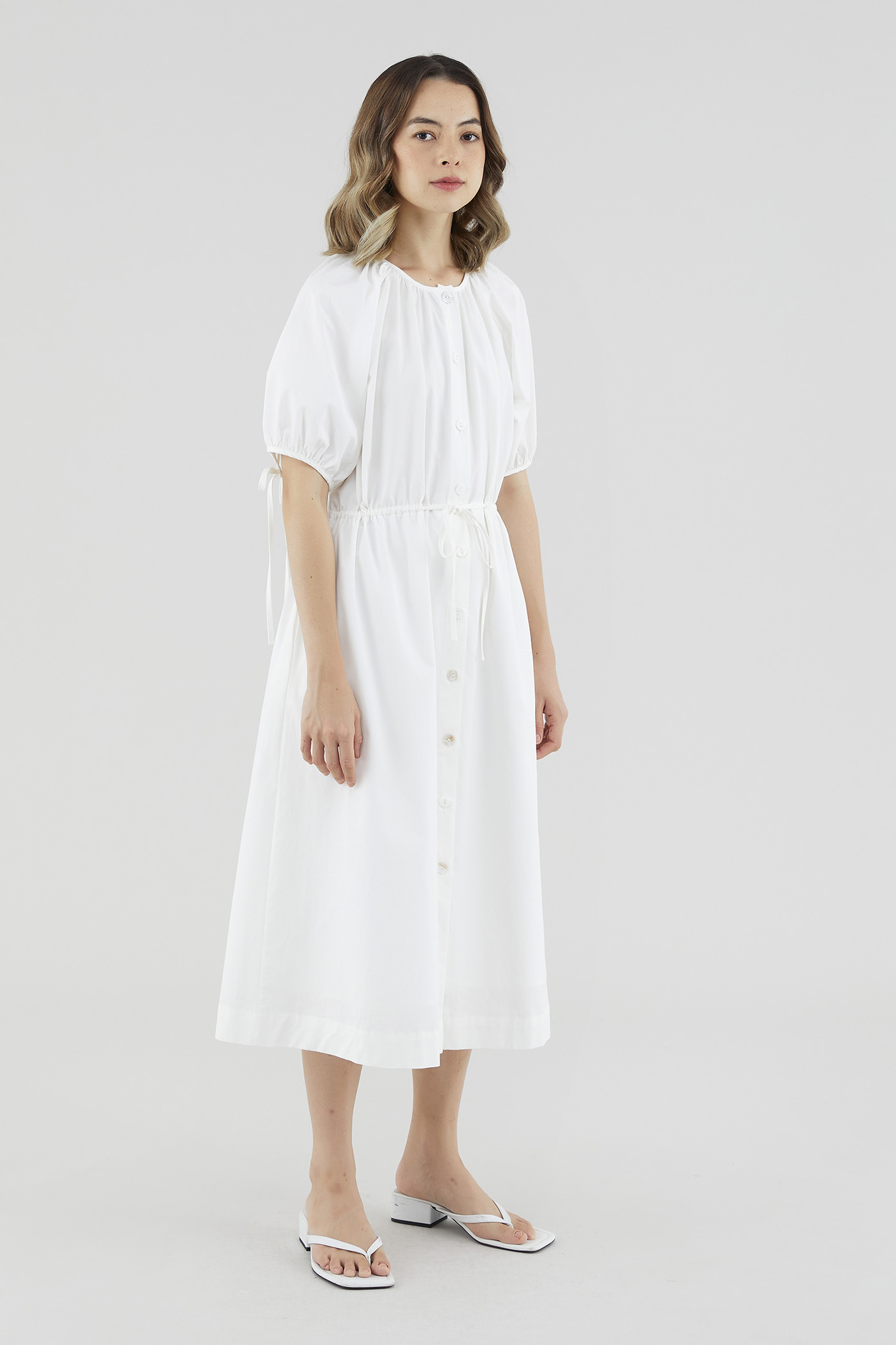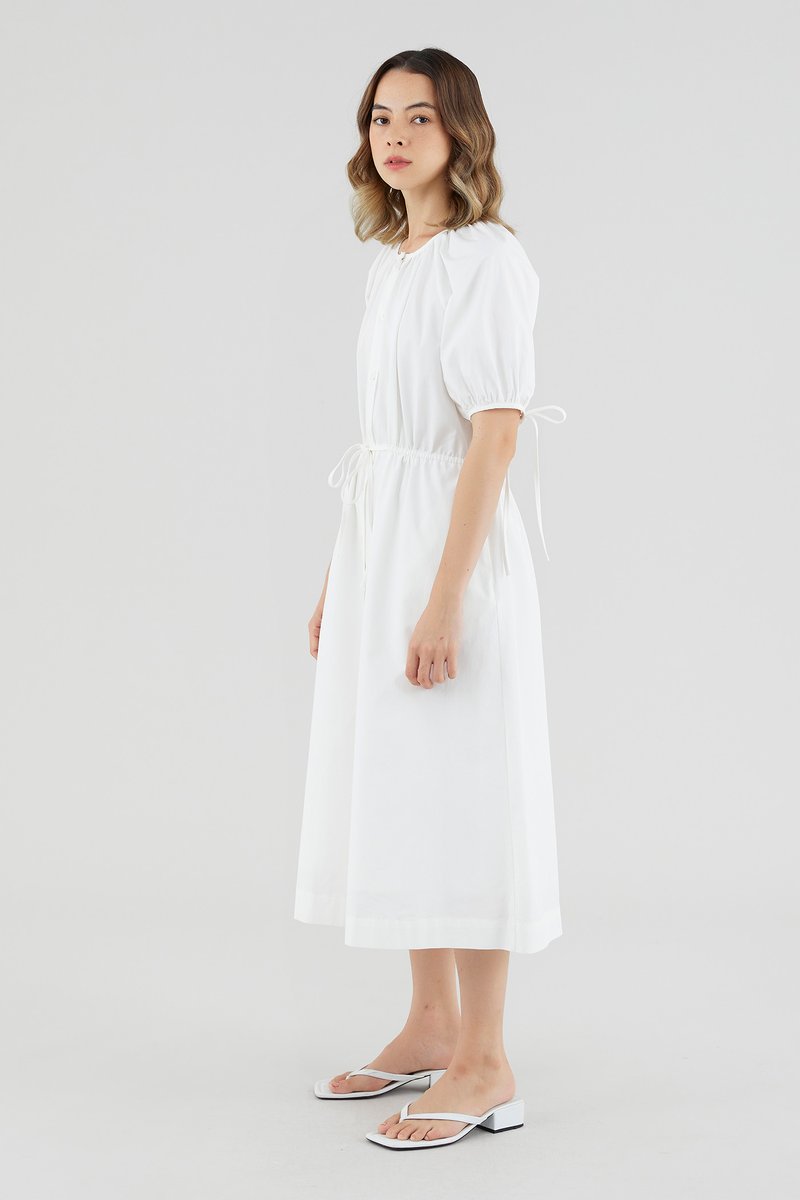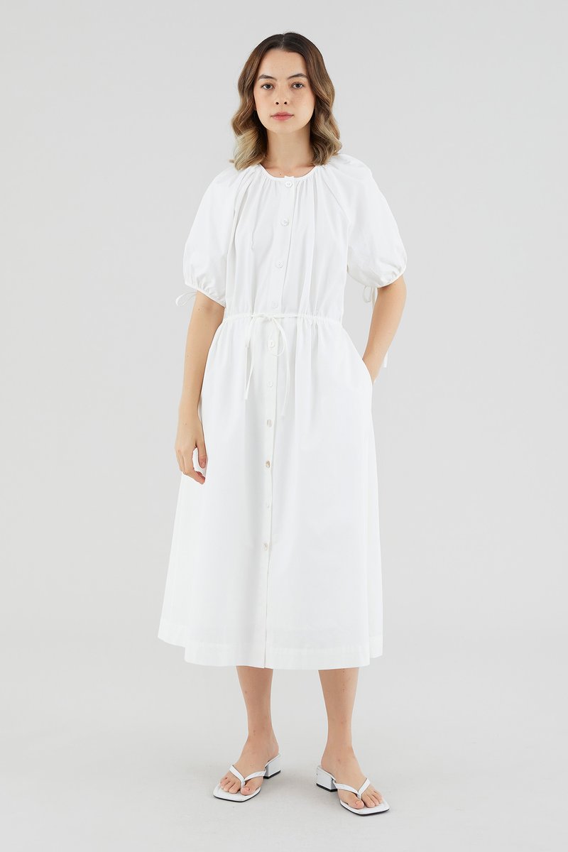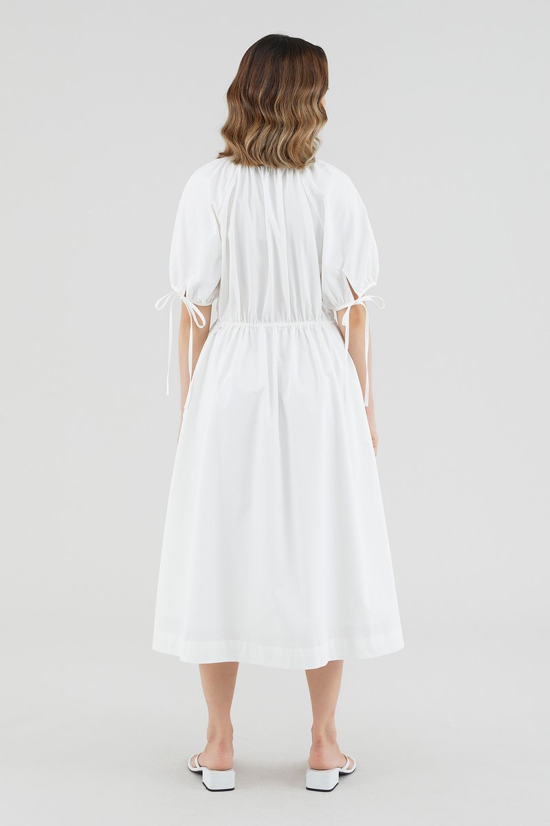 Your new brunch-to-boardroom favourite. Cut from crisp cotton with a structured drape, this maxi dress features a round and ruched neckline, short puffed sleeves with tie straps, an adjustable drawstring waist and a front button-down closure. Worn in a relaxed fit.
