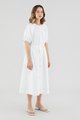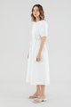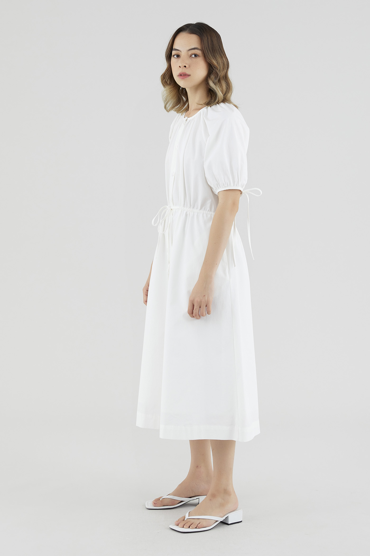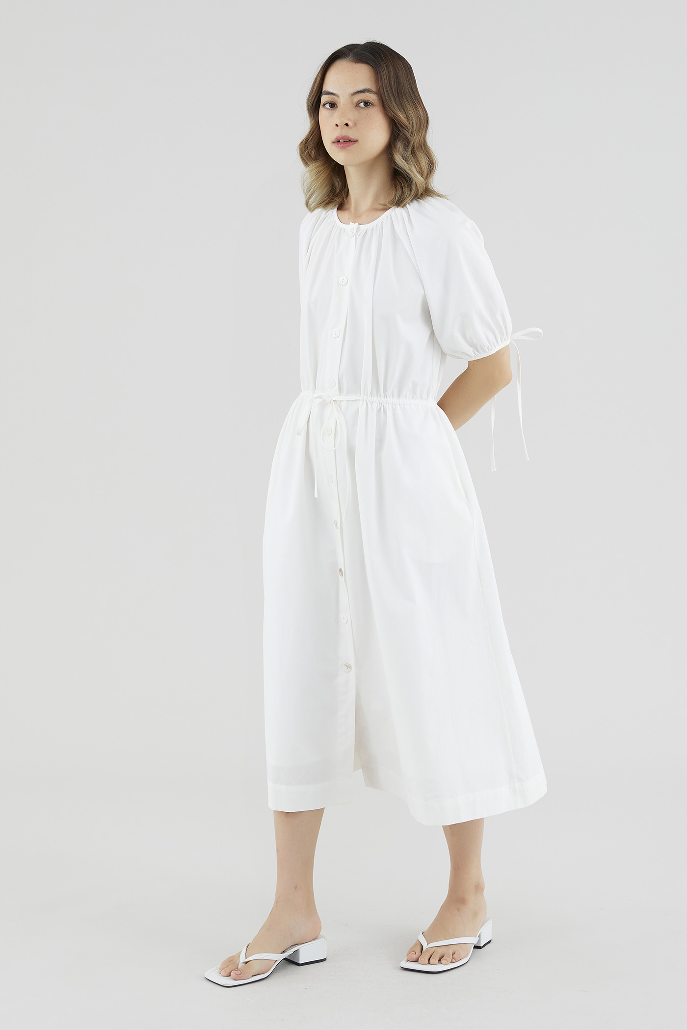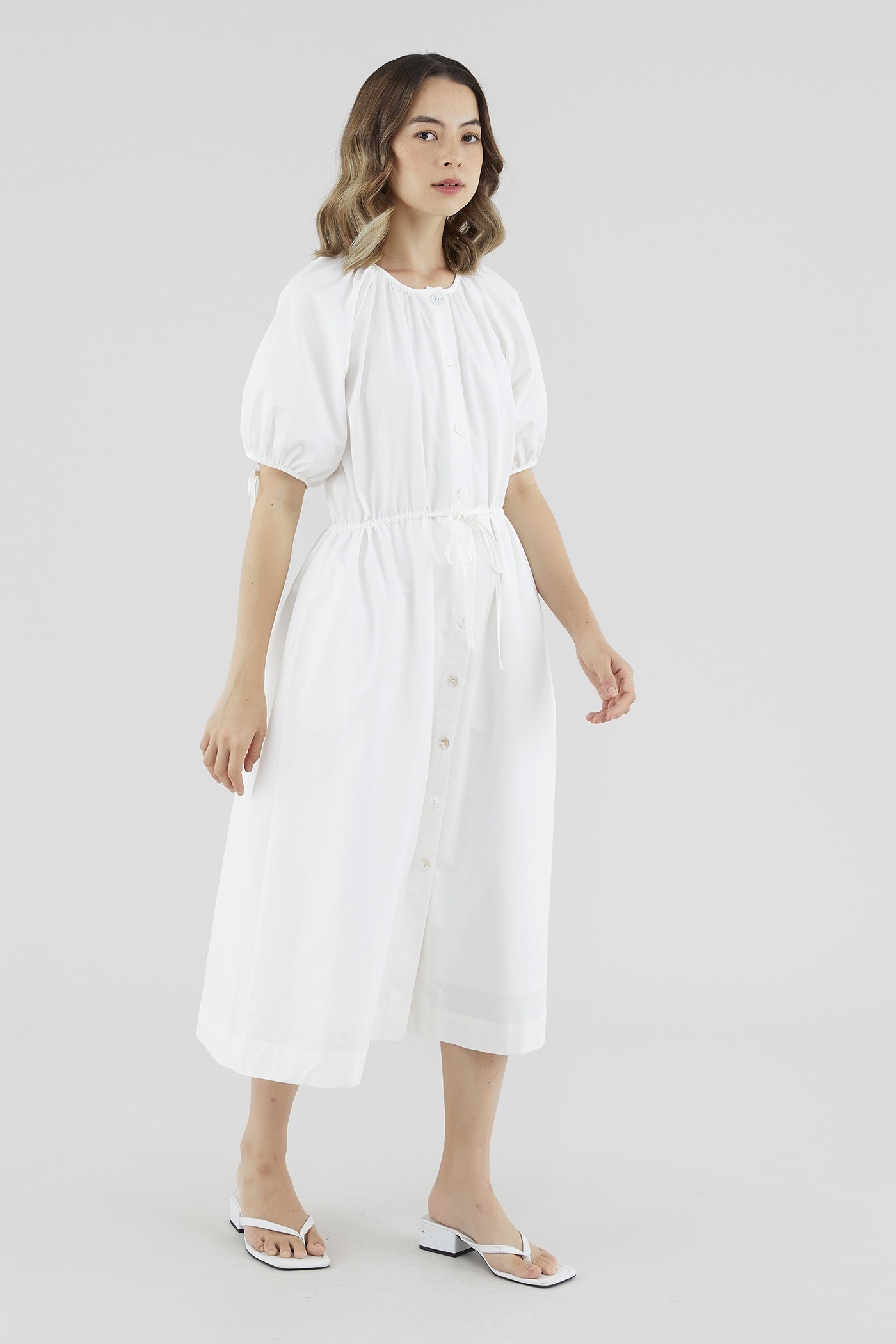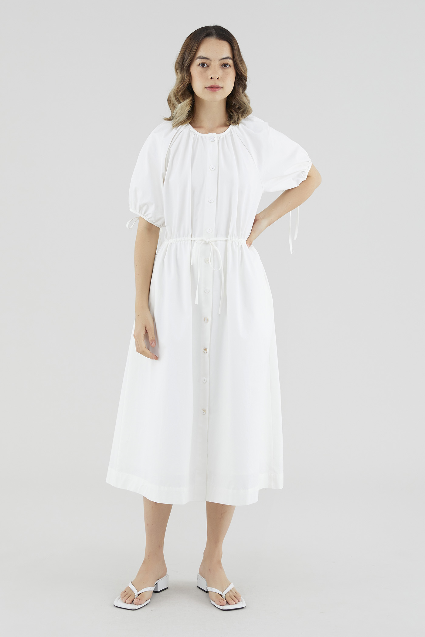 Your new brunch-to-boardroom favourite. Cut from crisp cotton with a structured drape, this maxi dress features a round and ruched neckline, short puffed sleeves with tie straps, an adjustable drawstring waist and a front button-down closure. Worn in a relaxed fit.