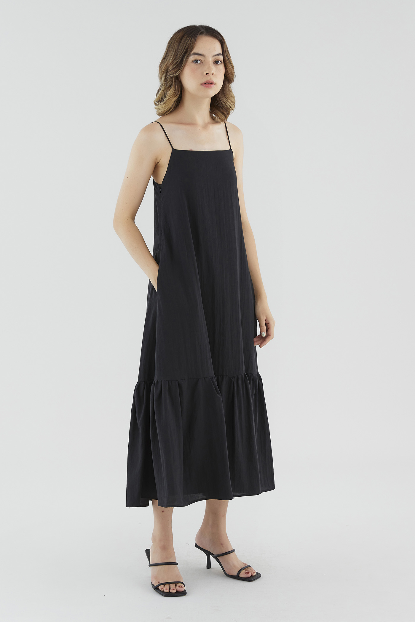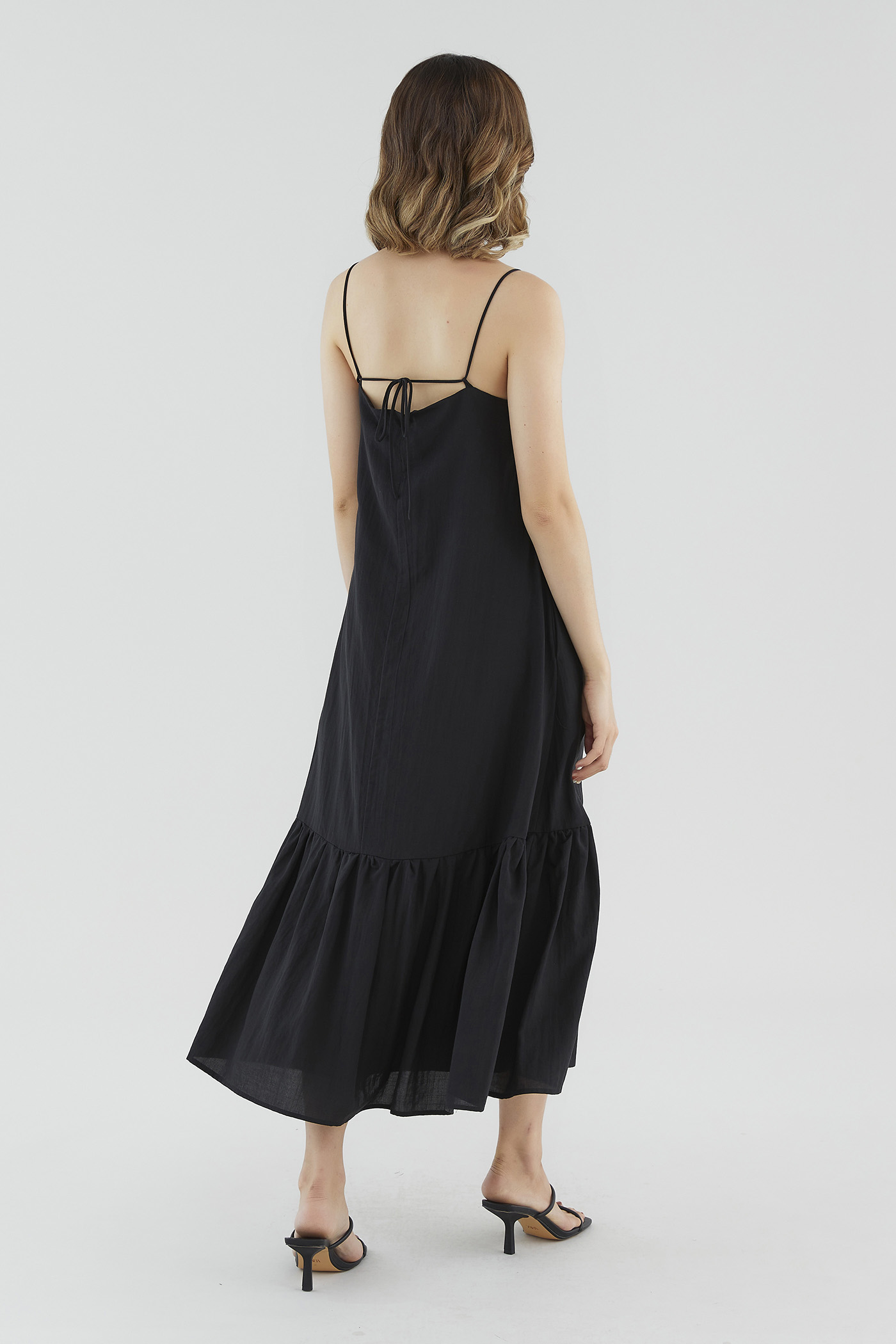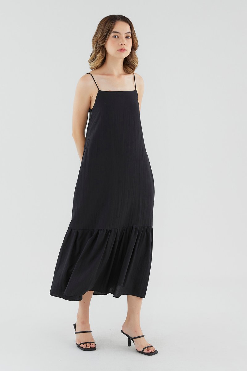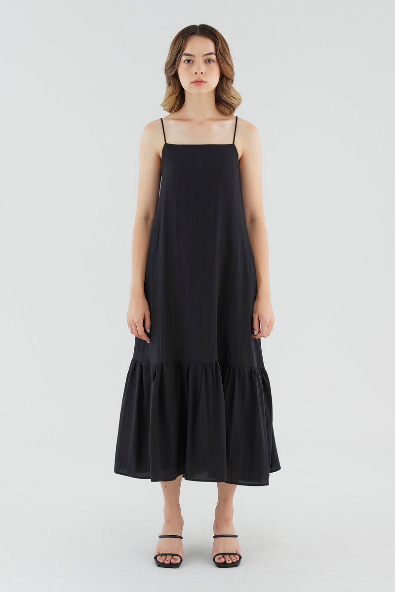 <p><span style="font-weight: 400;">Fabric Composition: 65% Lyocell 25% Viscose 10% Voile</span></p> <p><span style="font-weight: 400;">Lining: Full</span></p> <p><span style="font-weight: 400;">Sheerness: None </span></p> <p><span style="font-weight: 400;">Pockets: Two pockets on the side</span></p> <p><span style="font-weight: 400;">Go with the flow. Made from smooth and drapey fabric, this sleeveless maxi dress features a straight neckline, slim straps with a self-tie closure at the back, a side zip and a drop-tier hemline. Fits relaxed in a waistless tent silhouette. </span></p> <p><span style="font-weight: 400;">Care Instructions: Do not soak / Do not bleach / Handwash or Machine wash on gentle mode / Do not machine dry / Iron using low heat</span></p>