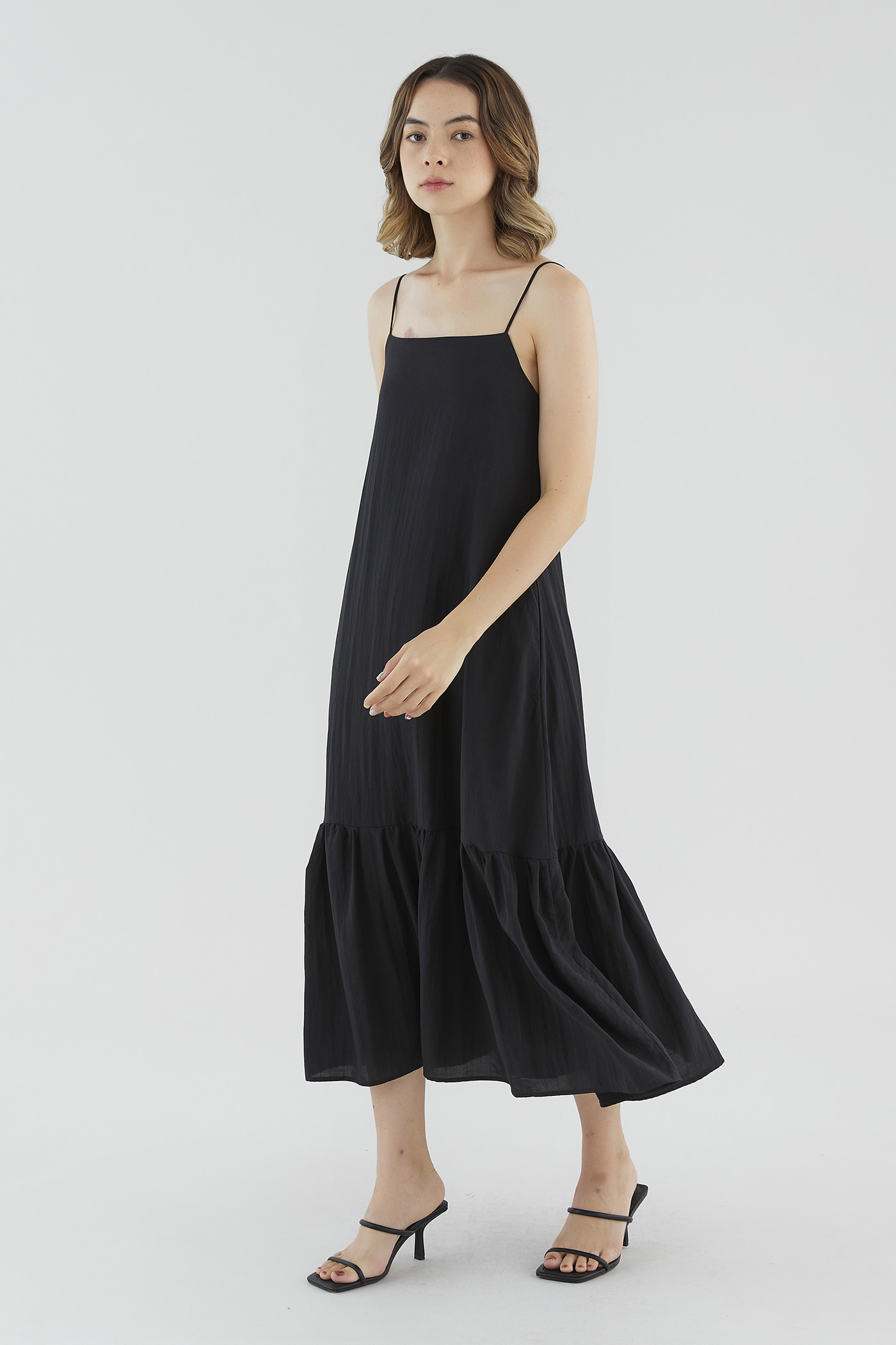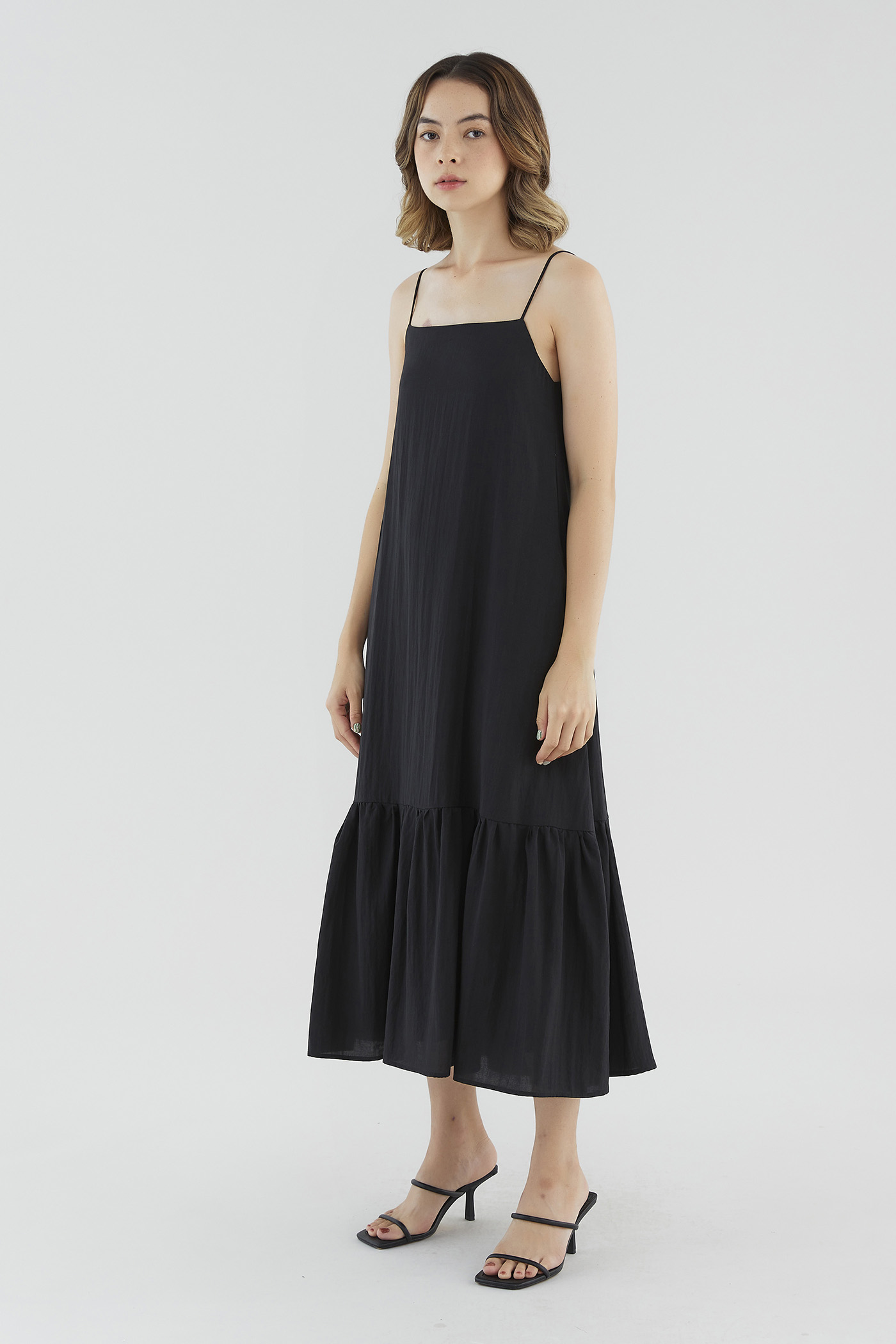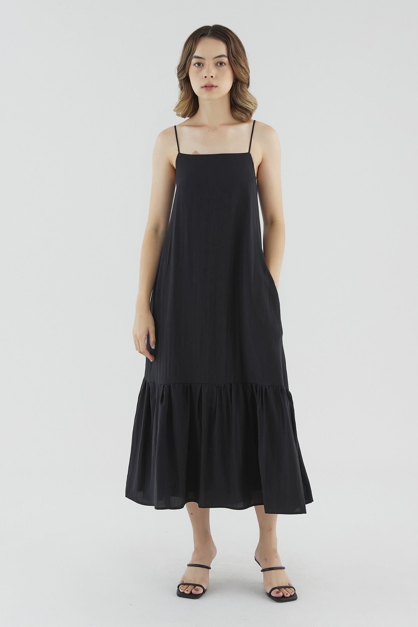 <p><span style="font-weight: 400;">Fabric Composition: 65% Lyocell 25% Viscose 10% Voile</span></p> <p><span style="font-weight: 400;">Lining: Full</span></p> <p><span style="font-weight: 400;">Sheerness: None </span></p> <p><span style="font-weight: 400;">Pockets: Two pockets on the side</span></p> <p><span style="font-weight: 400;">Go with the flow. Made from smooth and drapey fabric, this sleeveless maxi dress features a straight neckline, slim straps with a self-tie closure at the back, a side zip and a drop-tier hemline. Fits relaxed in a waistless tent silhouette. </span></p> <p><span style="font-weight: 400;">Care Instructions: Do not soak / Do not bleach / Handwash or Machine wash on gentle mode / Do not machine dry / Iron using low heat</span></p>