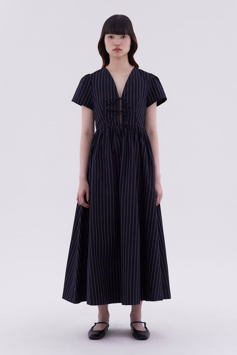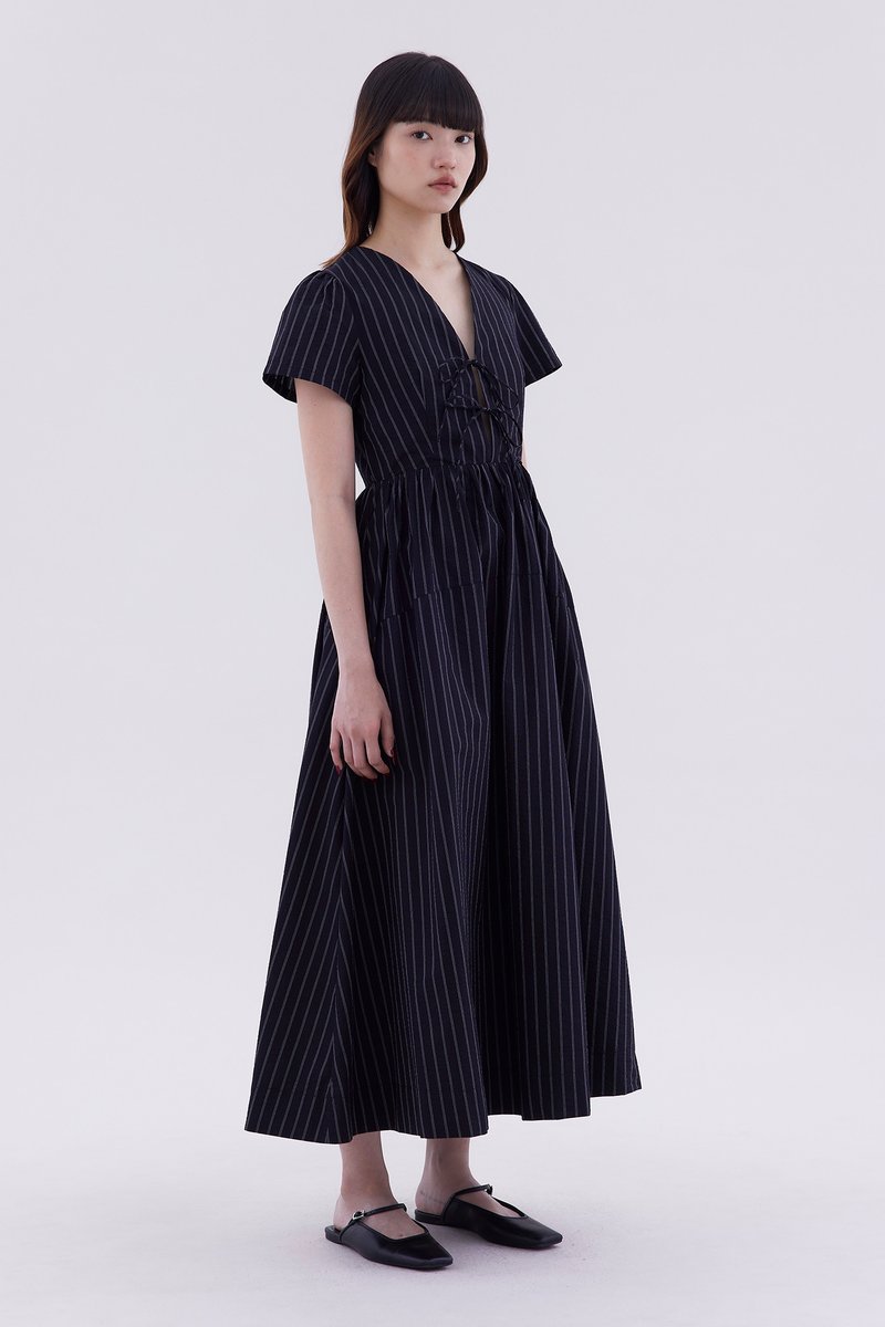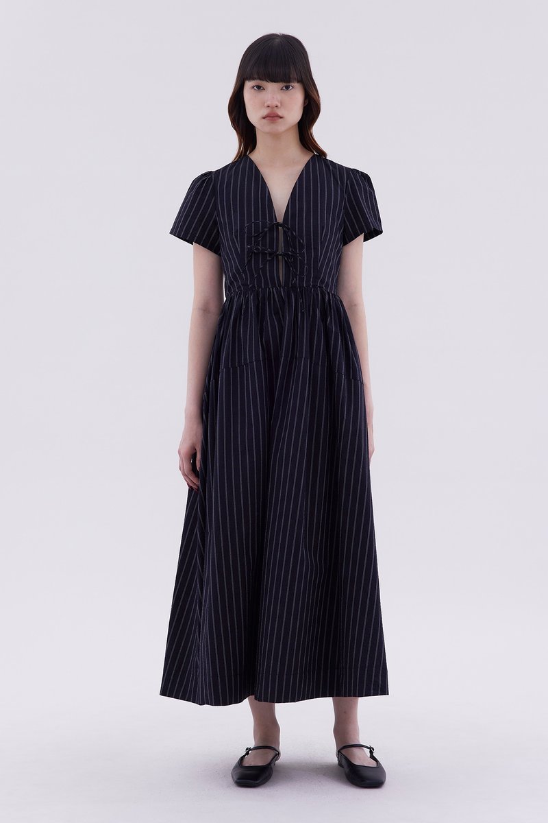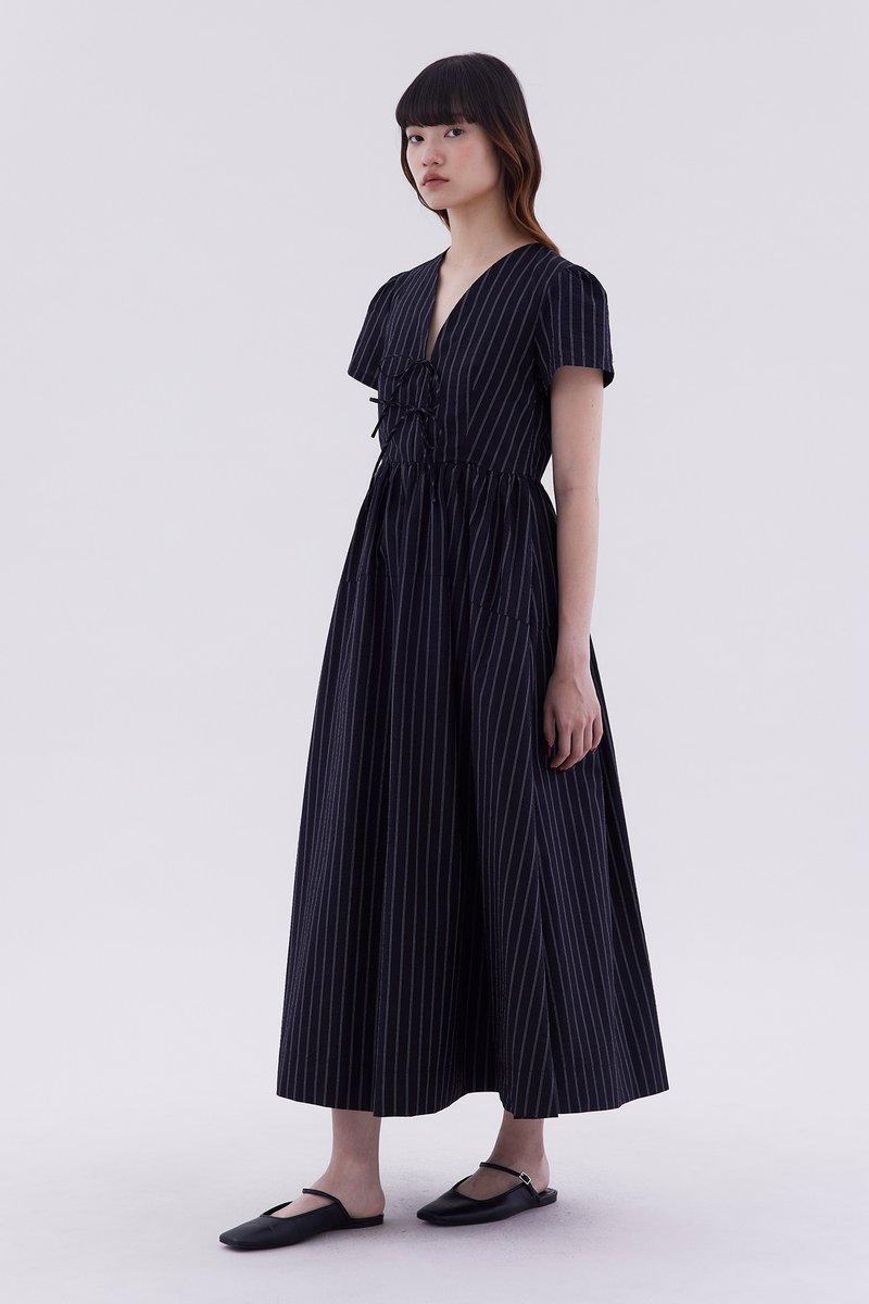 Earn your stripes. Made from crisp and softly structured cotton, this maxi dress features short sleeves, a plunging V-neckline with double tie-straps and a side zip closure. Worn in a slim fit.