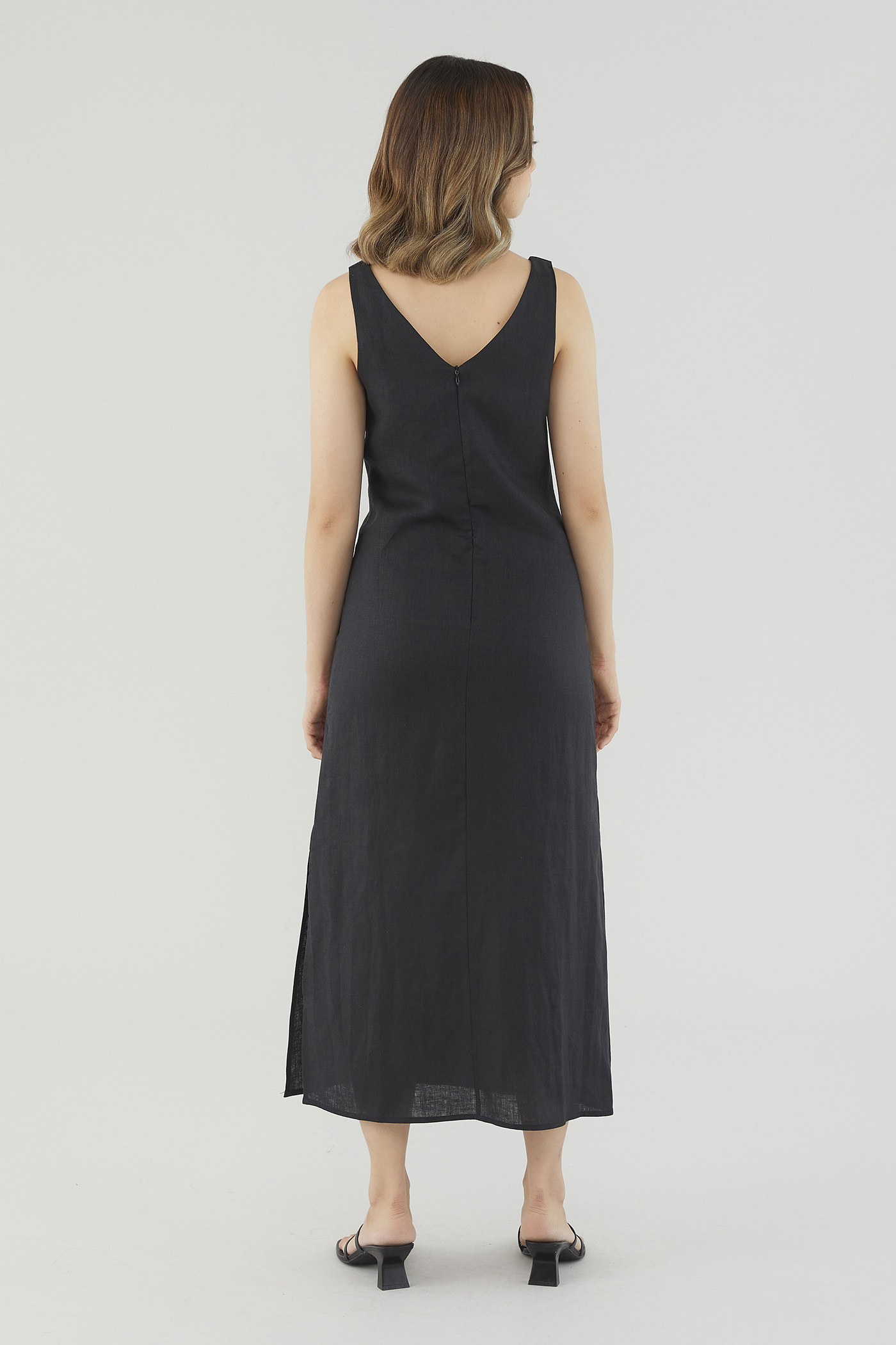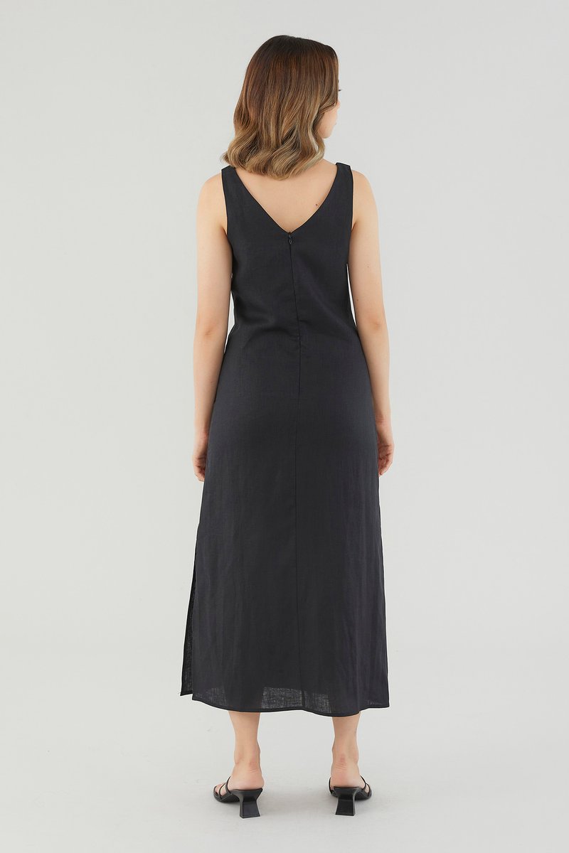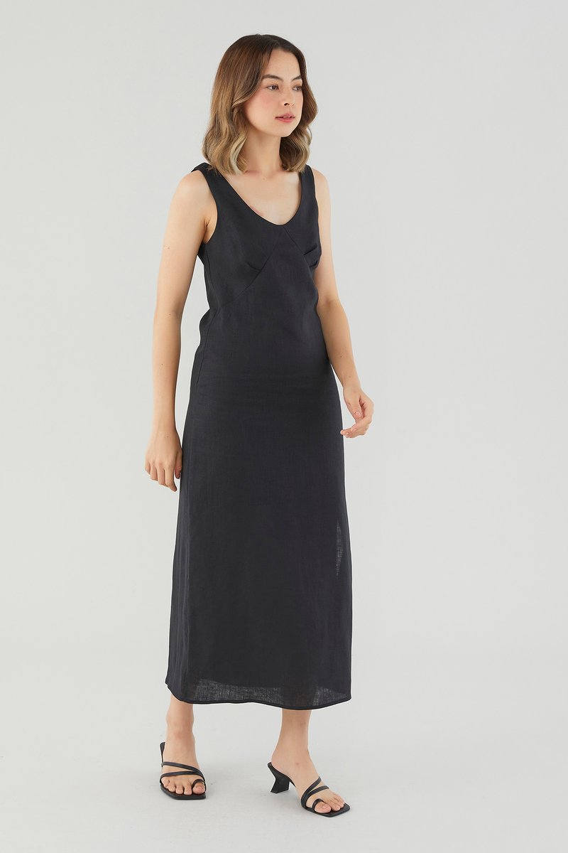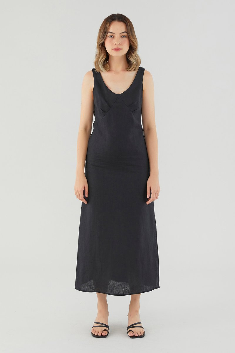<p><span style="font-weight: 400;">Fabric Composition: 100% Linen</span></p> <p><span style="font-weight: 400;">Lining: Partial; lining ends above the knee. </span></p> <p><span style="font-weight: 400;">Sheerness: Not sheer</span></p> <p><span style="font-weight: 400;">Pockets: None</span></p> <p><span style="font-weight: 400;">Minimalist-approved. Cut from airy and non-stretch 100% linen, this sleeveless midi dress features a scooped neckline, wide shoulder straps, pleating at the bust and a side skirt split.  Fits relaxed in a column silhouette with a zip closure on the back. </span></p> <p><span style="font-weight: 400;">Care Instructions: Do not soak / Do not bleach / Handwash or Machine wash on gentle mode / Do not machine dry / Iron using low heat</span></p> <p><i><span style="font-weight: 400;">This piece is made from 100% linen, the unsung hero of hot days and one of the least environmentally damaging fabrics. Derived from the unfussy flax plant, not only does its cultivation consume significantly less water, pesticides and arable land — but linen’s excellent durability and biodegradable nature also means your clothes have a longer, more waste-free life cycle.</span></i></p>