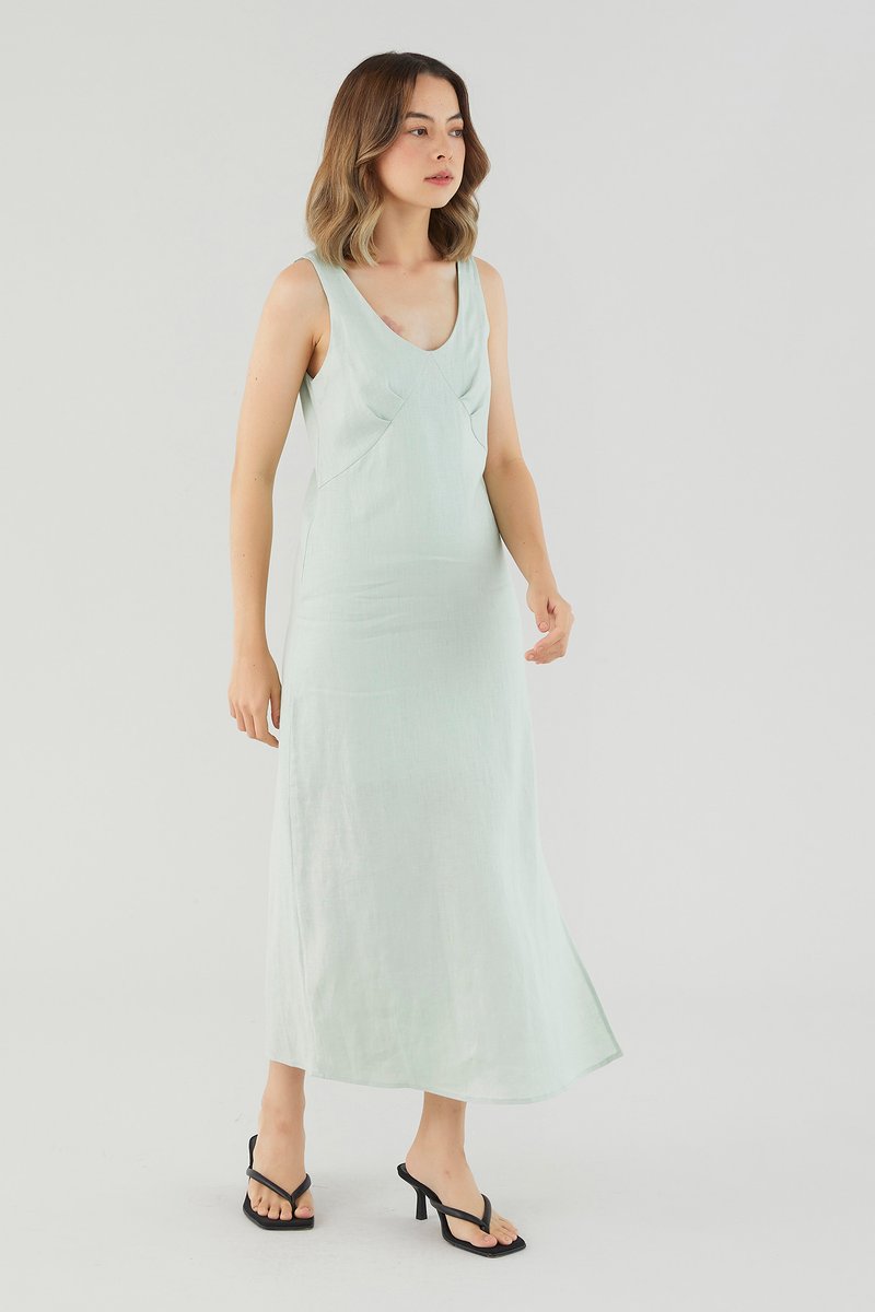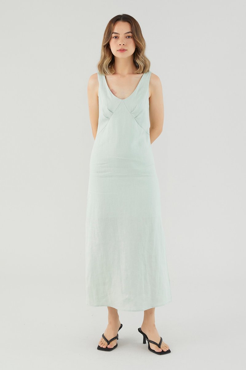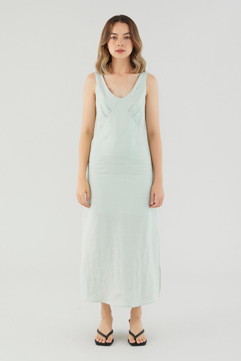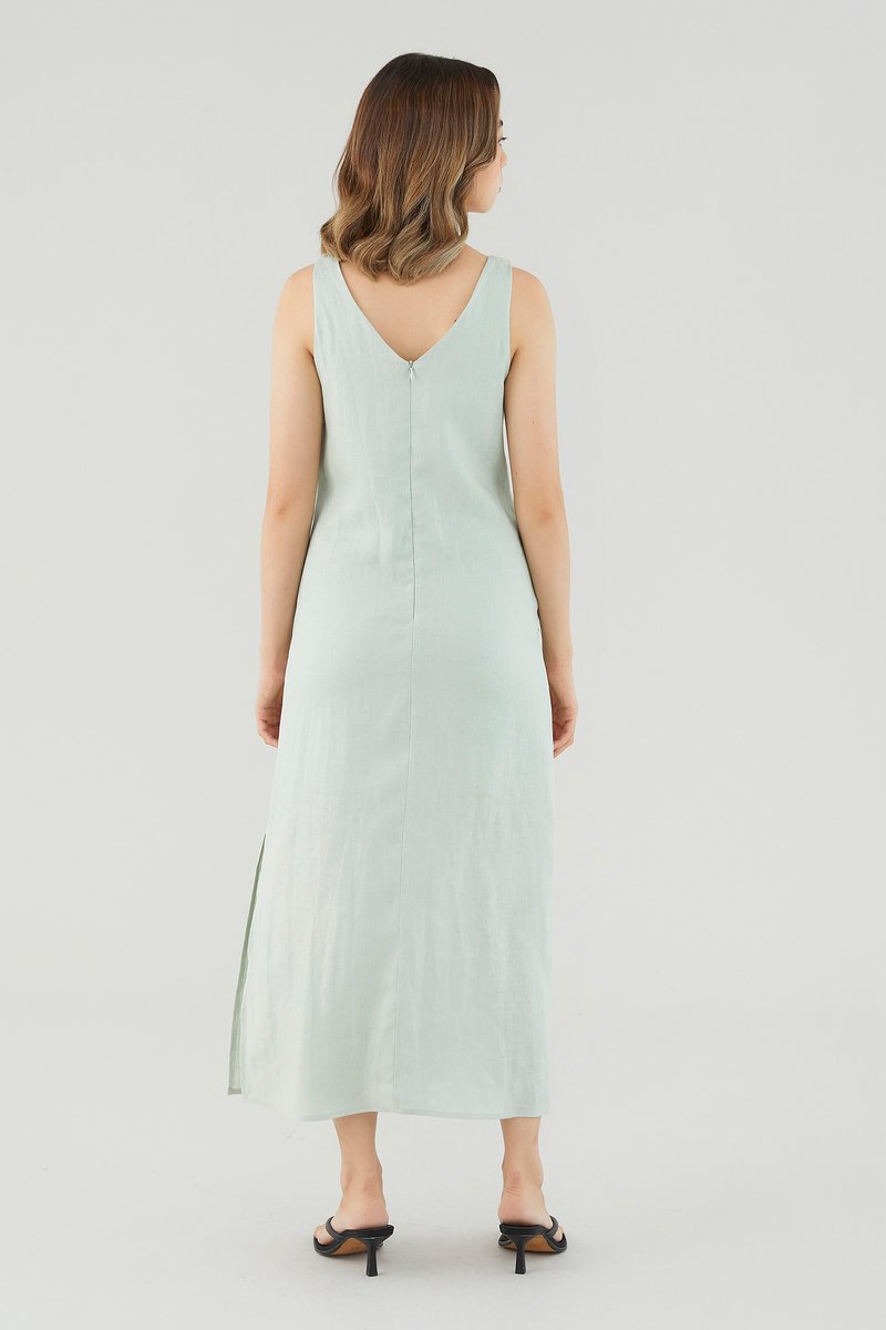 <p><span style="font-weight: 400;">Fabric Composition: 100% Linen</span></p> <p><span style="font-weight: 400;">Lining: Partial; lining ends above the knee. </span></p> <p><span style="font-weight: 400;">Sheerness: Not sheer</span></p> <p><span style="font-weight: 400;">Pockets: None</span></p> <p><span style="font-weight: 400;">Minimalist-approved. Cut from airy and non-stretch 100% linen, this sleeveless midi dress features a scooped neckline, wide shoulder straps, pleating at the bust and a side skirt split. Fits relaxed in a column silhouette with a zip closure on the back. </span></p> <p><span style="font-weight: 400;">Care Instructions: Do not soak / Do not bleach / Handwash or Machine wash on gentle mode / Do not machine dry / Iron using low heat</span></p> <p><i><span style="font-weight: 400;">This piece is made from 100% linen, the unsung hero of hot days and one of the least environmentally damaging fabrics. Derived from the unfussy flax plant, not only does its cultivation consume significantly less water, pesticides and arable land — but linen’s excellent durability and biodegradable nature also means your clothes have a longer, more waste-free life cycle.</span></i></p>