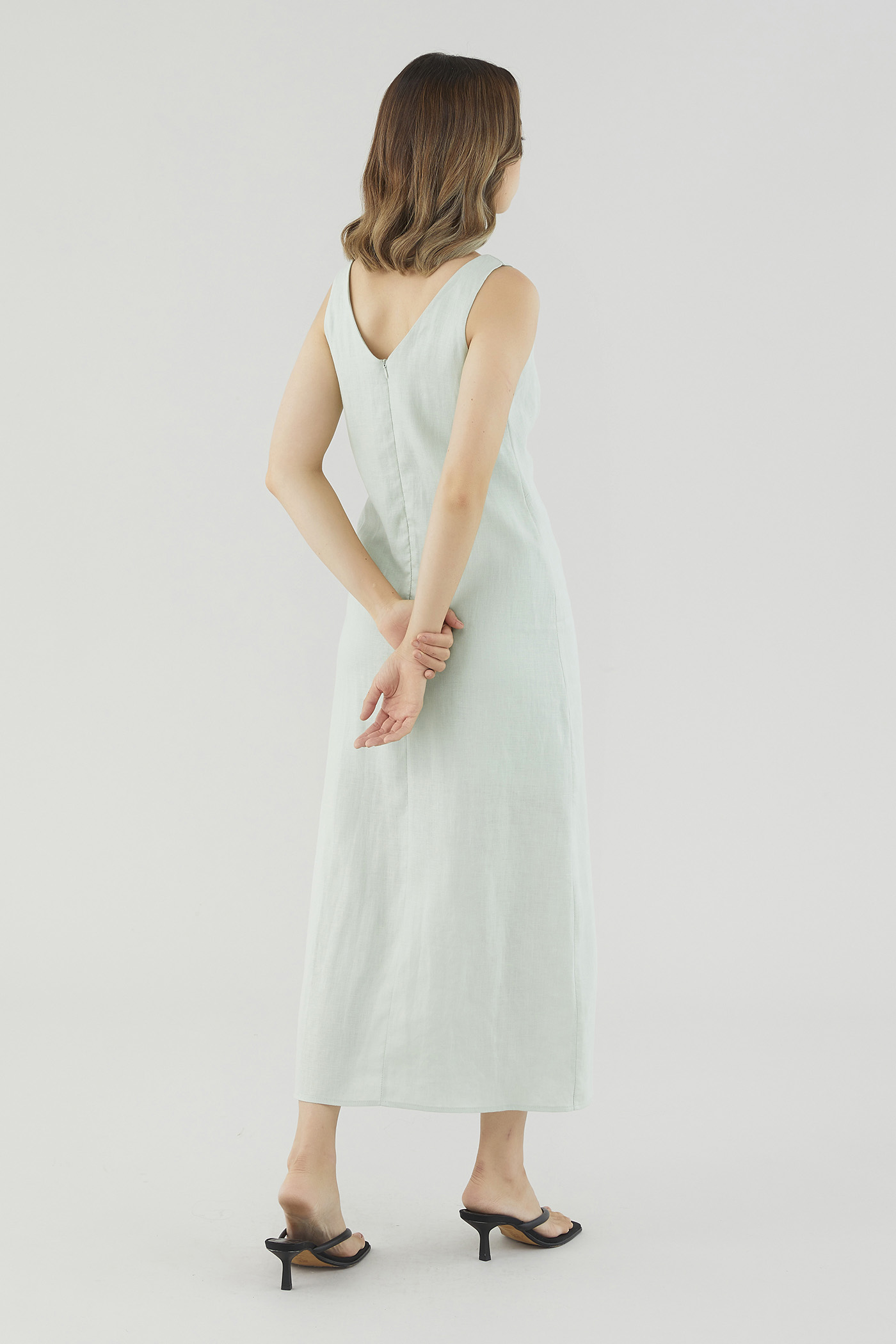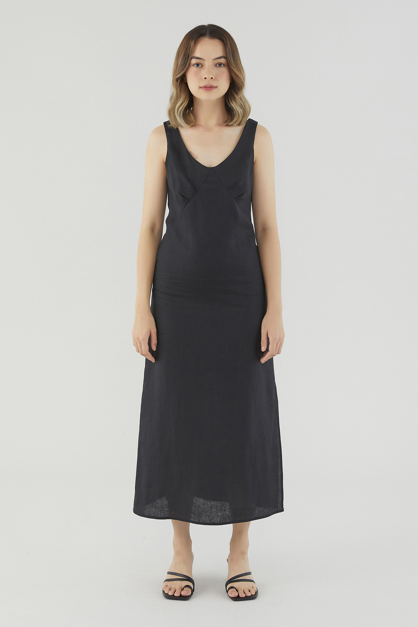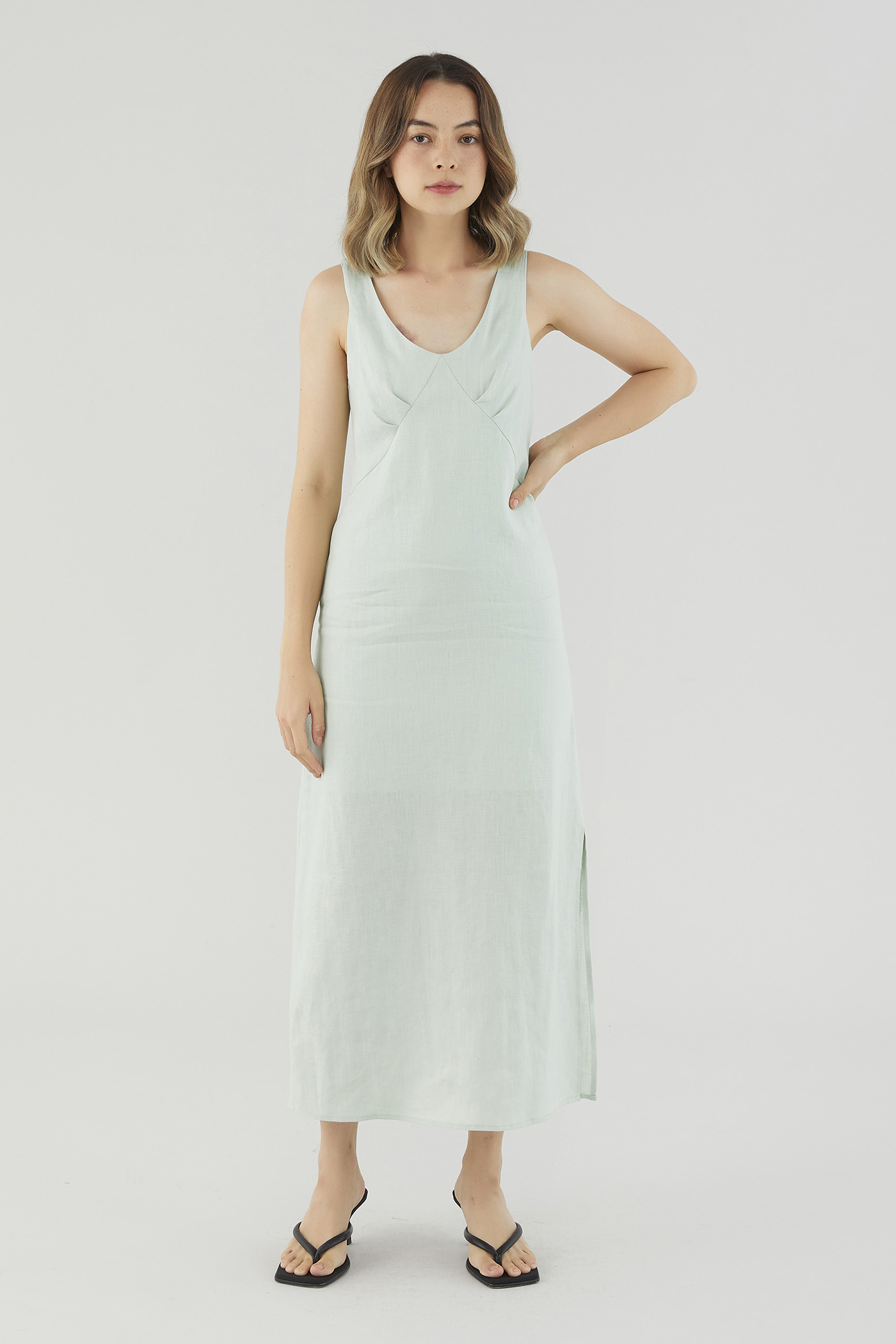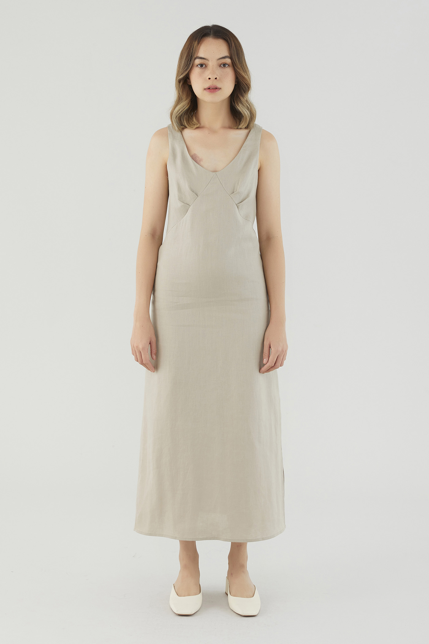 <p><span style="font-weight: 400;">Fabric Composition: 100% Linen</span></p> <p><span style="font-weight: 400;">Lining: Partial; lining ends above the knee. </span></p> <p><span style="font-weight: 400;">Sheerness: Not sheer</span></p> <p><span style="font-weight: 400;">Pockets: None</span></p> <p><span style="font-weight: 400;">Minimalist-approved. Cut from airy and non-stretch 100% linen, this sleeveless midi dress features a scooped neckline, wide shoulder straps, pleating at the bust and a side skirt split. Fits relaxed in a column silhouette with a zip closure on the back. </span></p> <p><span style="font-weight: 400;">Care Instructions: Do not soak / Do not bleach / Handwash or Machine wash on gentle mode / Do not machine dry / Iron using low heat</span></p> <p><i><span style="font-weight: 400;">This piece is made from 100% linen, the unsung hero of hot days and one of the least environmentally damaging fabrics. Derived from the unfussy flax plant, not only does its cultivation consume significantly less water, pesticides and arable land — but linen’s excellent durability and biodegradable nature also means your clothes have a longer, more waste-free life cycle.</span></i></p>