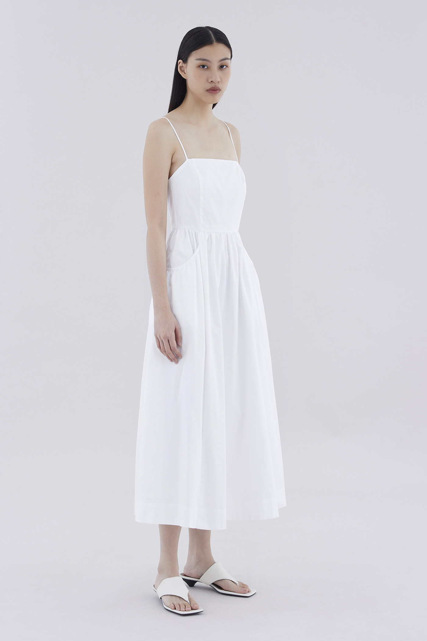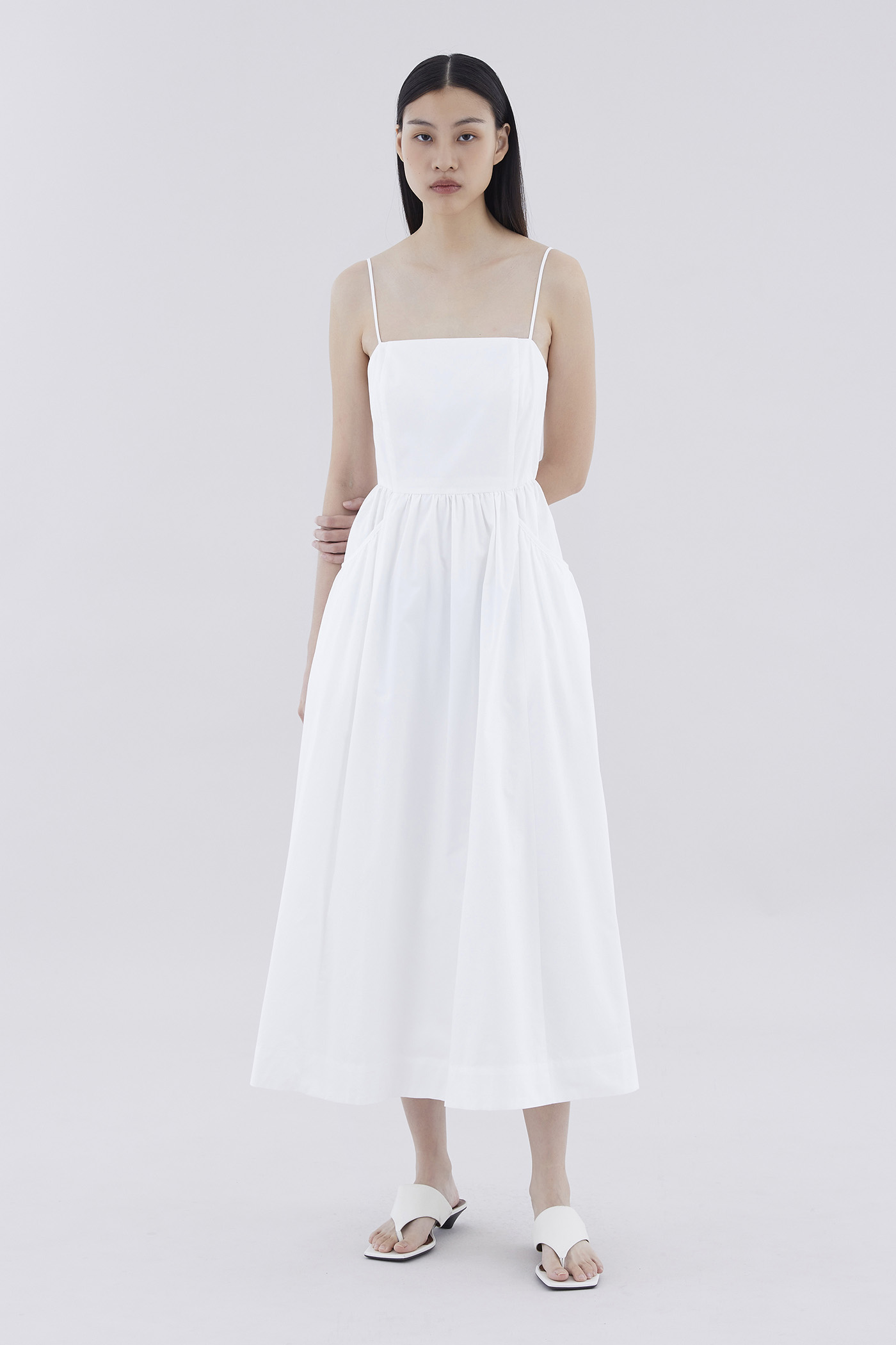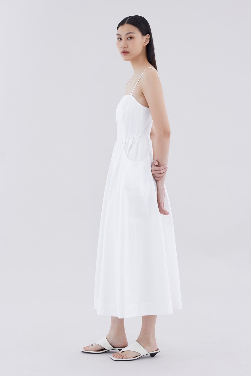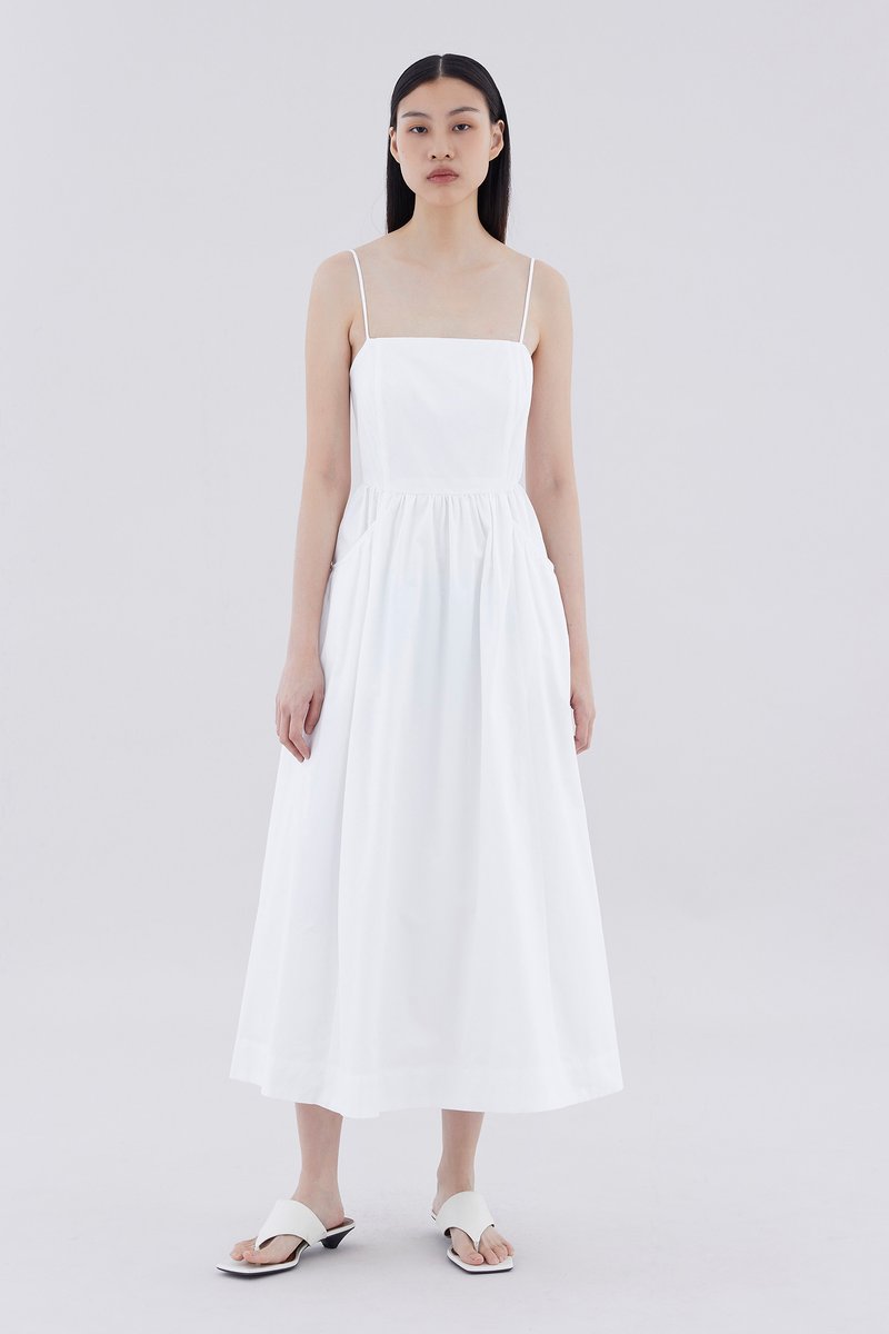 Comes with pockets. Made from crisp and softly structured cotton, this sleeveless maxi dress features slim adjustable shoulder straps, a square neckline, a back zip closure and oversized side pockets. Worn in an A-line silhouette that fits slimmer at the waist before flaring out in a relaxed skirt.