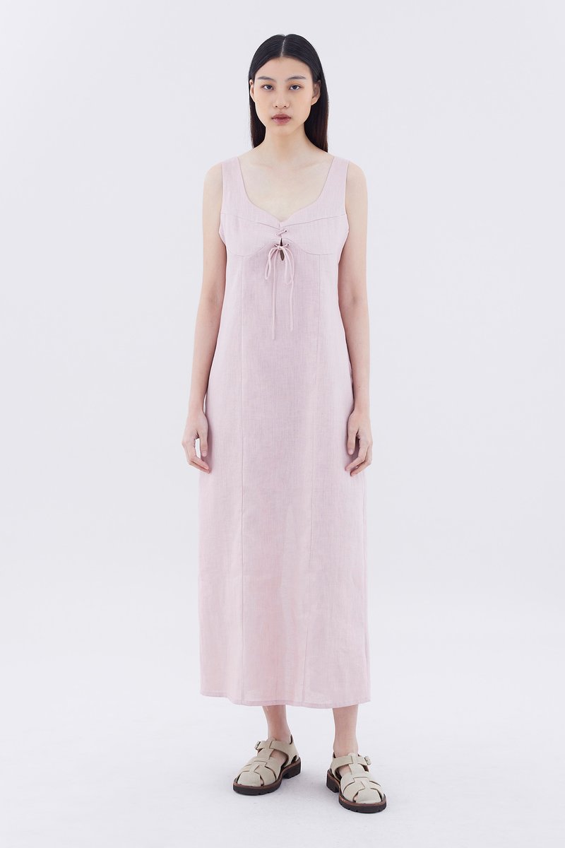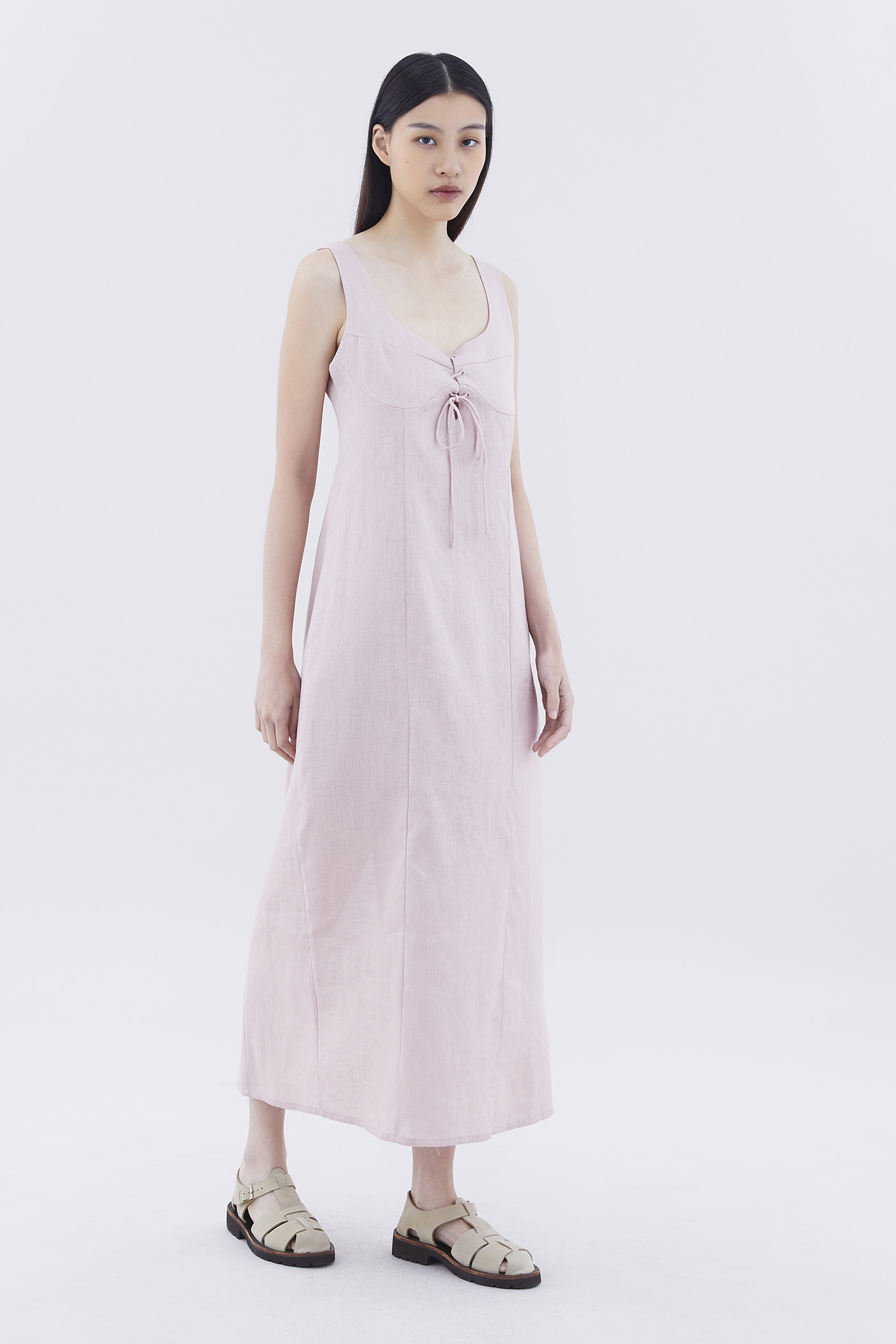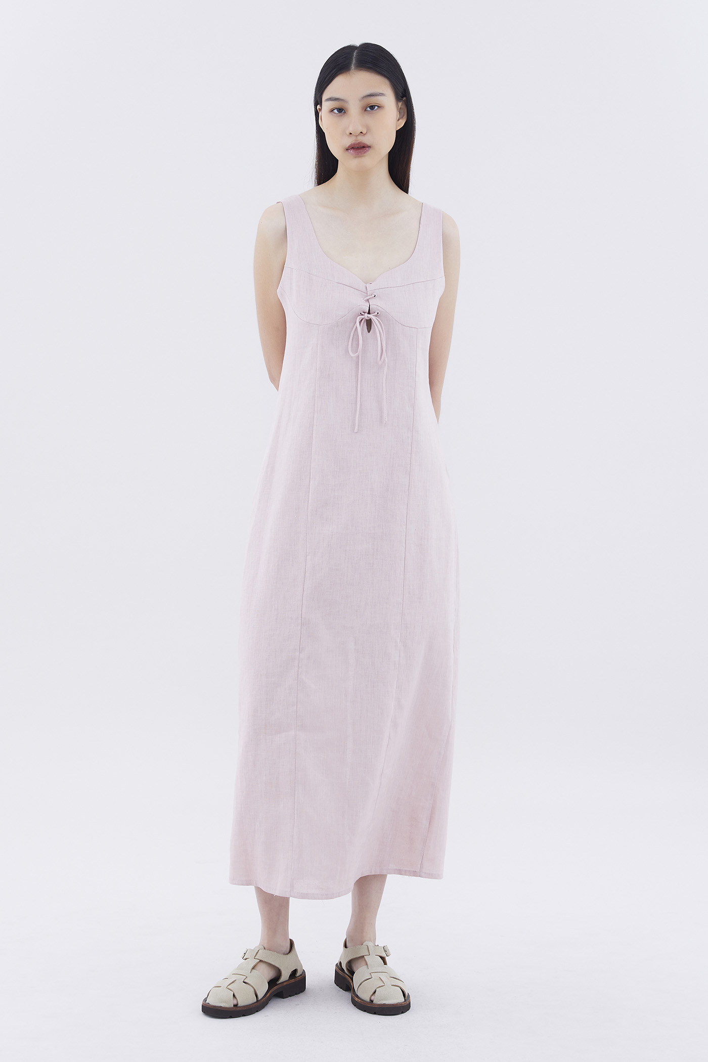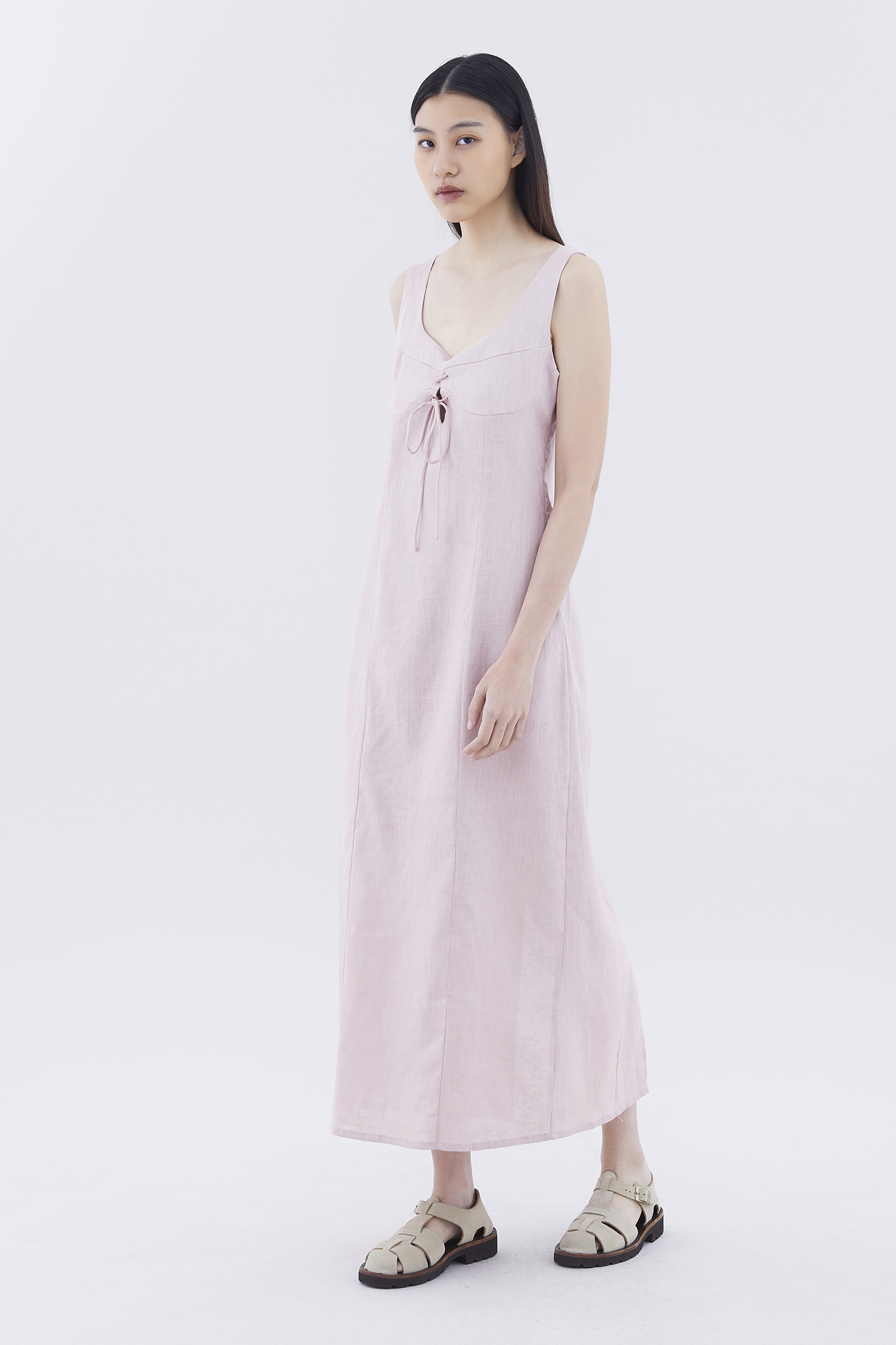 Hold it together. Cut from airy and gently tailored 100% linen, this sleeveless maxi dress features wide shoulder straps, an angular neckline, a bustier front with laced-up tie-straps and a back slit. Fits relaxed with a side zip closure.