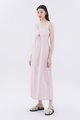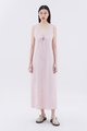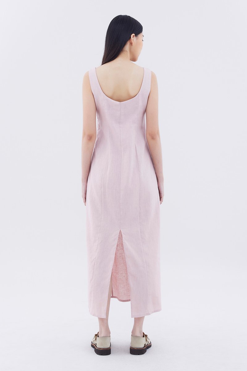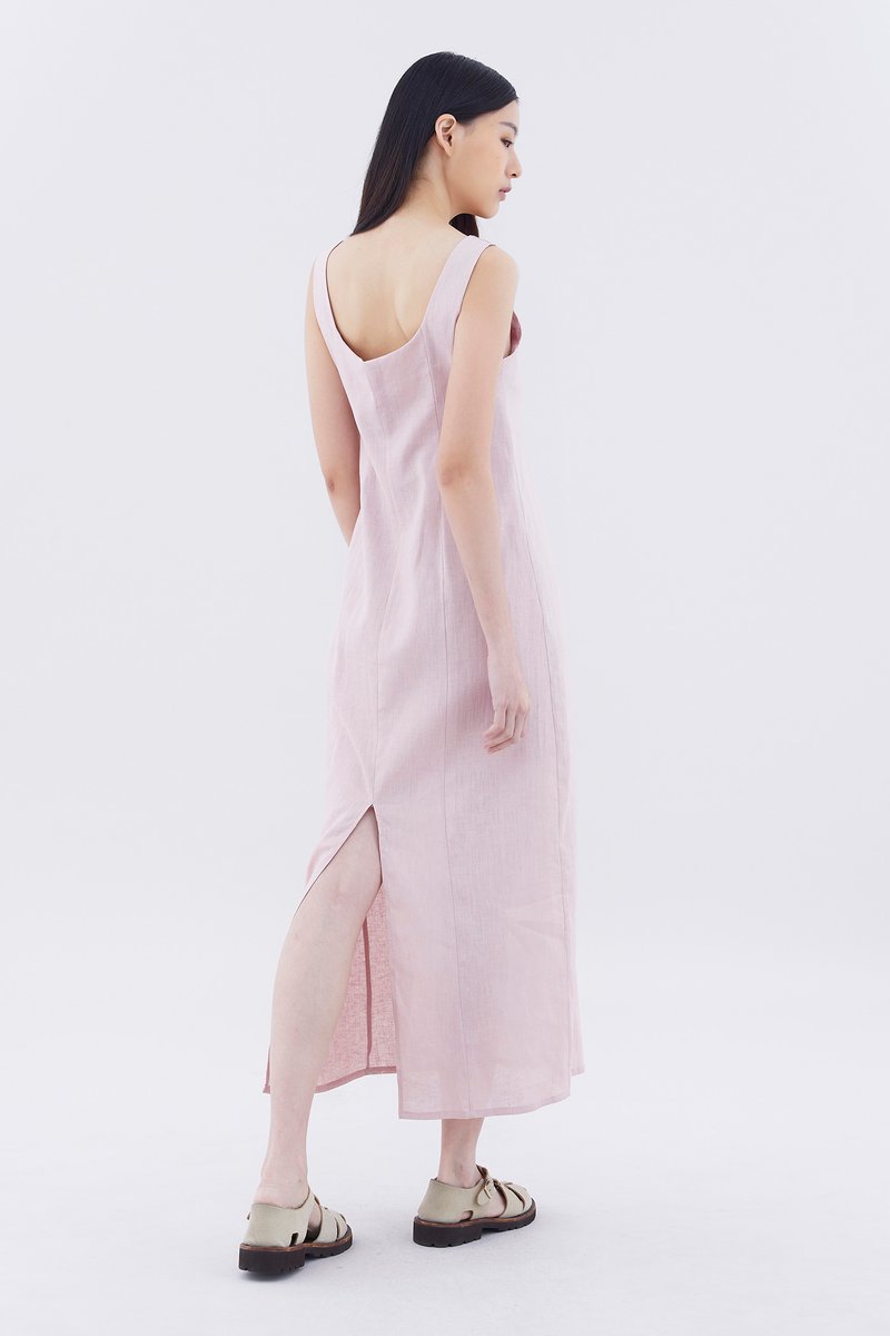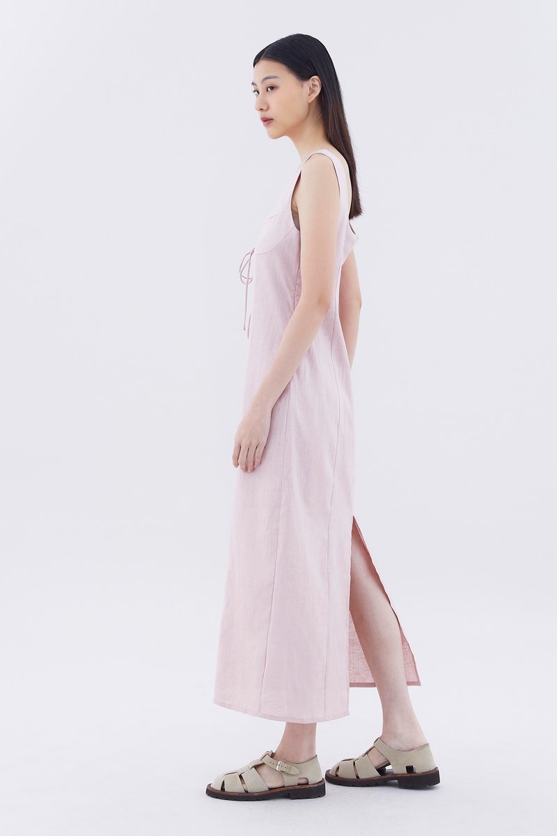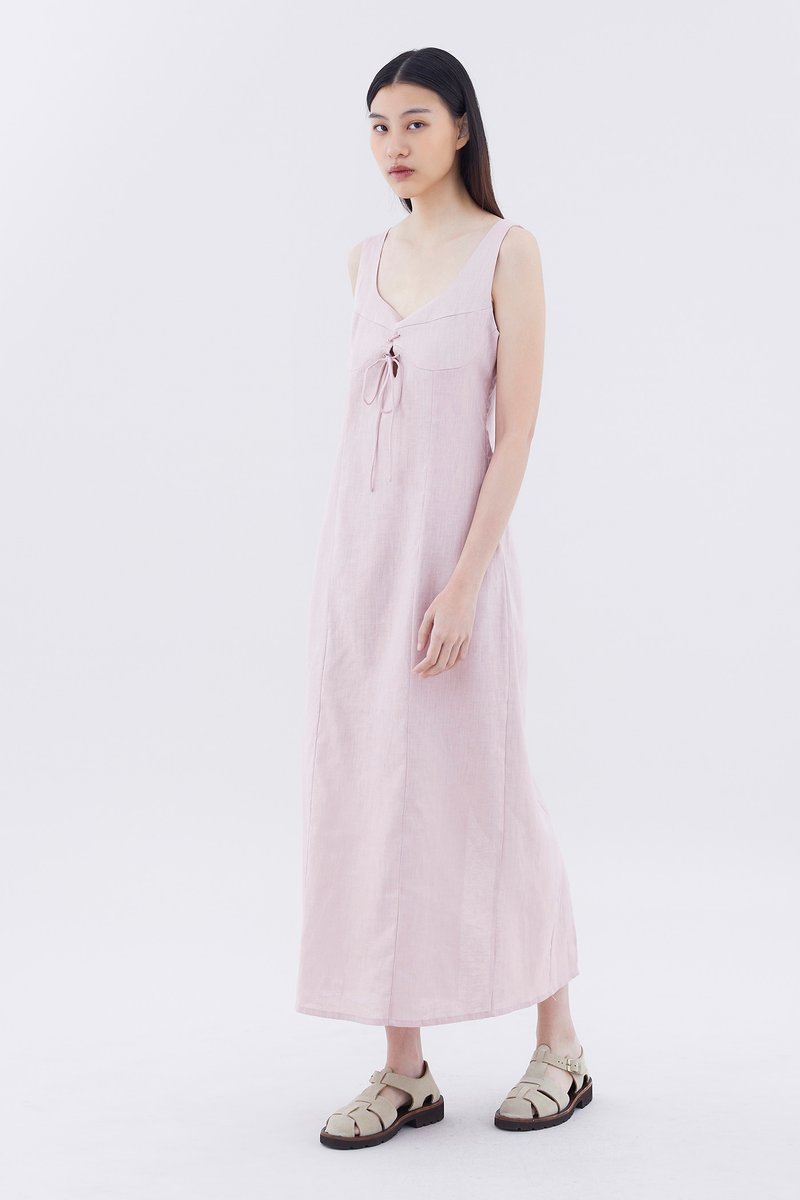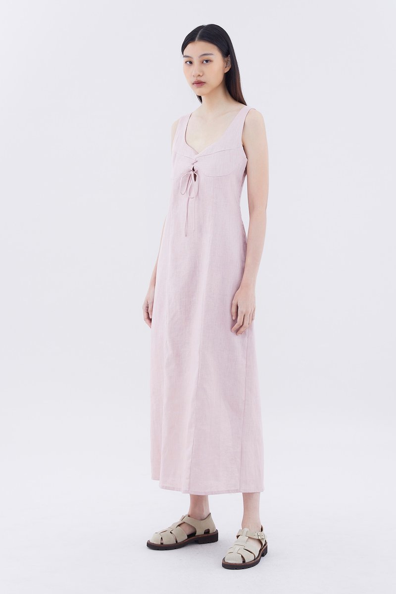 Hold it together. Cut from airy and gently tailored 100% linen, this sleeveless maxi dress features wide shoulder straps, an angular neckline, a bustier front with laced-up tie-straps and a back slit. Fits relaxed with a side zip closure.