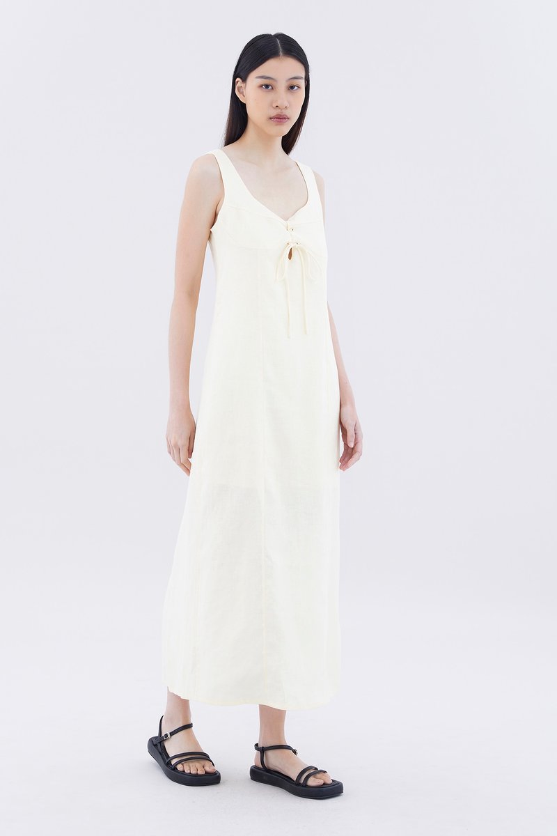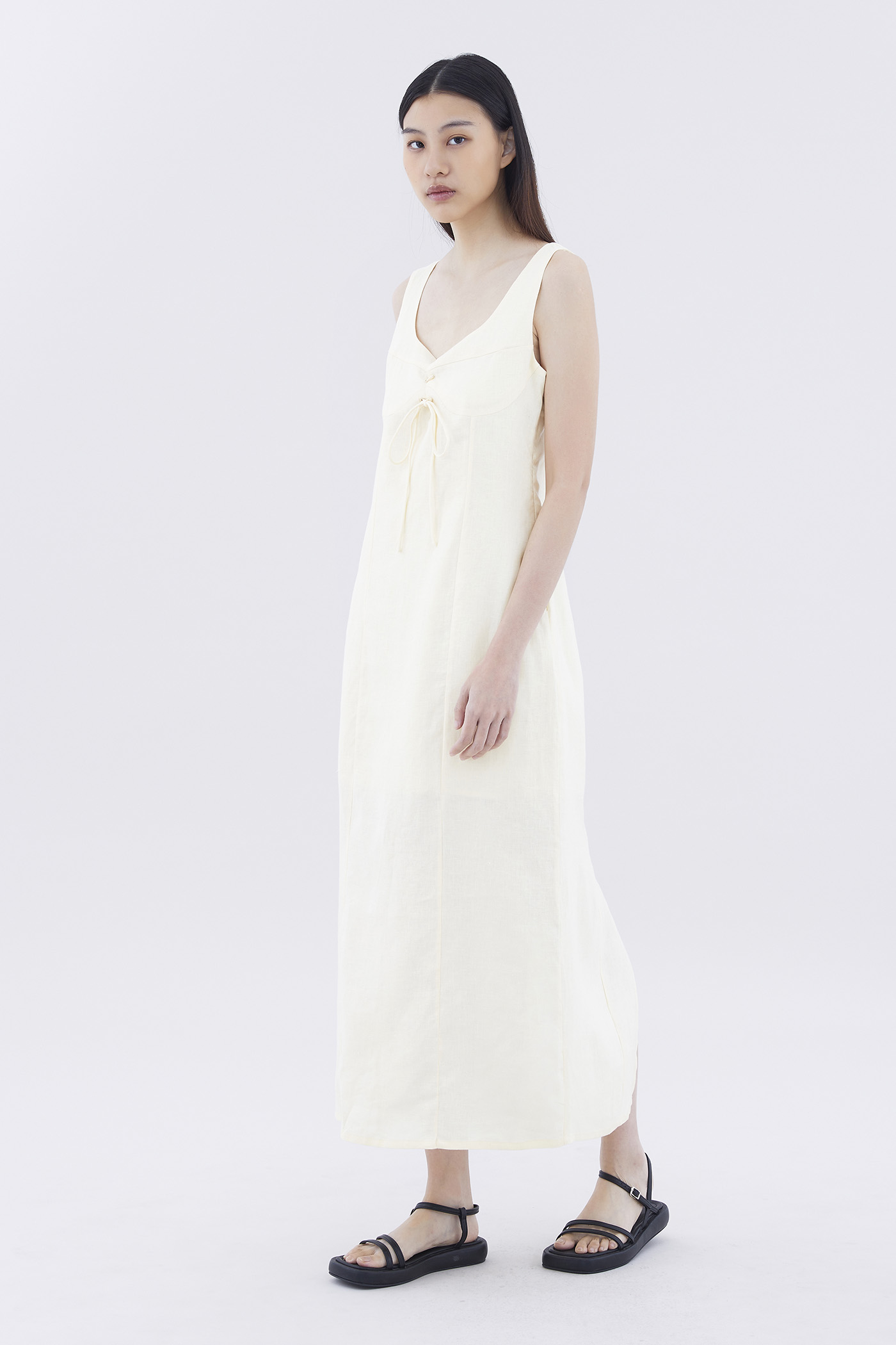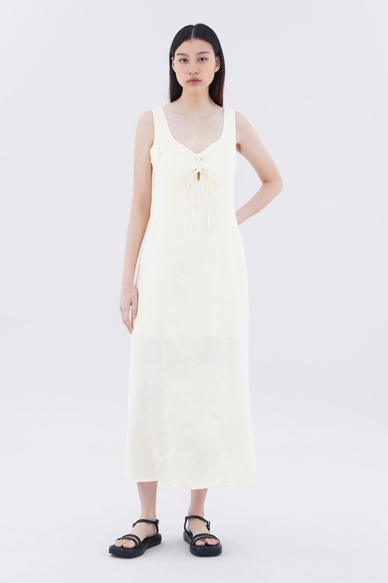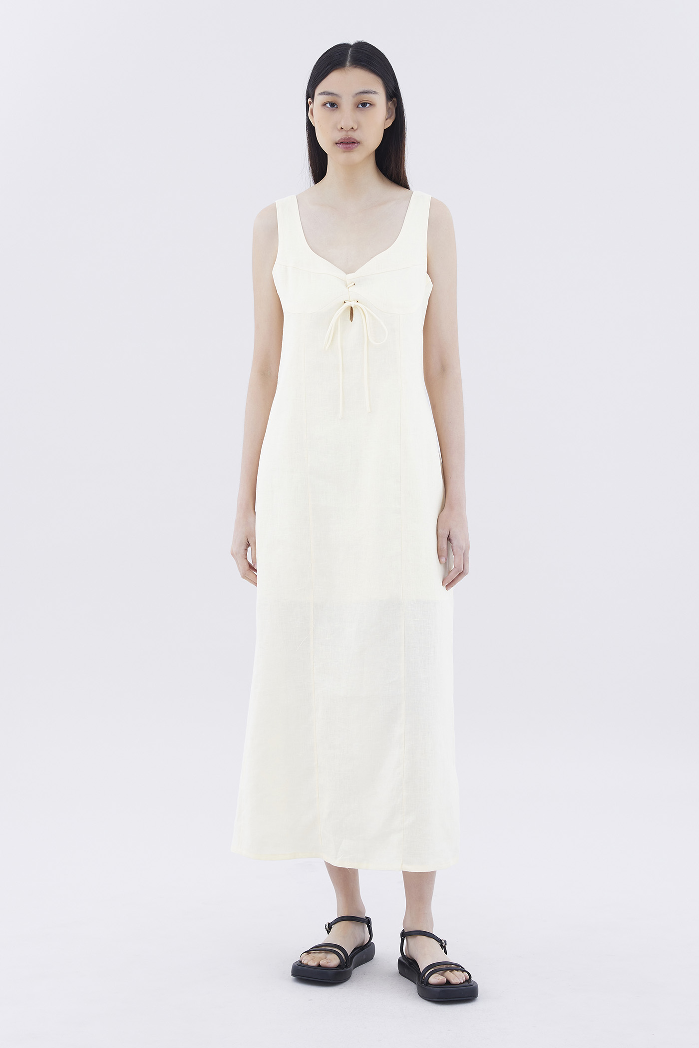 Hold it together. Cut from airy and gently tailored 100% linen, this sleeveless maxi dress features wide shoulder straps, an angular neckline, a bustier front with laced-up tie-straps and a back slit. Fits relaxed with a side zip closure.
