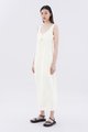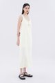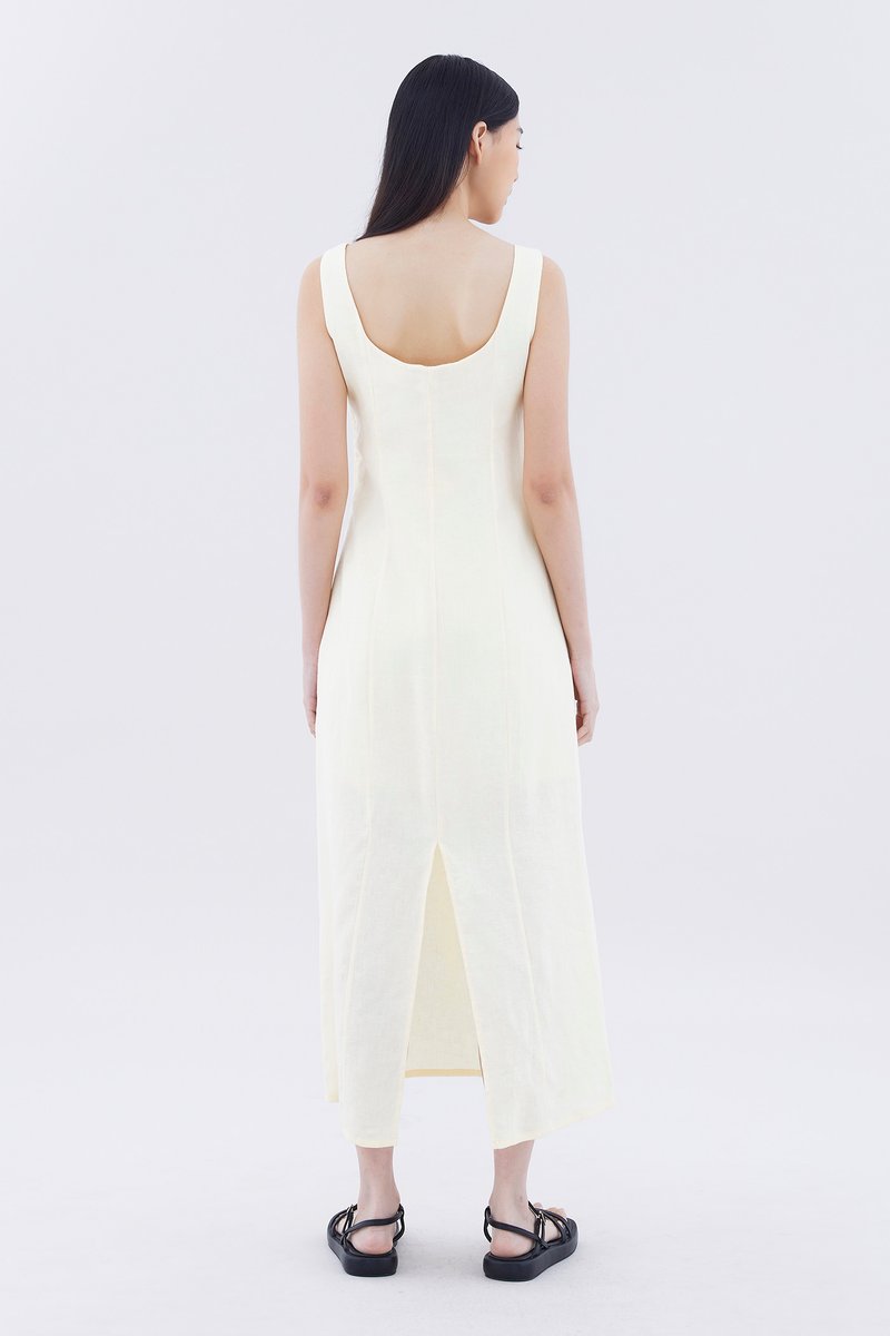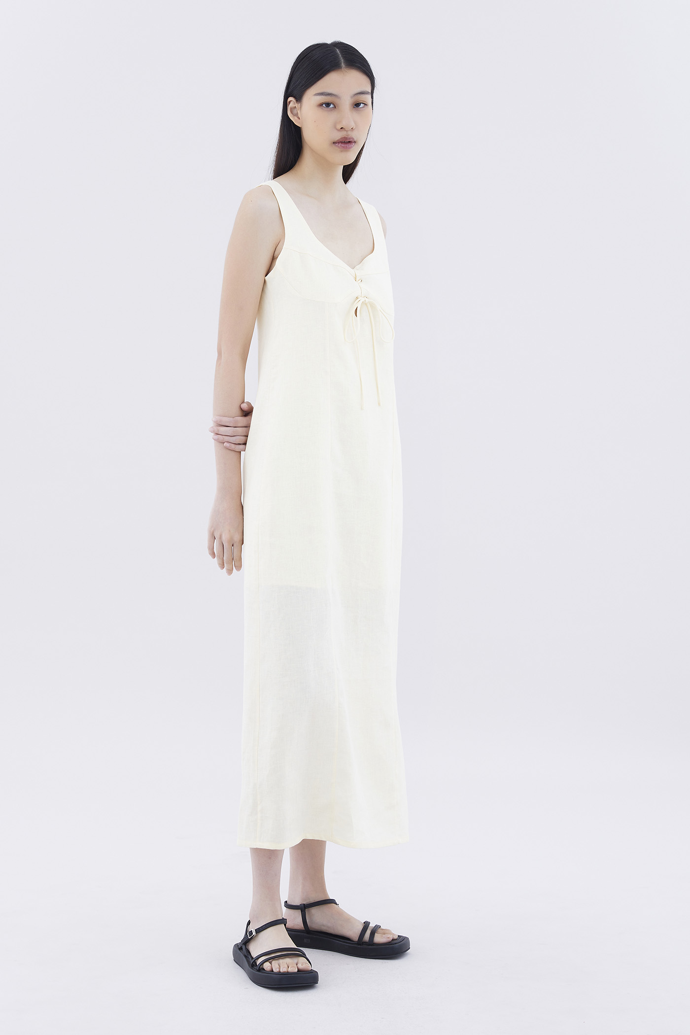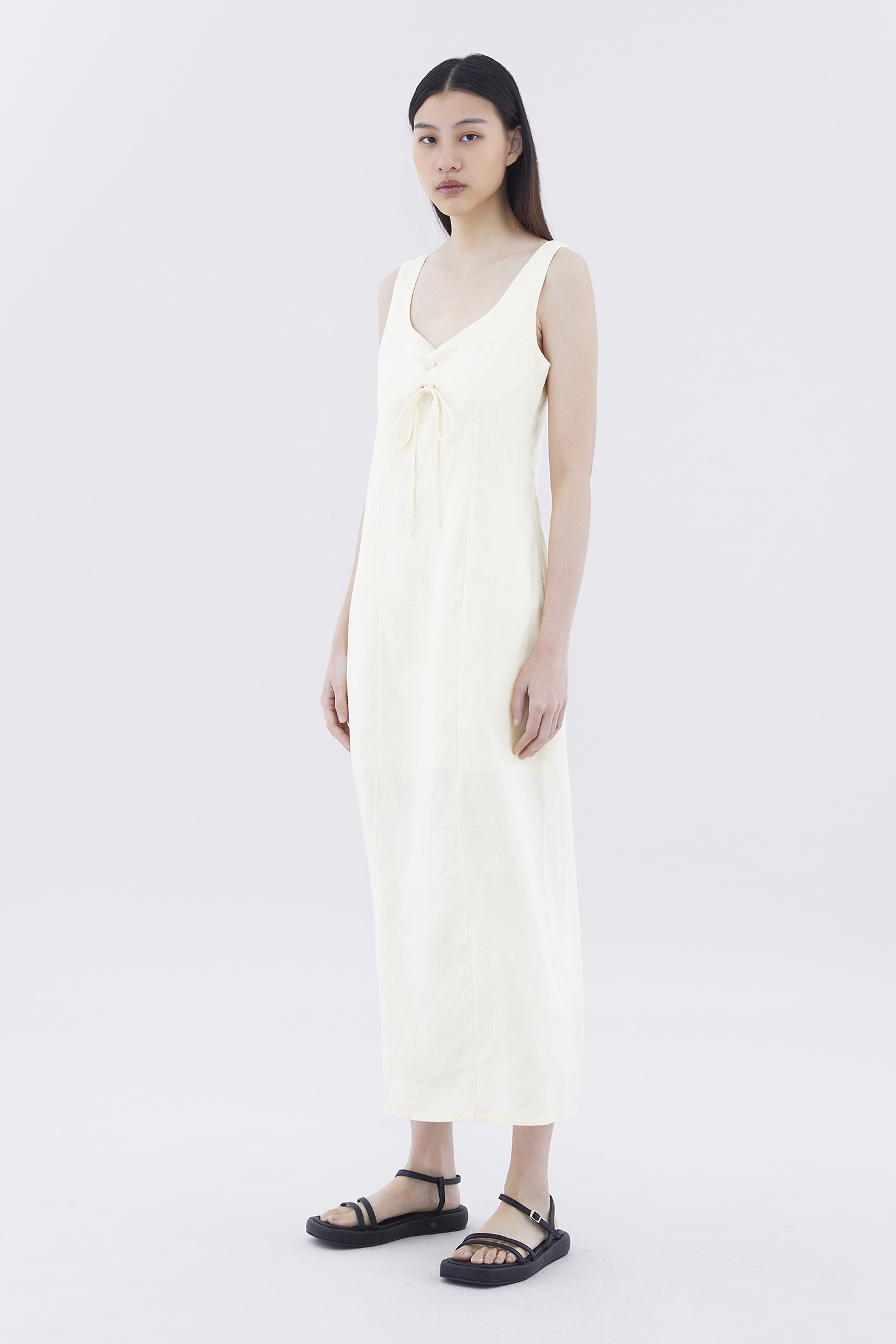 Hold it together. Cut from airy and gently tailored 100% linen, this sleeveless maxi dress features wide shoulder straps, an angular neckline, a bustier front with laced-up tie-straps and a back slit. Fits relaxed with a side zip closure.