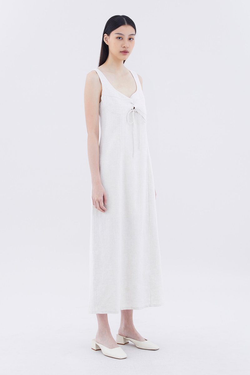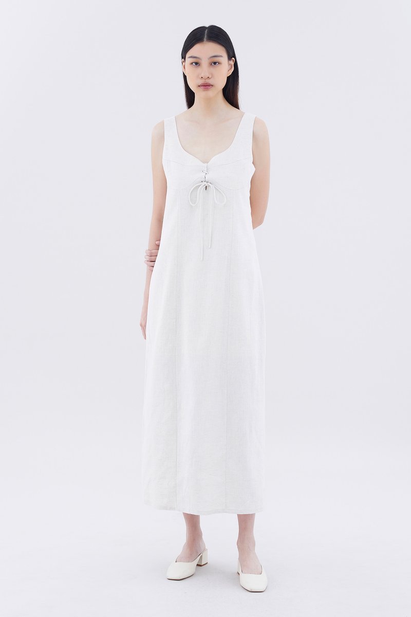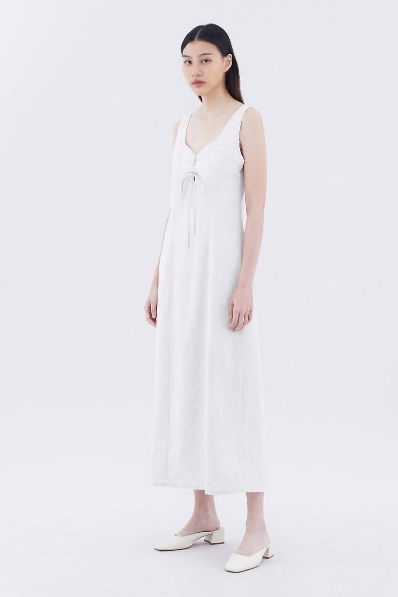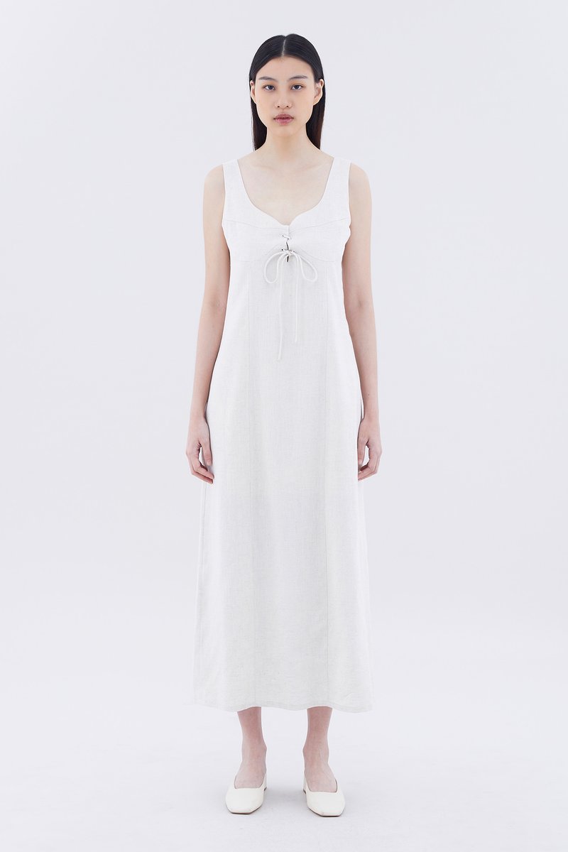 Hold it together. Cut from airy and gently tailored 100% linen, this sleeveless maxi dress features wide shoulder straps, an angular neckline, a bustier front with laced-up tie-straps and a back slit. Fits relaxed with a side zip closure.