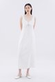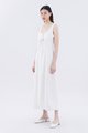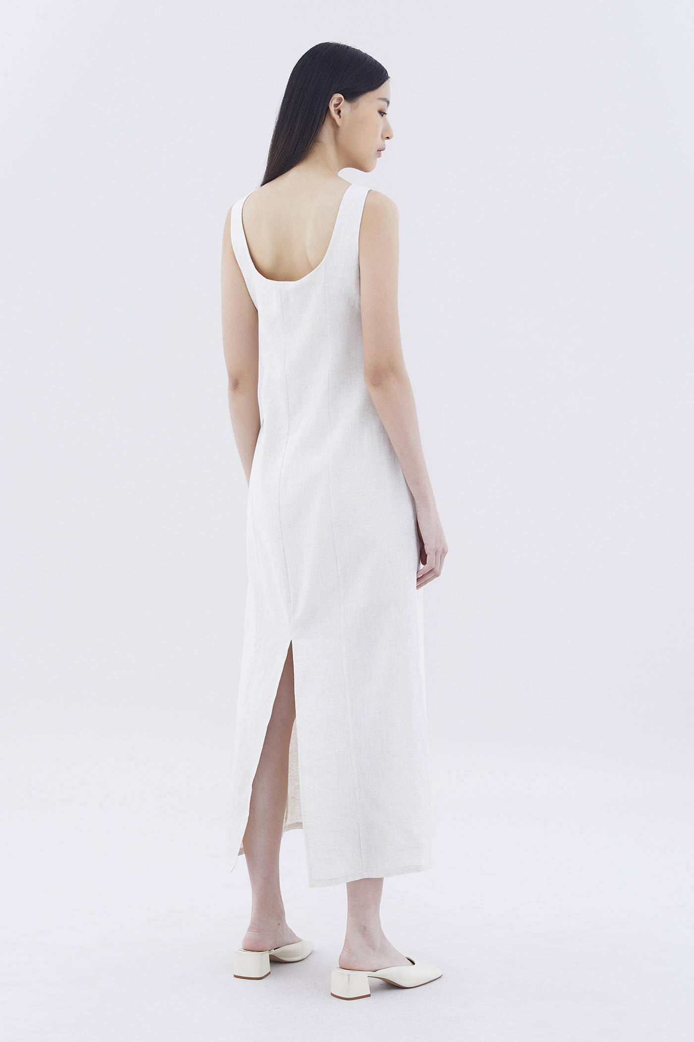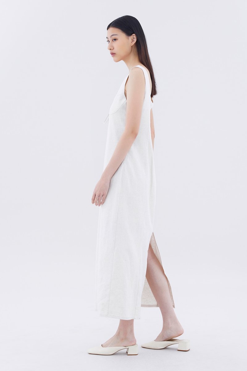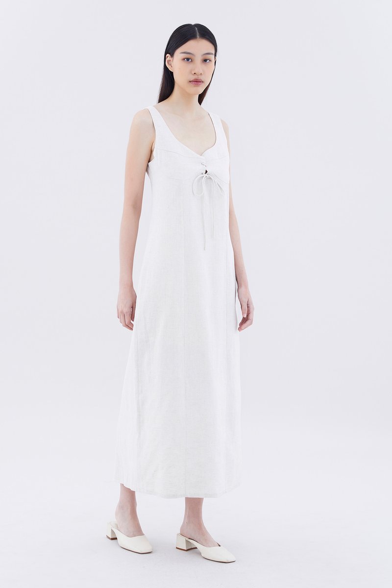 Hold it together. Cut from airy and gently tailored 100% linen, this sleeveless maxi dress features wide shoulder straps, an angular neckline, a bustier front with laced-up tie-straps and a back slit. Fits relaxed with a side zip closure.