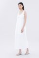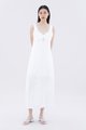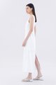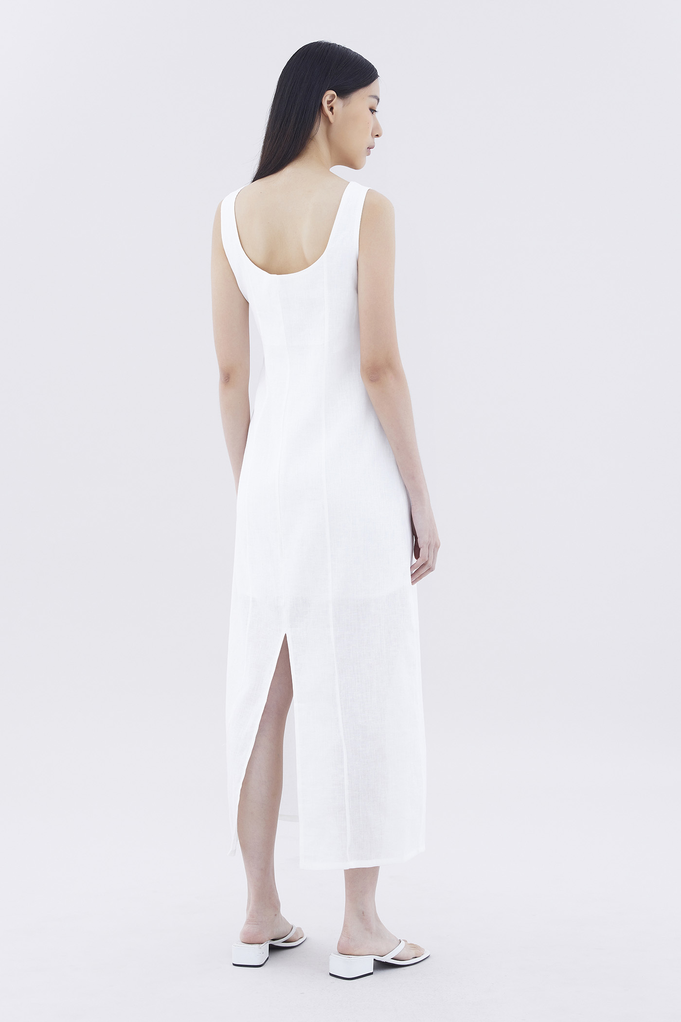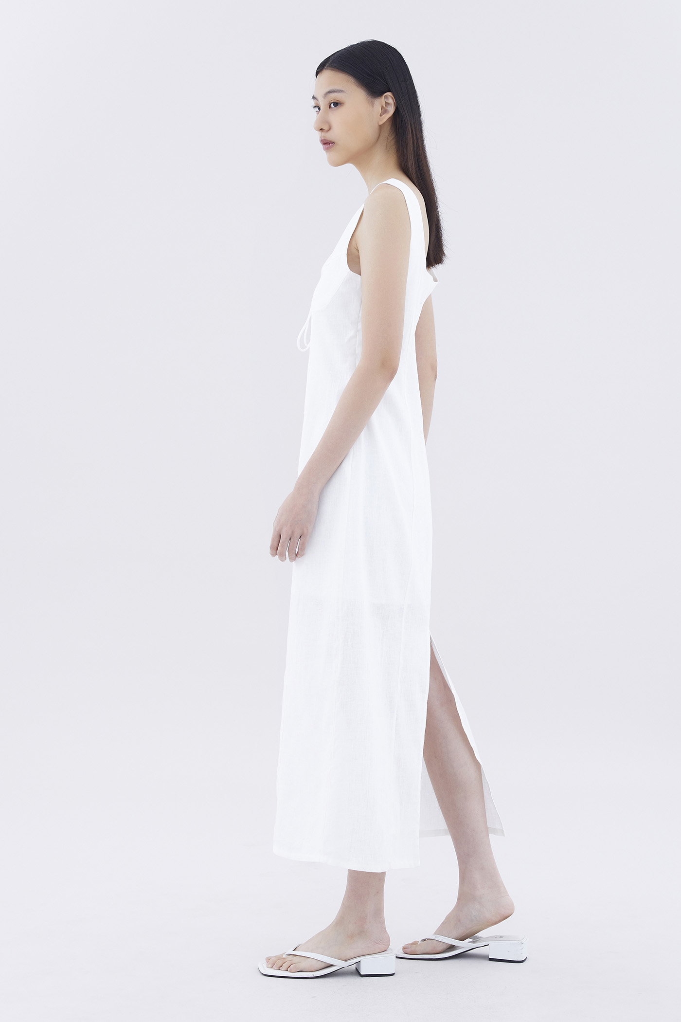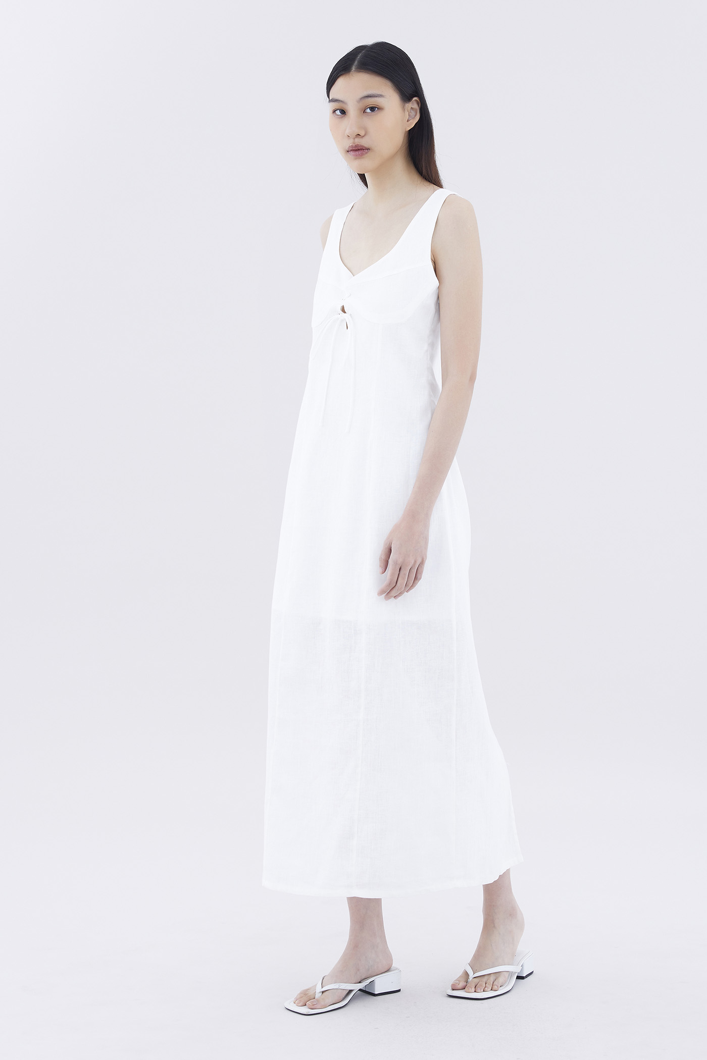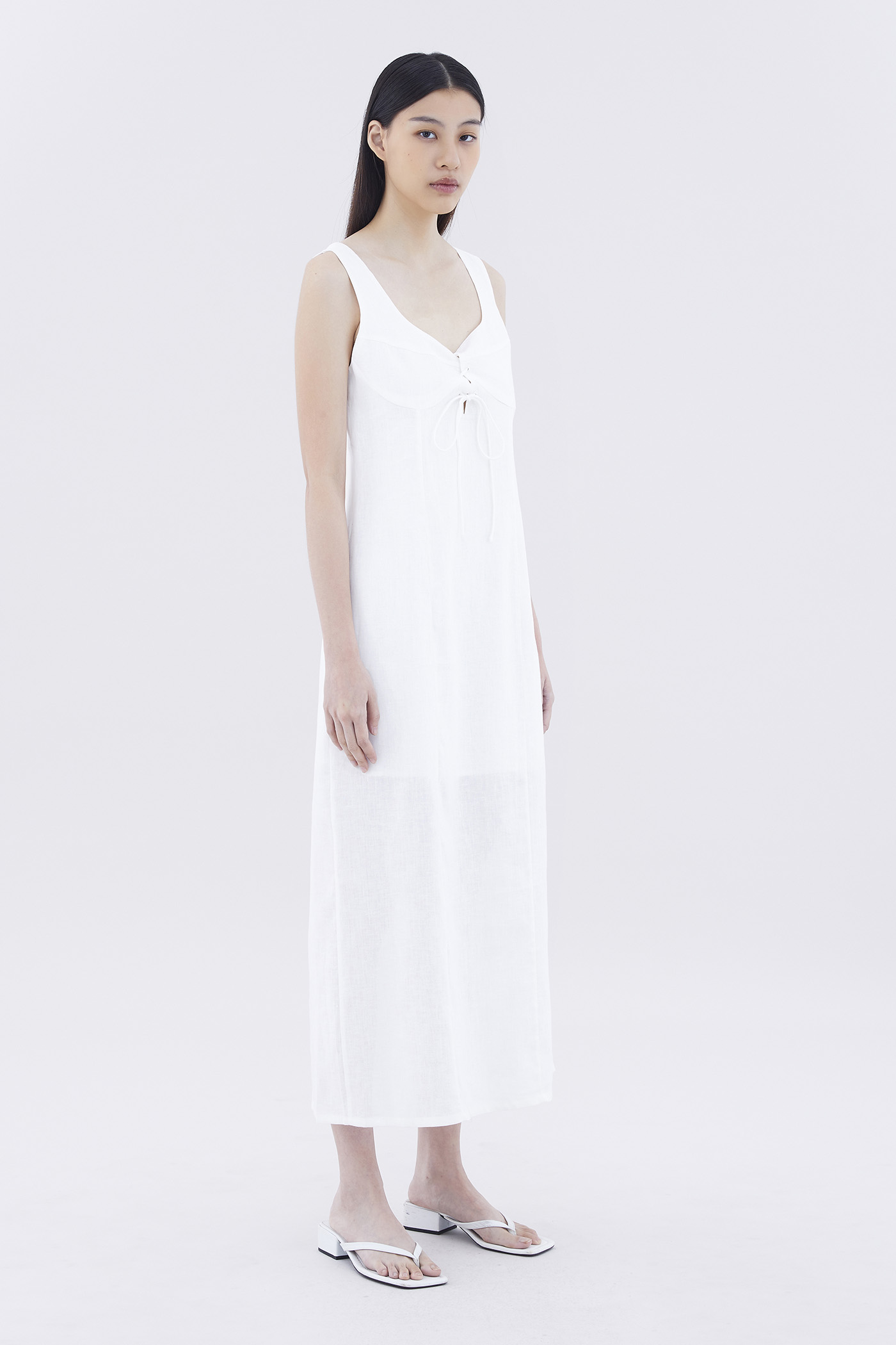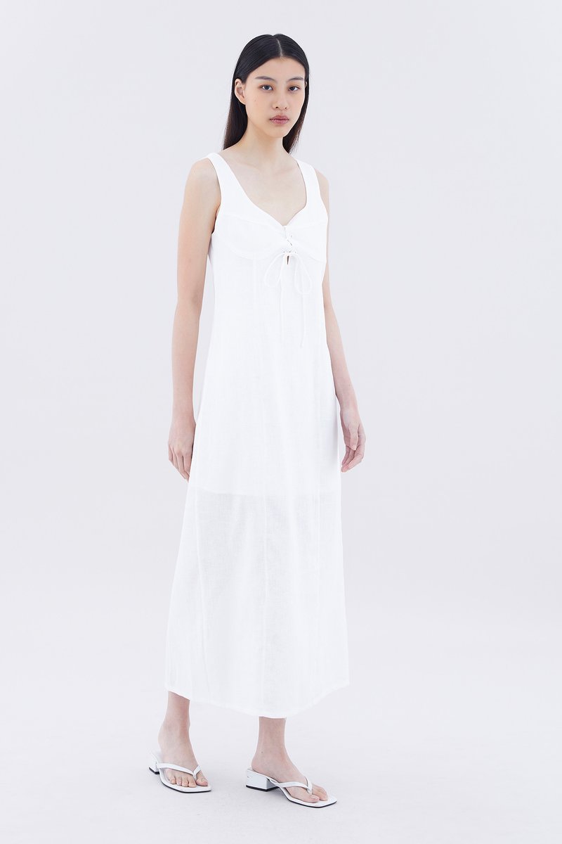Hold it together. Cut from airy and gently tailored 100% linen, this sleeveless maxi dress features wide shoulder straps, an angular neckline, a bustier front with laced-up tie-straps and a back slit. Fits relaxed with a side zip closure.