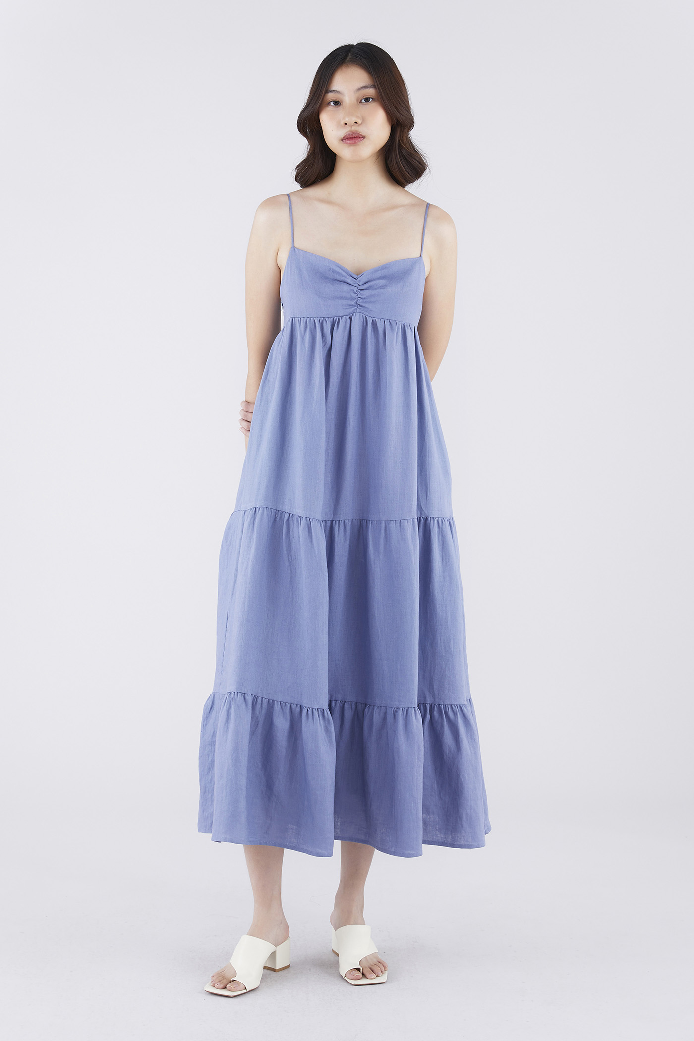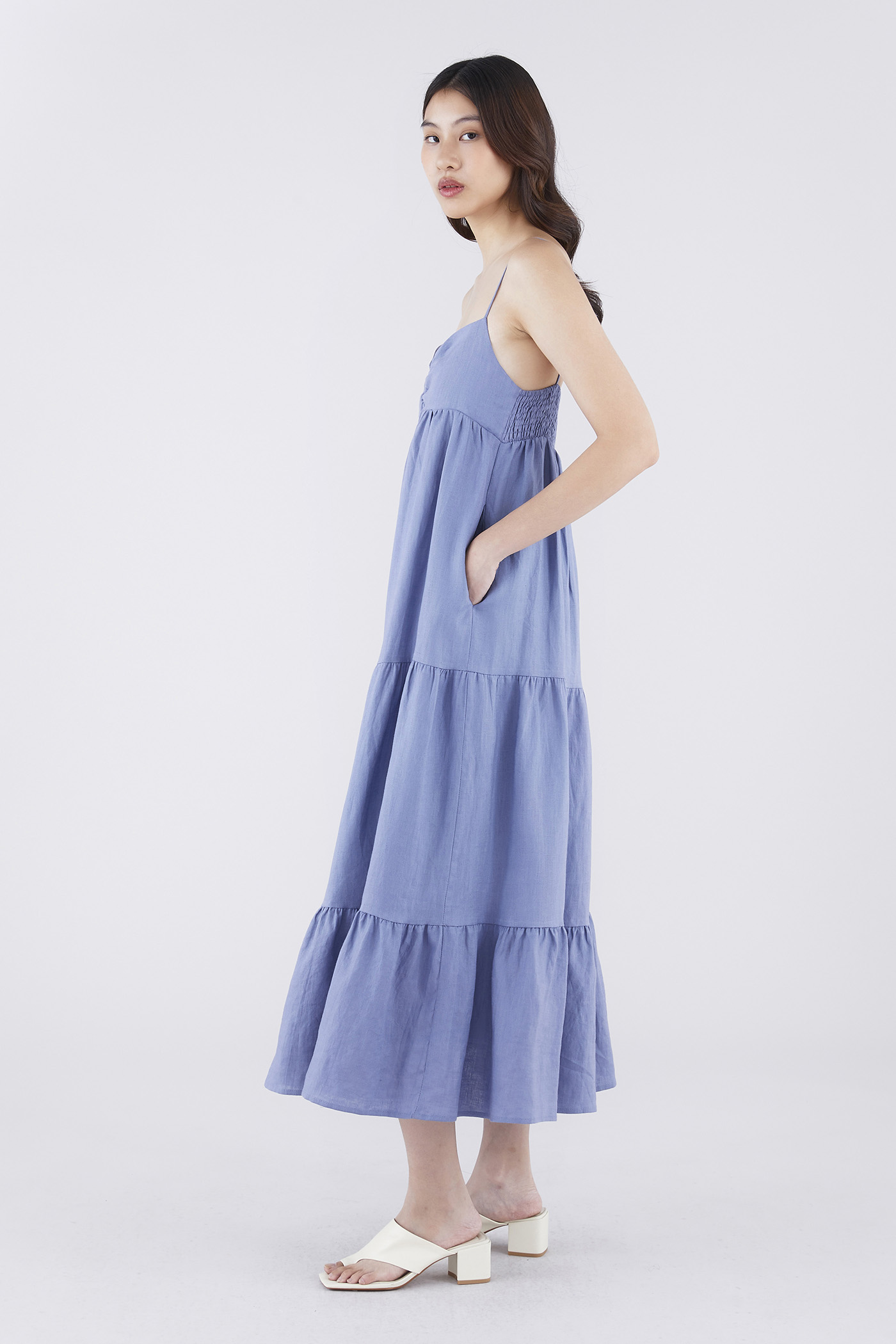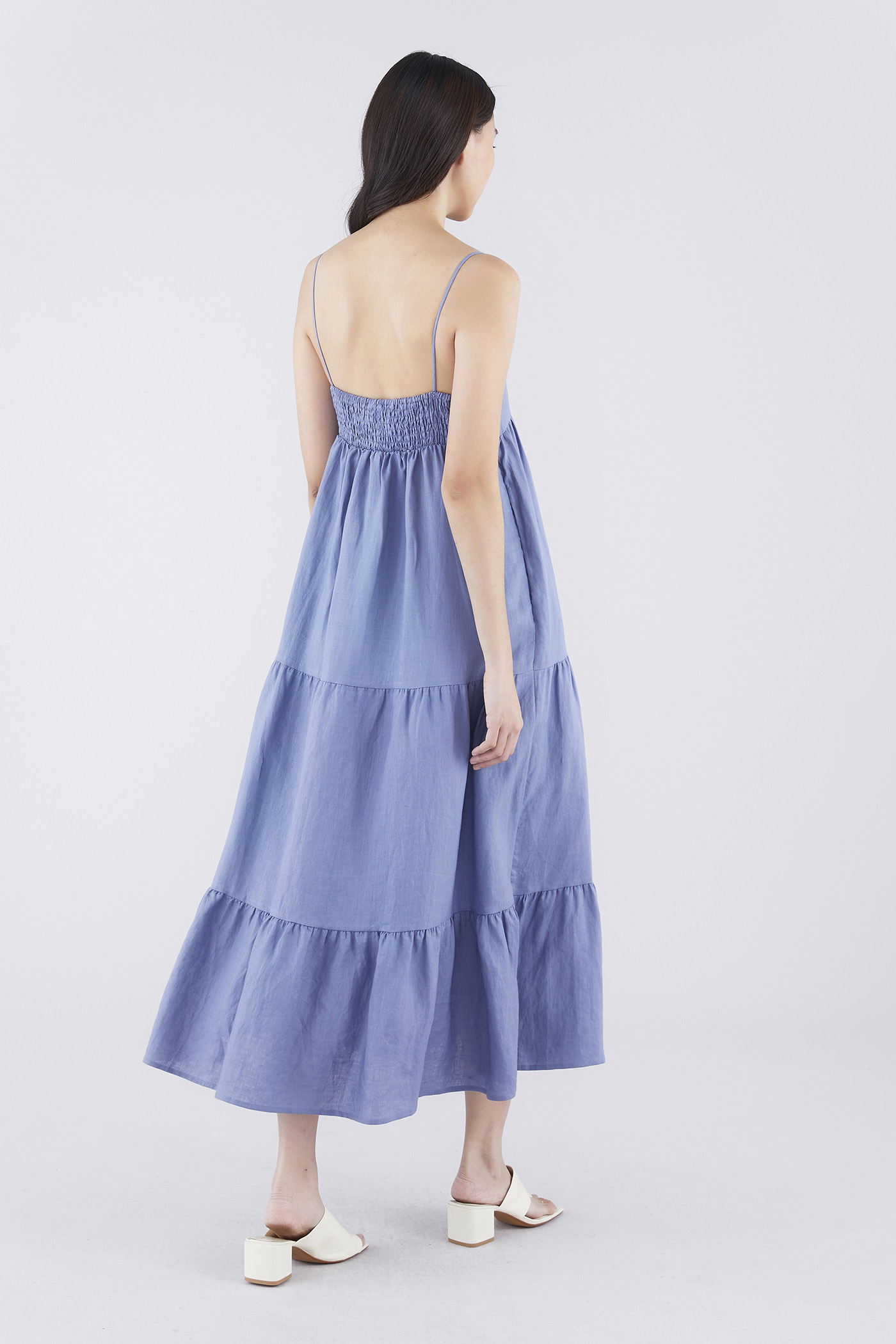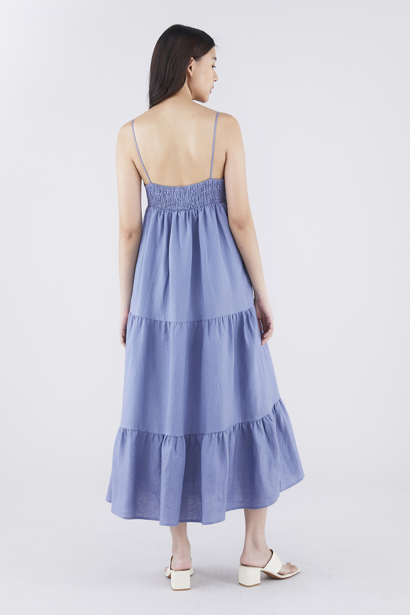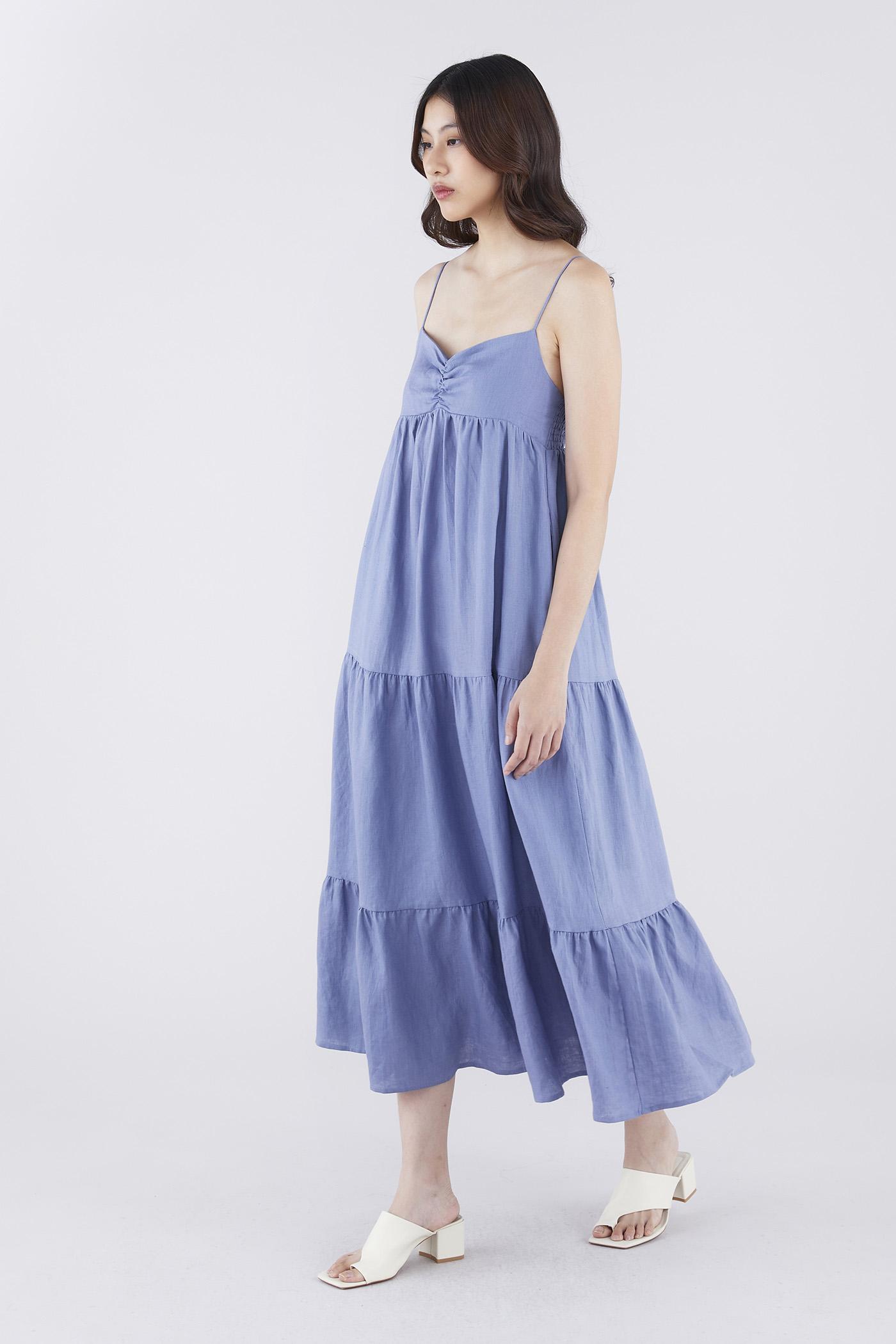 Classic cuts. Made from airy and softly structured linen, this sleeveless maxi dress features slim non-adjustable shoulder straps, a dipped neckline, a ruched bust, a side zip closure and a smocked back. Worn in an empire-waist silhouette that fits slimmer at the bust before flowing out in a relaxed, tiered skirt.