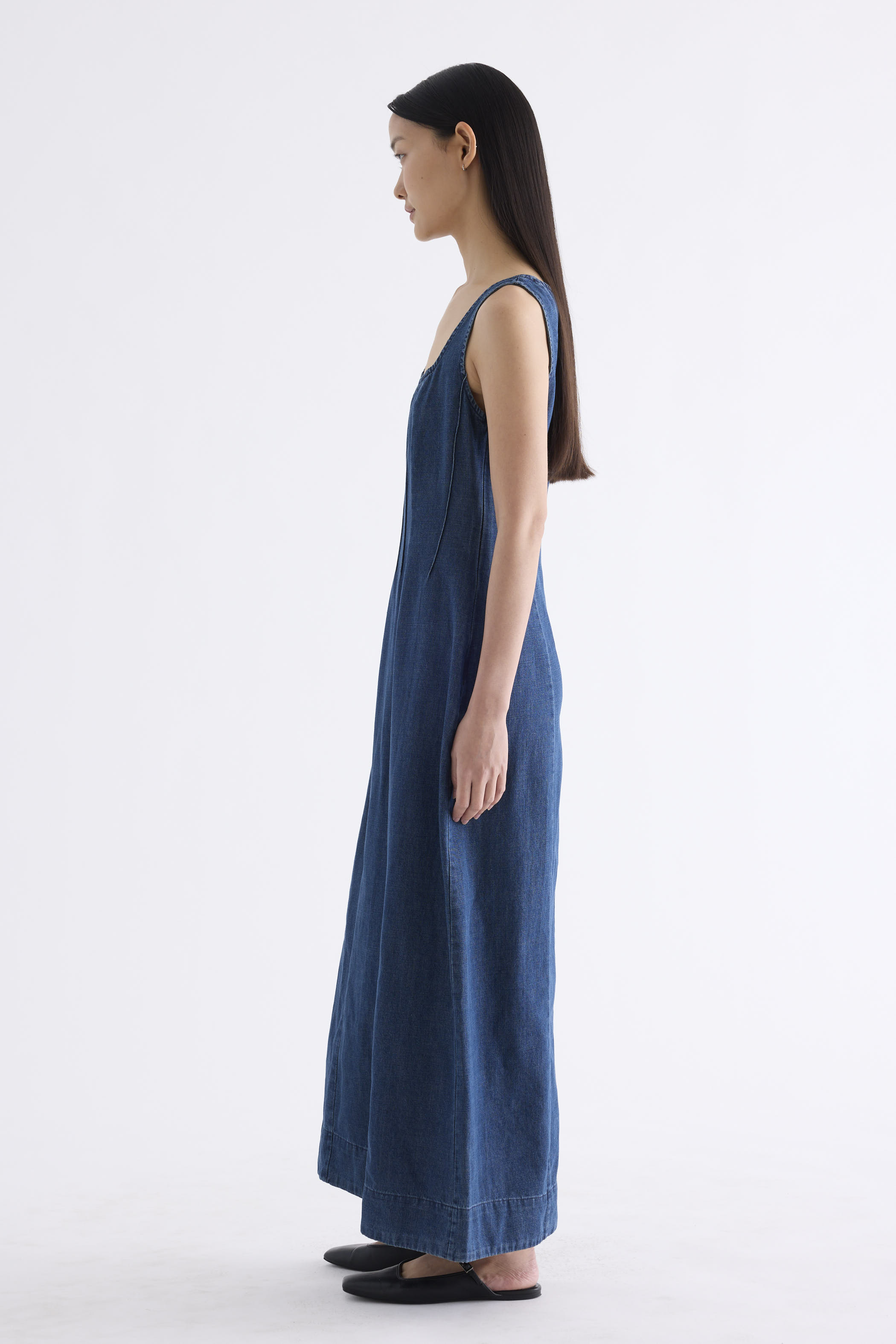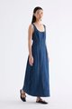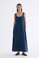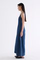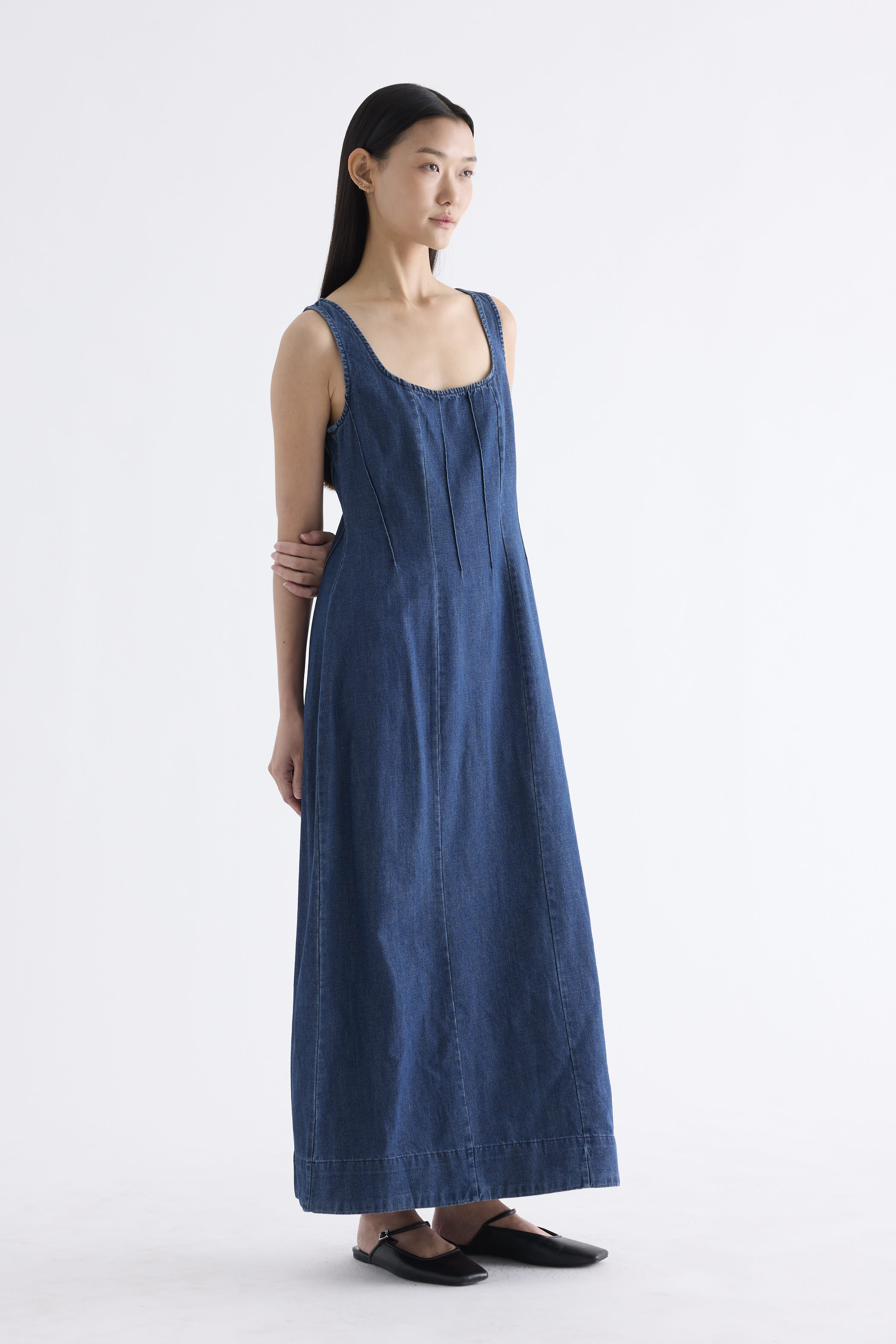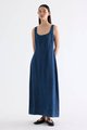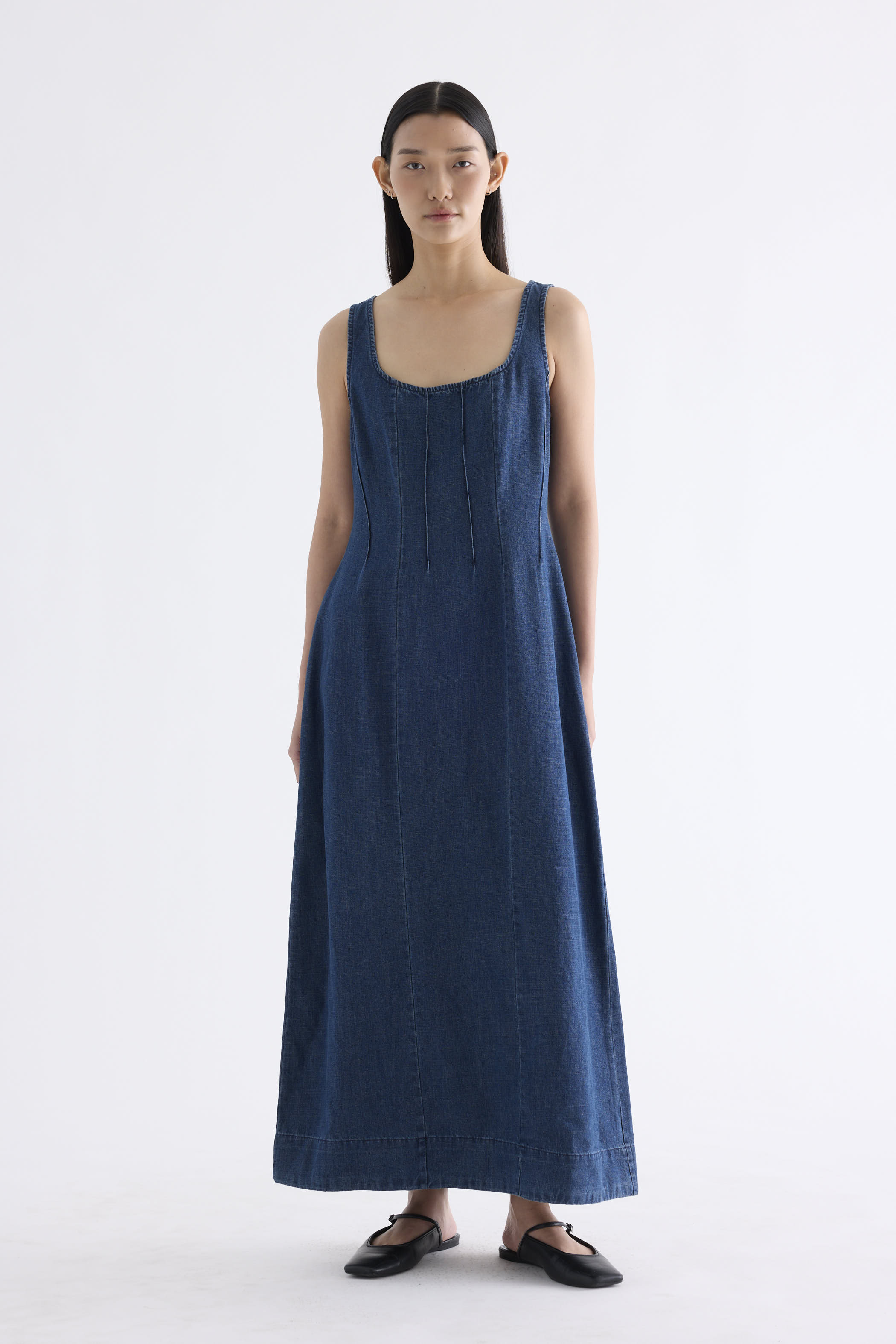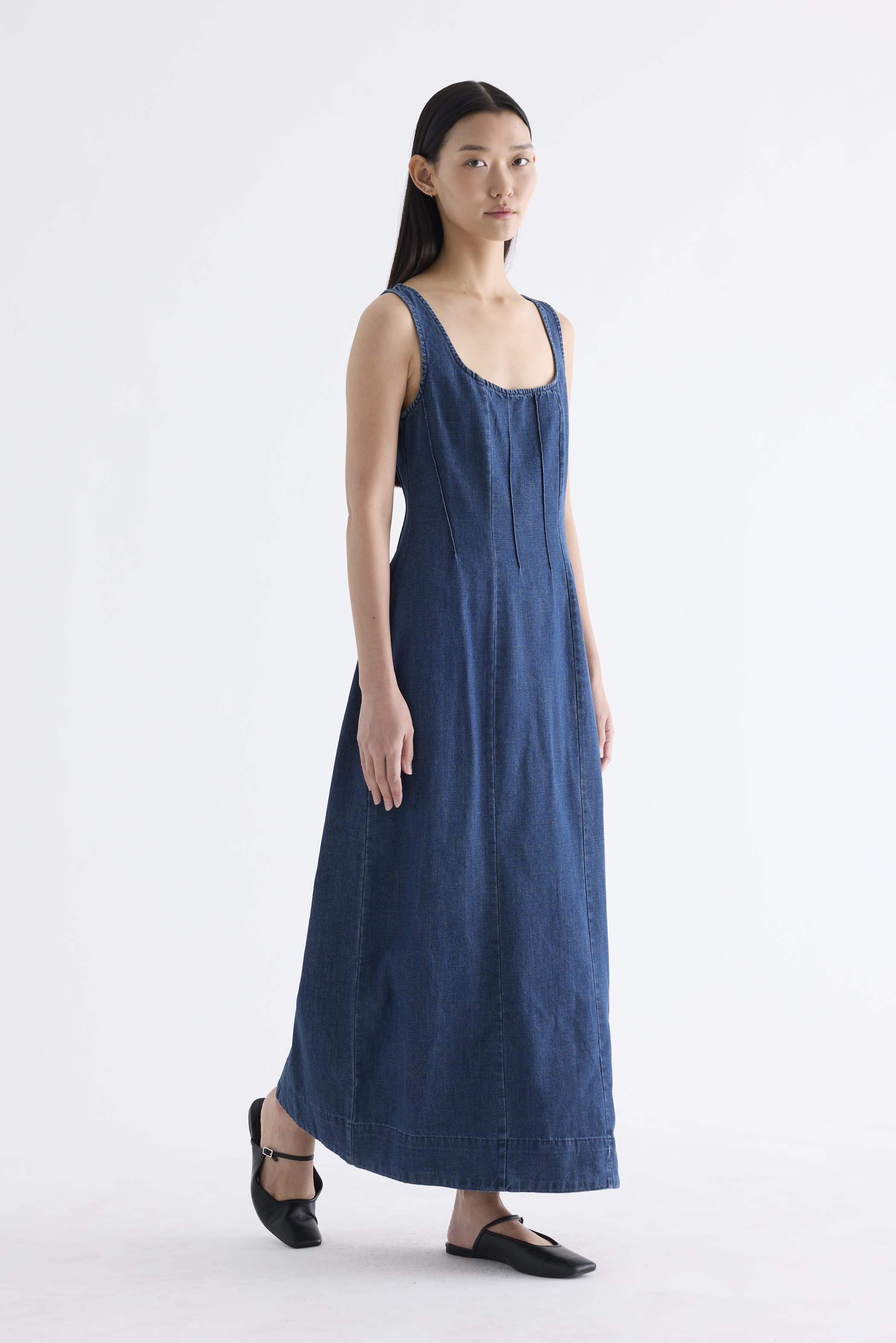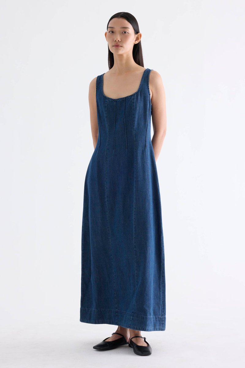 Polished. Cut from softly structured cotton denim, this sleeveless maxi dress features a scooped square neckline, wide shoulder straps, front panelling and side zip closure. Fits slimmer at the waist before flowing out in a relaxed, A-line skirt.