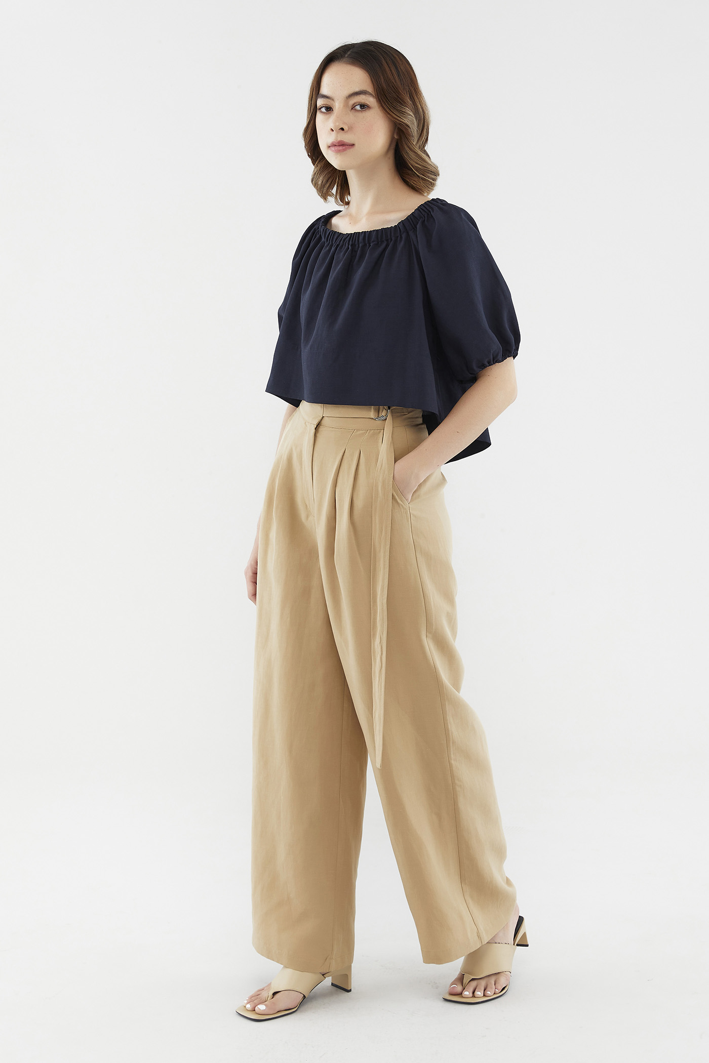 Add dimension to your look with this top’s asymmetrical lengths. Made from airy and unlined fabric, it flaunts a high-low hem, short puff sleeves and an elasticated neckline that can be worn on or off the shoulder. Fits relaxed in a cropped length at the front, and a regular length at the back.