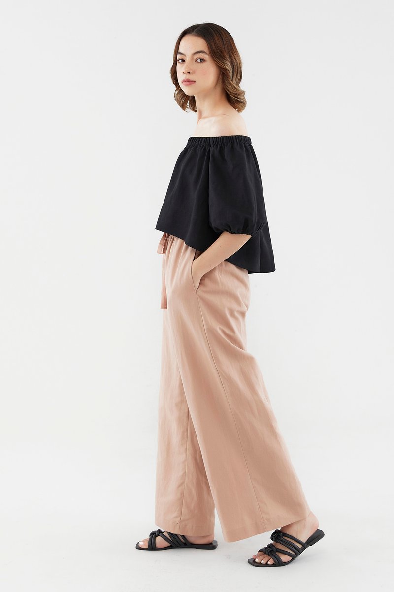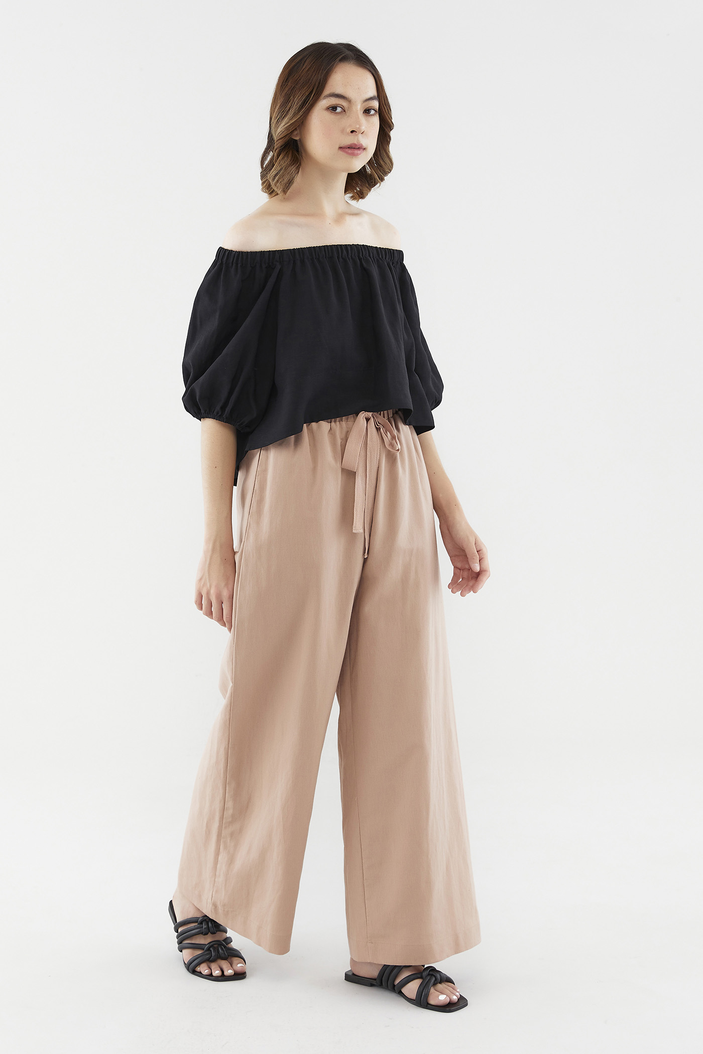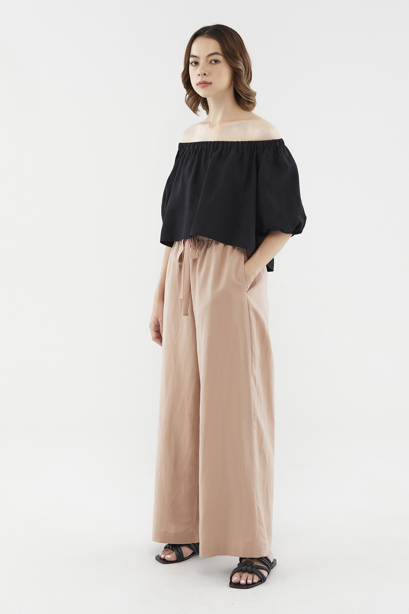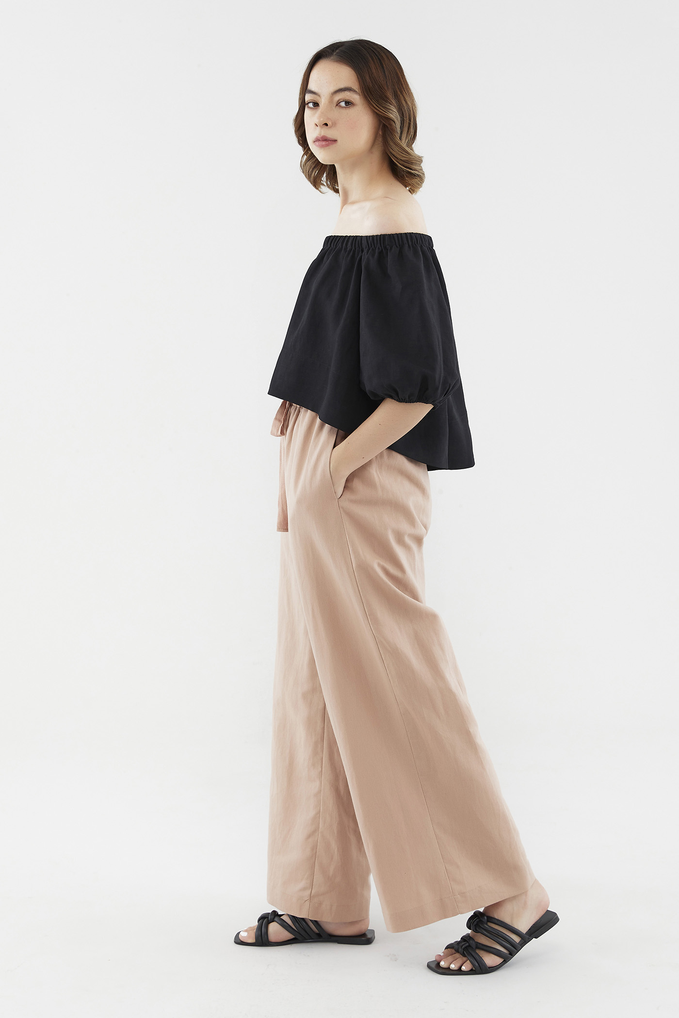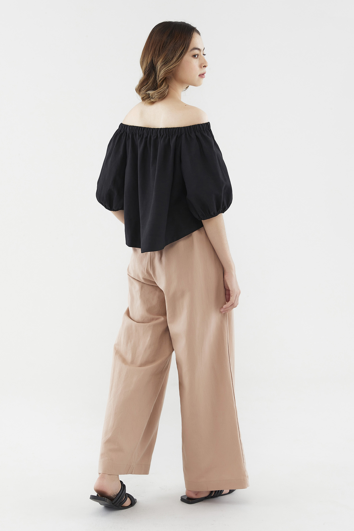 Add dimension to your look with this top’s asymmetrical lengths. Made from airy and unlined fabric, it flaunts a high-low hem, short puff sleeves and an elasticated neckline that can be worn on or off the shoulder. Fits relaxed in a cropped length at the front, and a regular length at the back.
