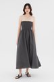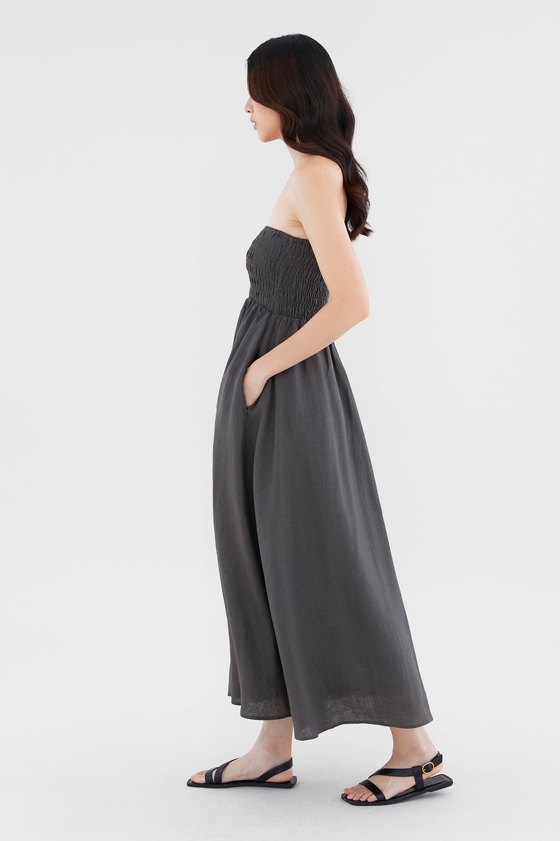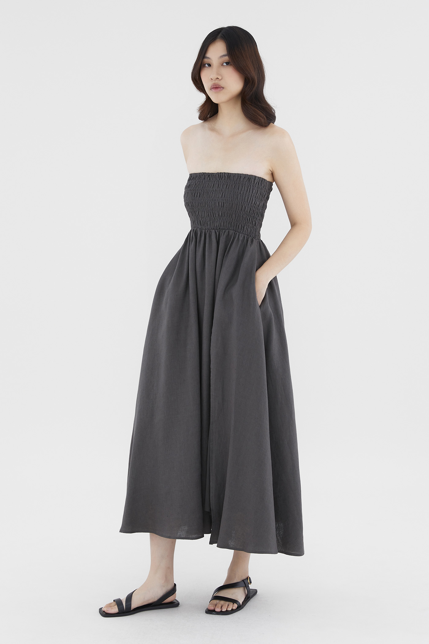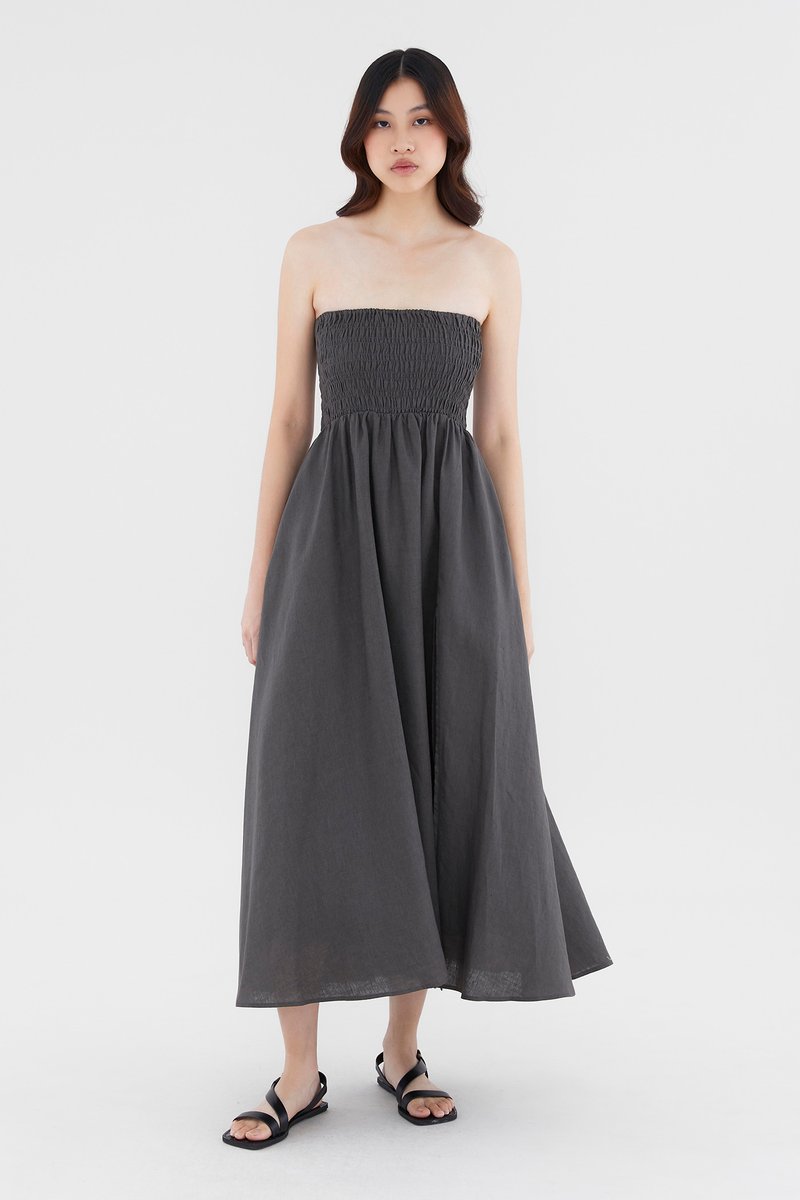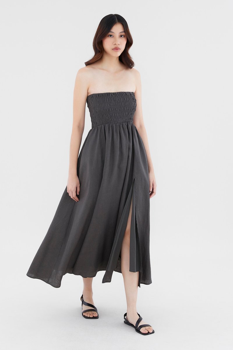 Living in linens. Cut from airy and softly tailored 100% linen, this strapless maxi dress features a shirred bodice and a side skirt split. Worn in an A-line silhouette that fits slimmer through the bodice before flaring out at the waist in a relaxed skirt.