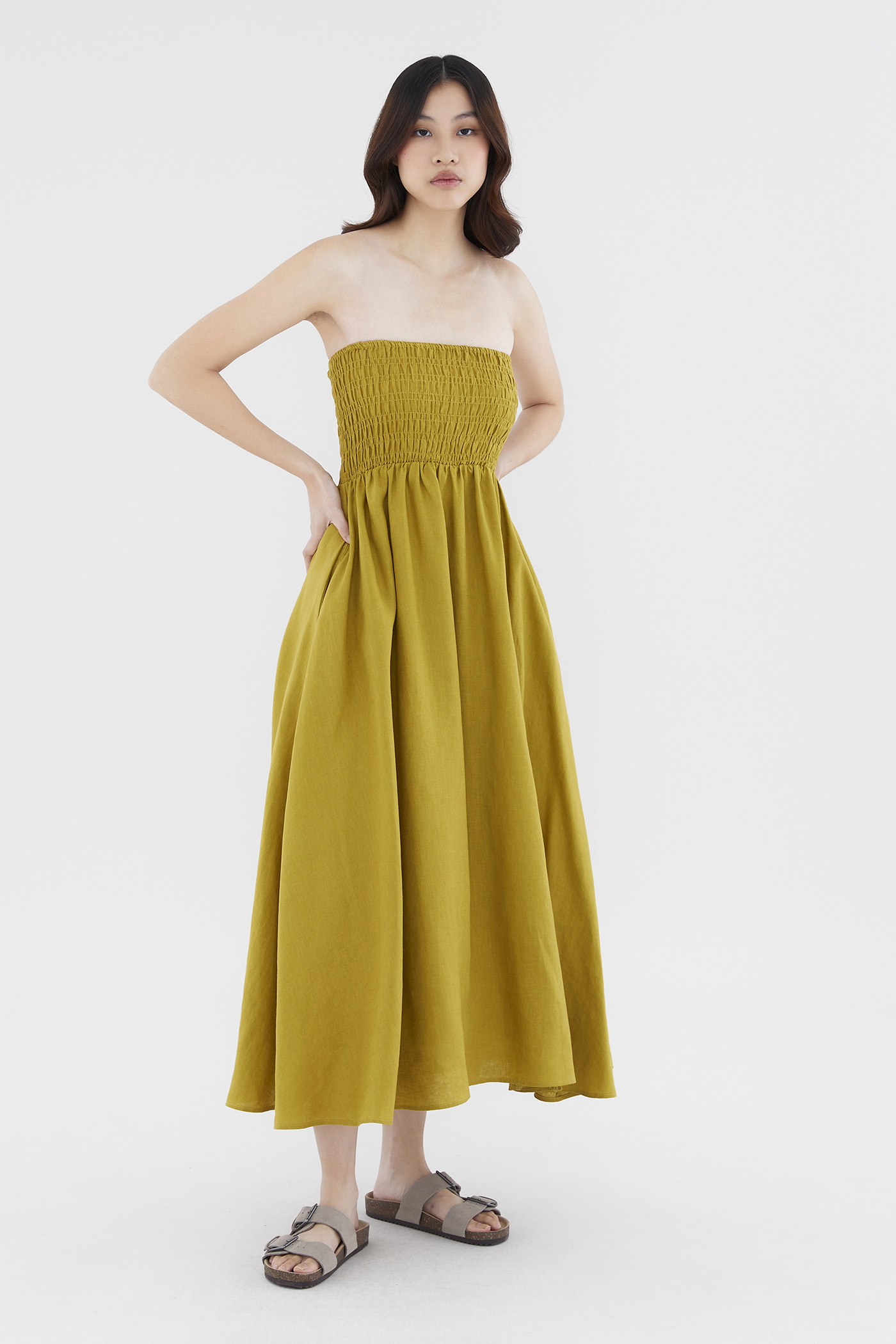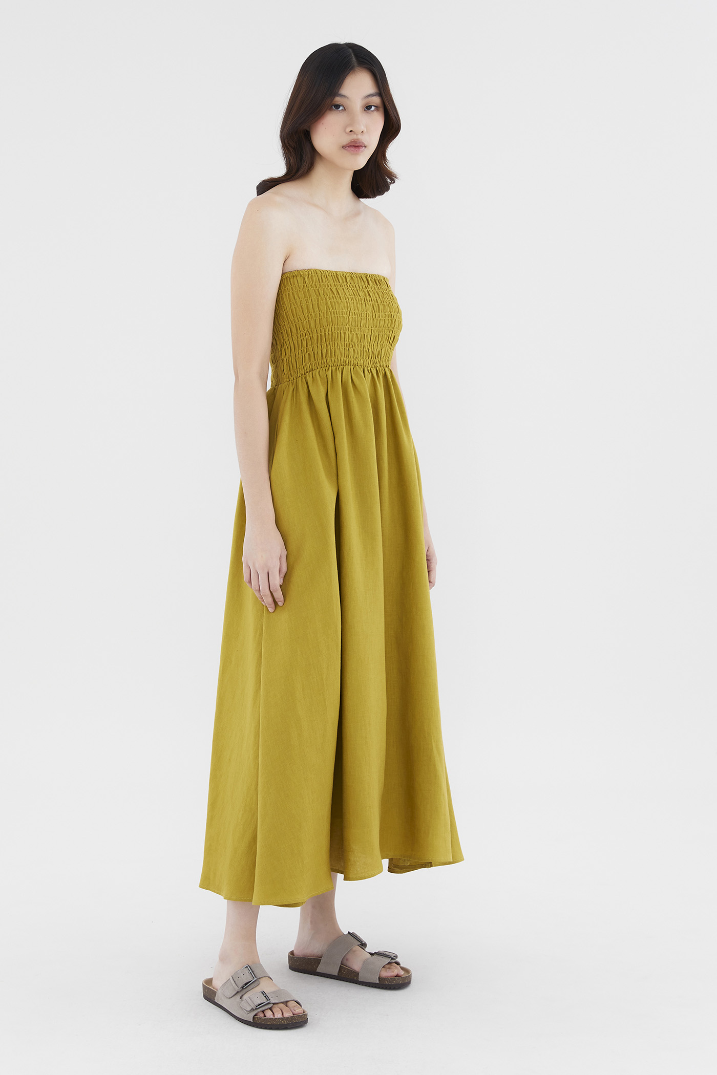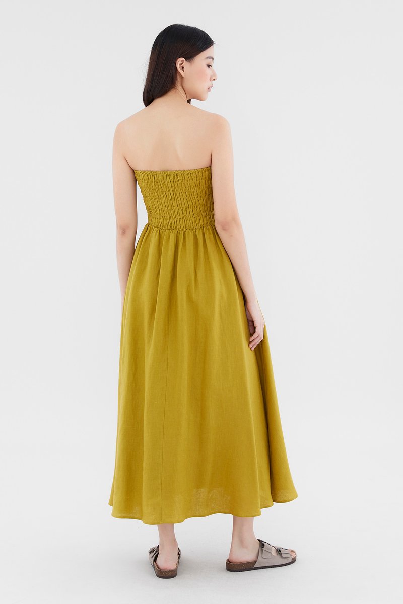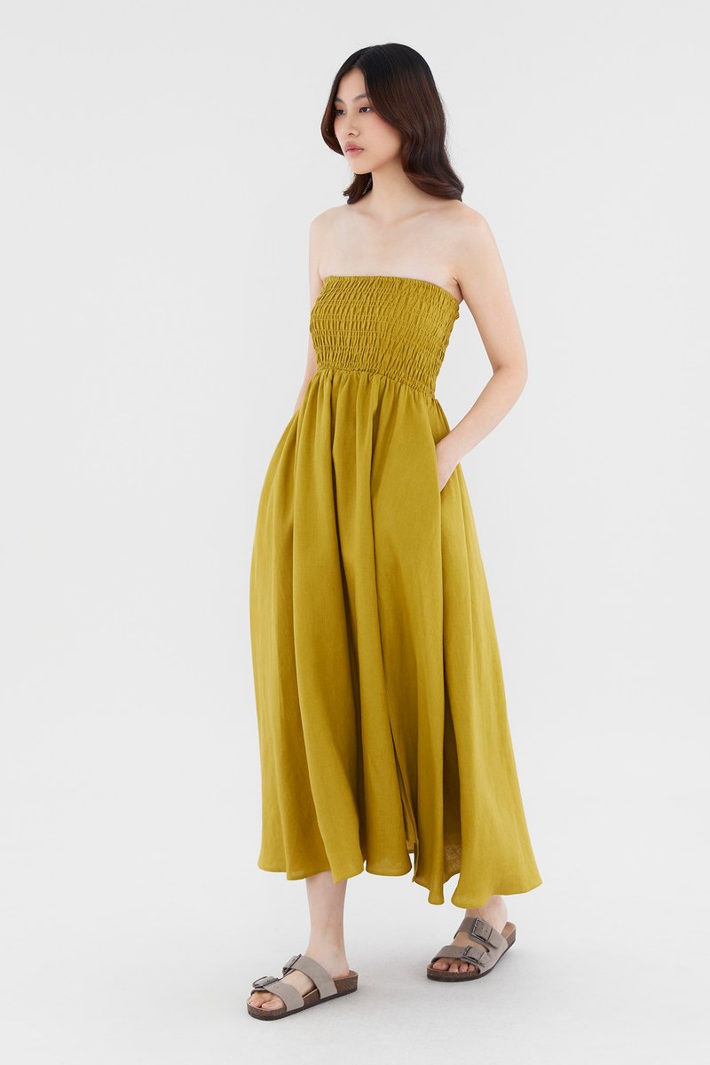 Living in linens. Cut from airy and softly tailored 100% linen, this strapless maxi dress features a shirred bodice and a side skirt split. Worn in an A-line silhouette that fits slimmer through the bodice before flaring out at the waist in a relaxed skirt.