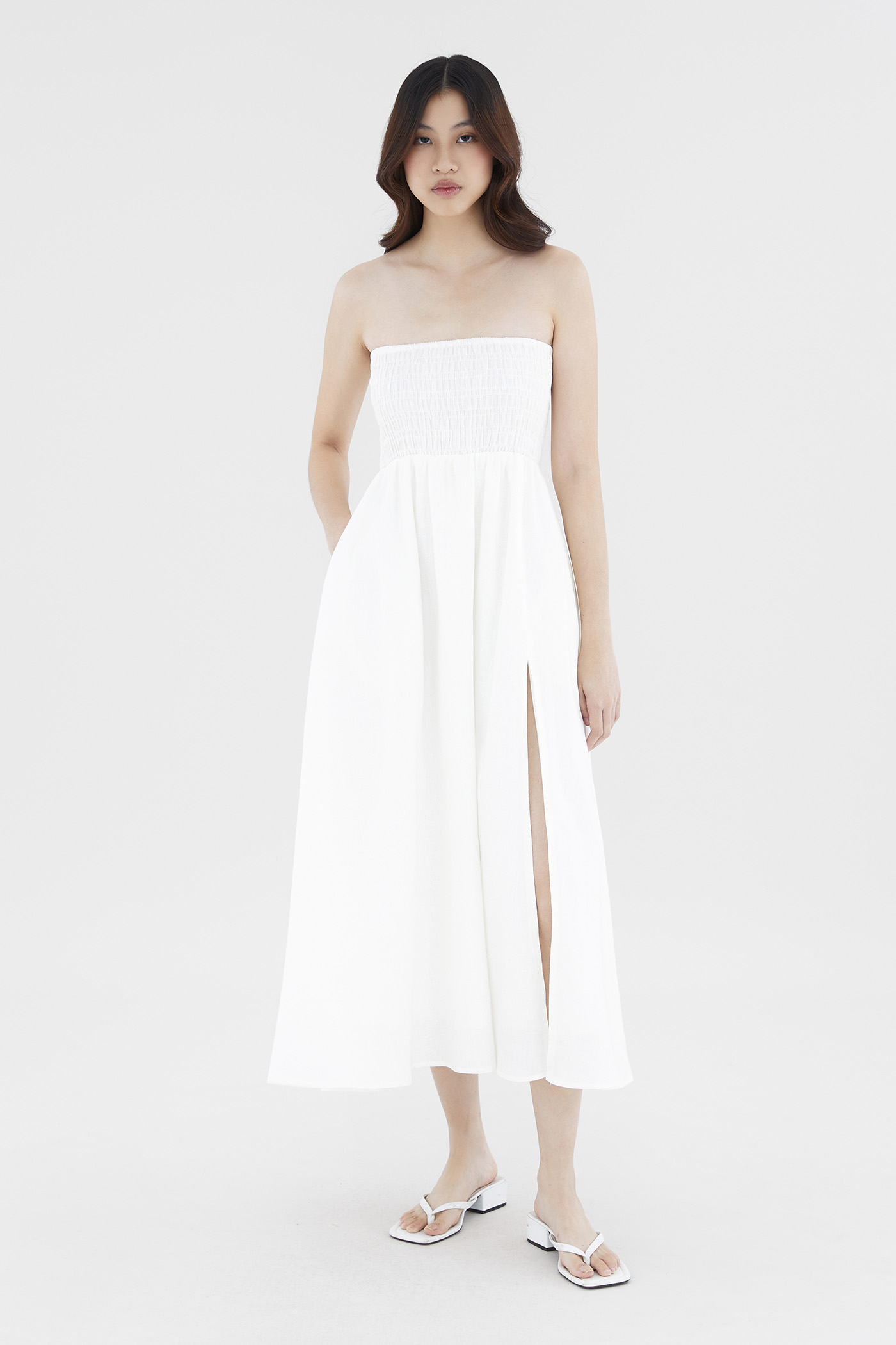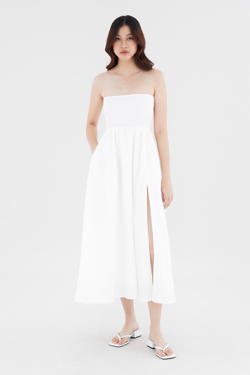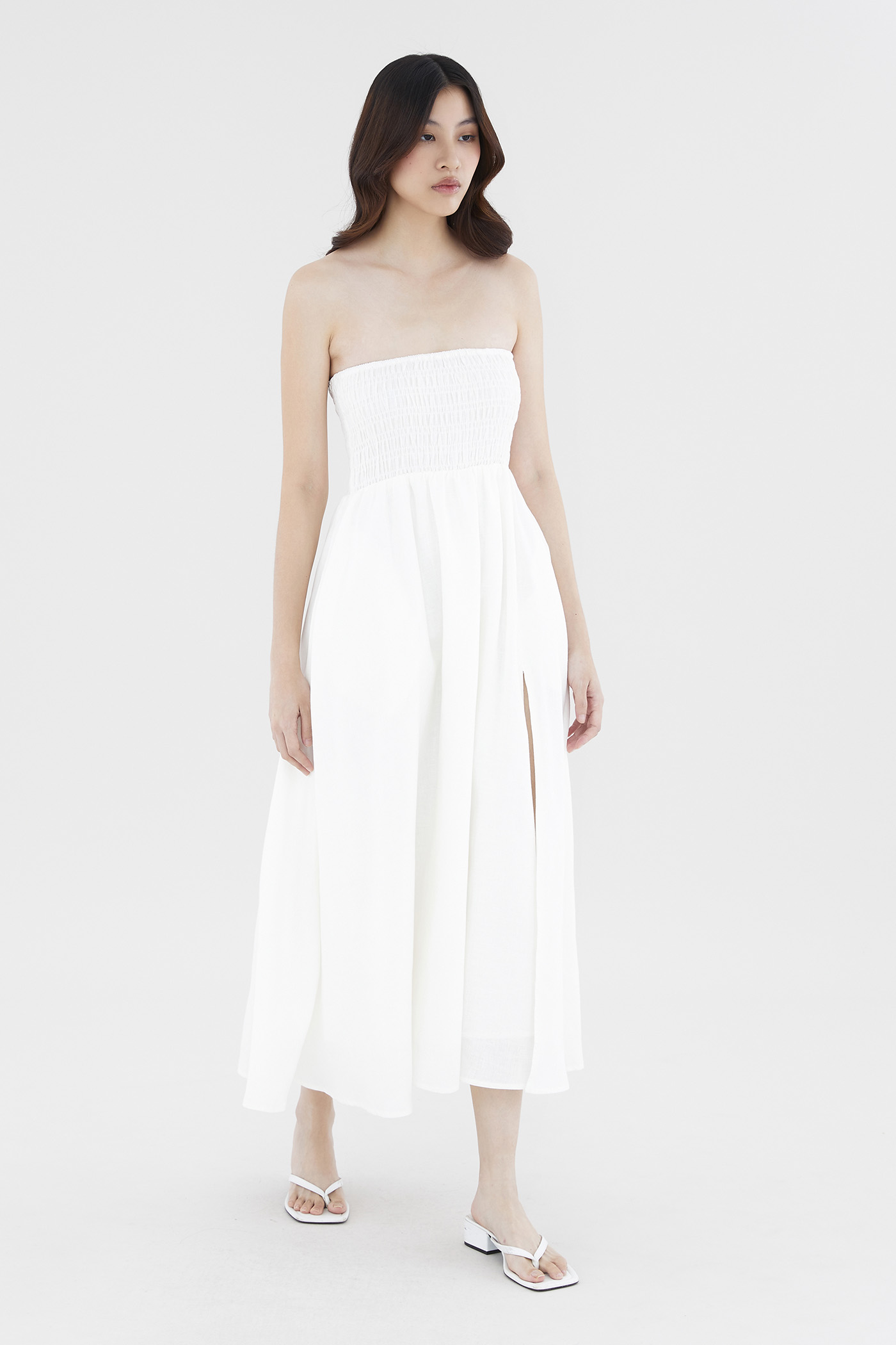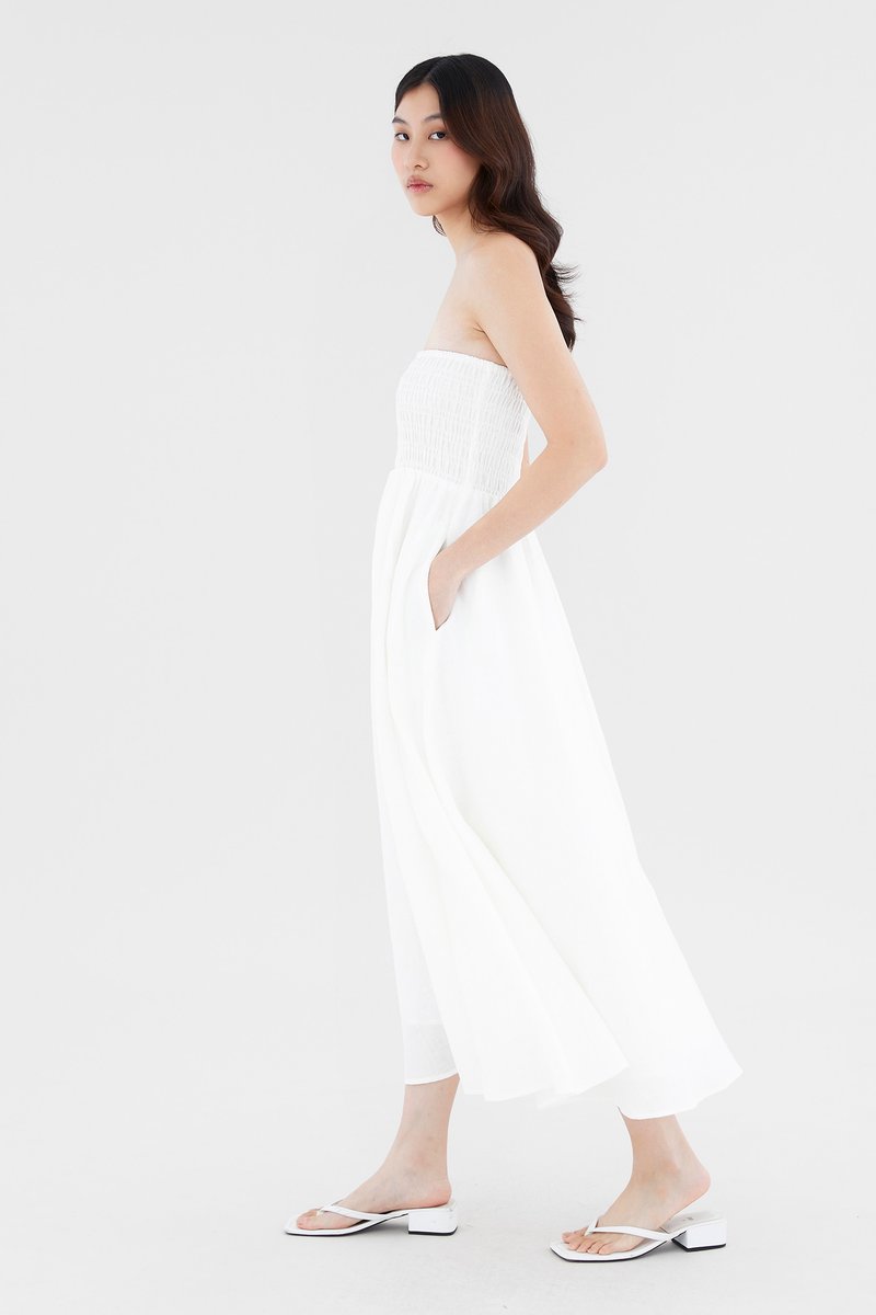 Living in linens. Cut from airy and softly tailored 100% linen, this strapless maxi dress features a shirred bodice and a side skirt split. Worn in an A-line silhouette that fits slimmer through the bodice before flaring out at the waist in a relaxed skirt.