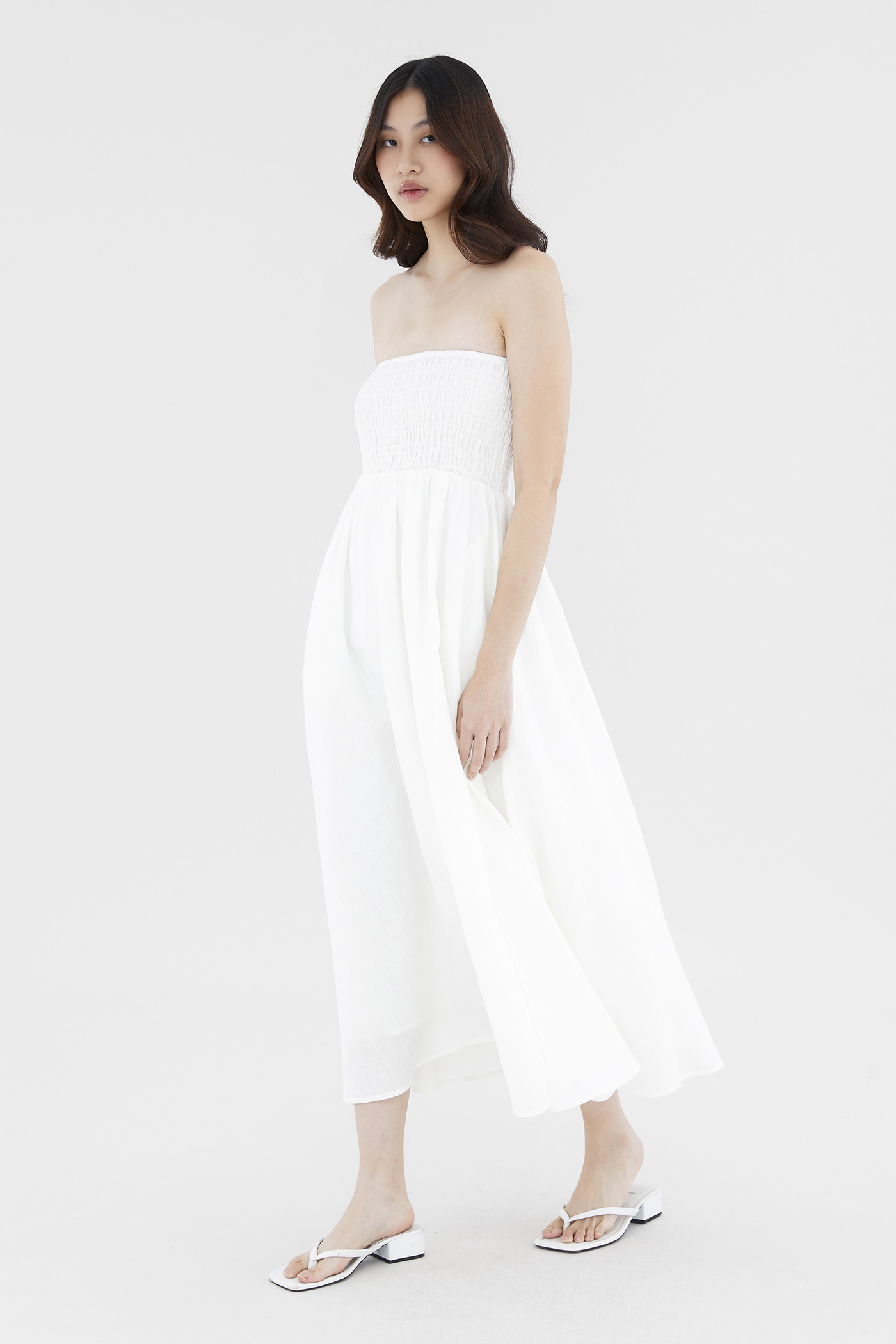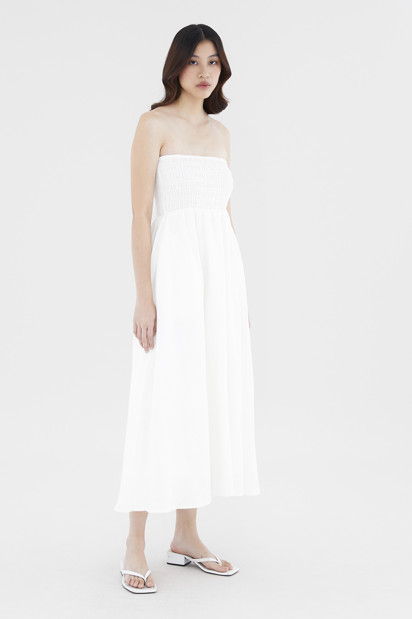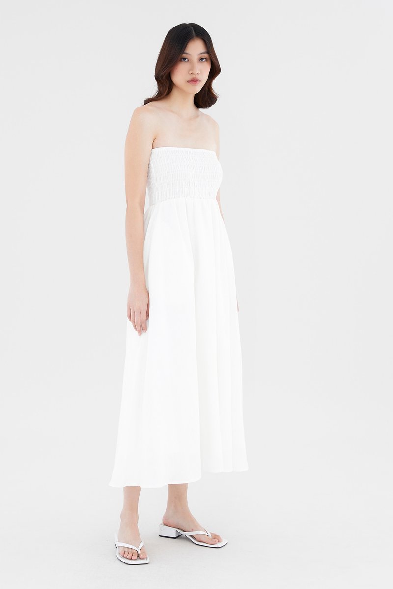 Living in linens. Cut from airy and softly tailored 100% linen, this strapless maxi dress features a shirred bodice and a side skirt split. Worn in an A-line silhouette that fits slimmer through the bodice before flaring out at the waist in a relaxed skirt.