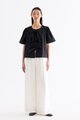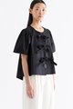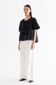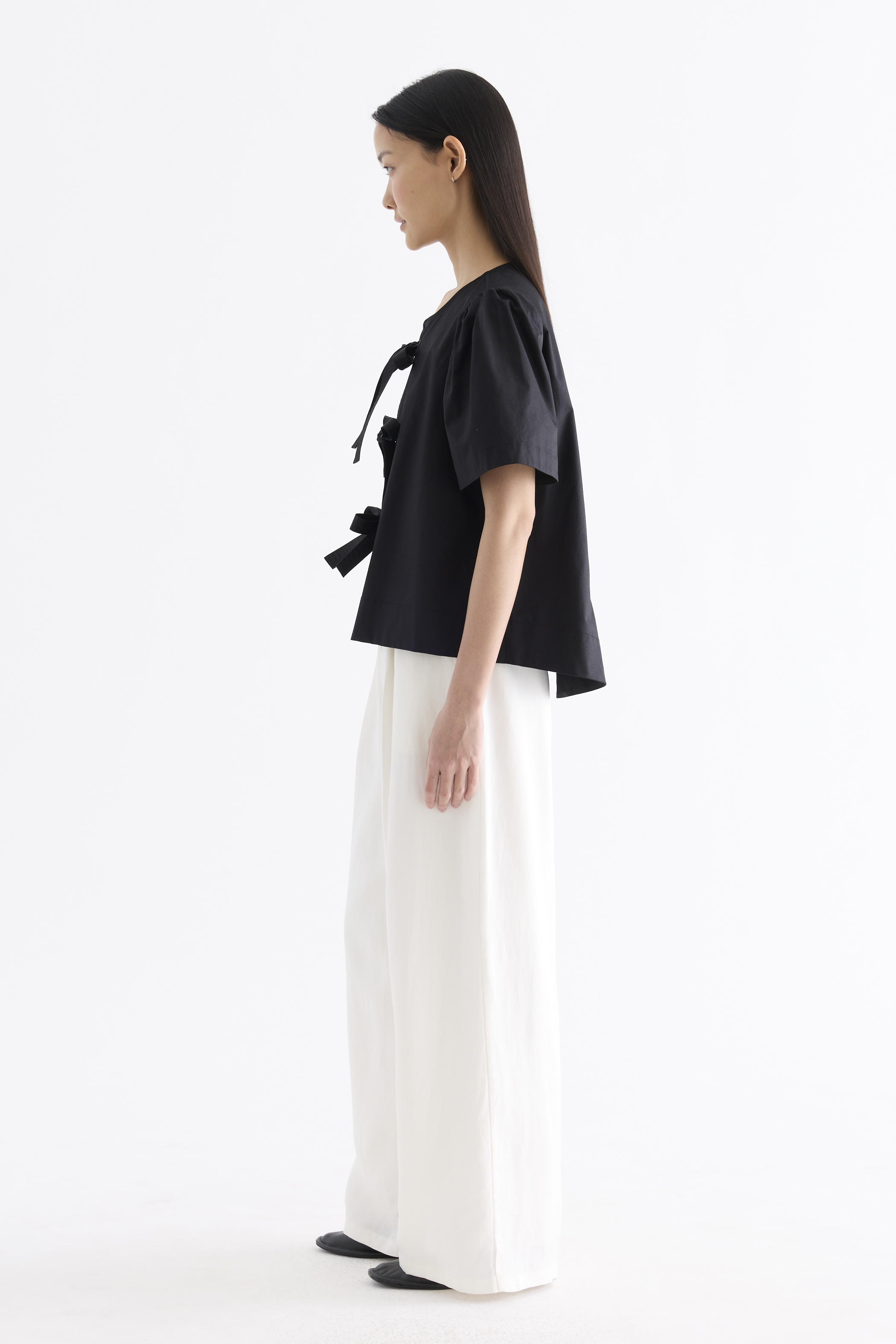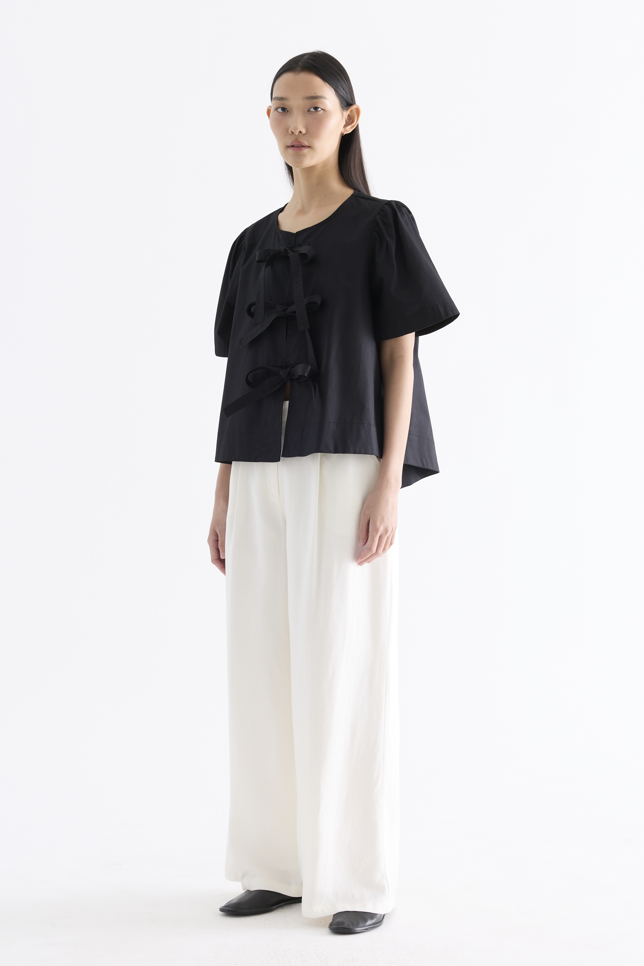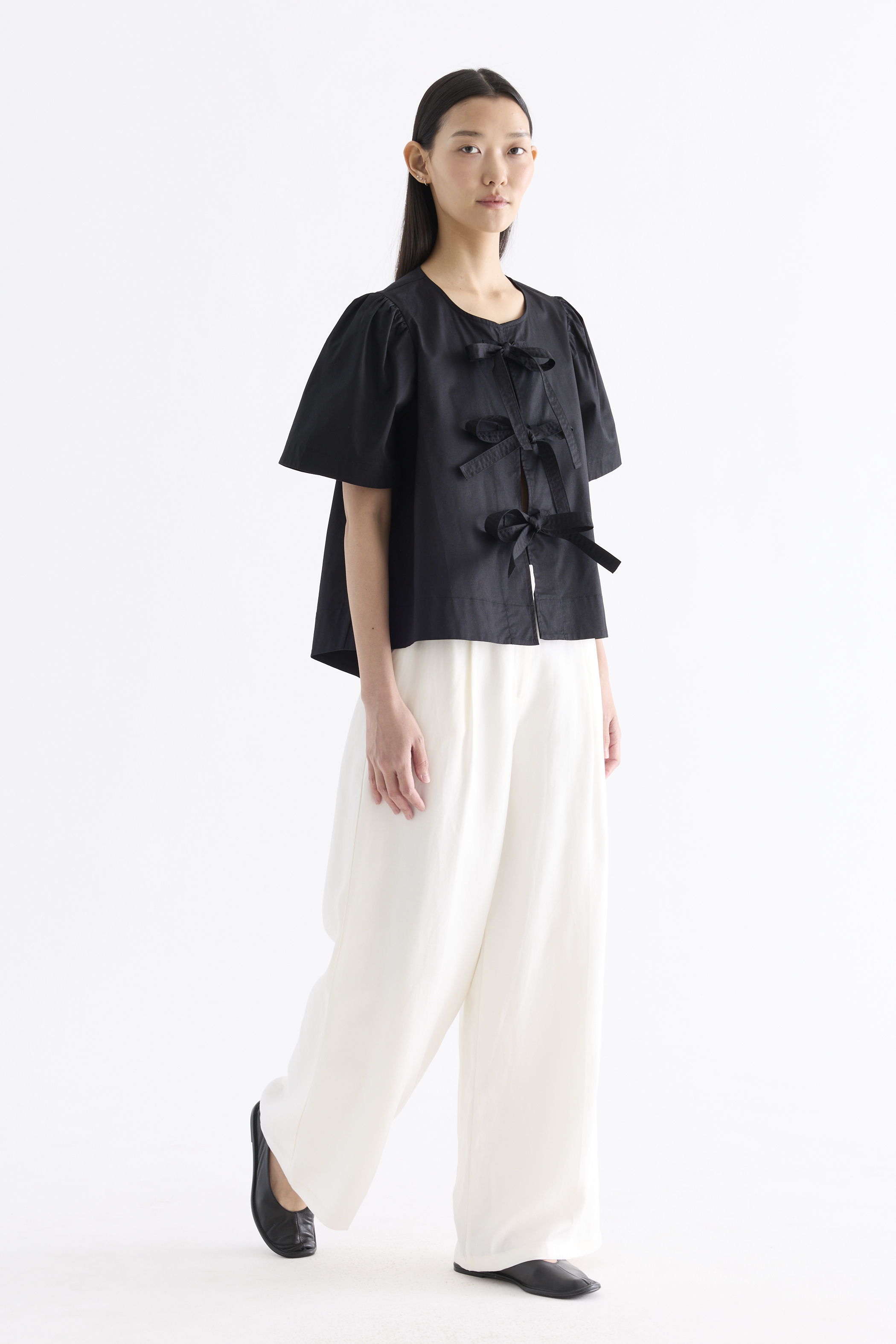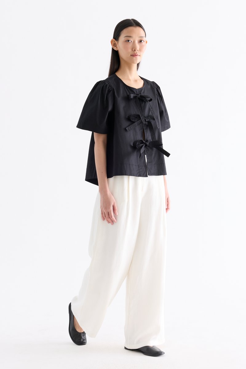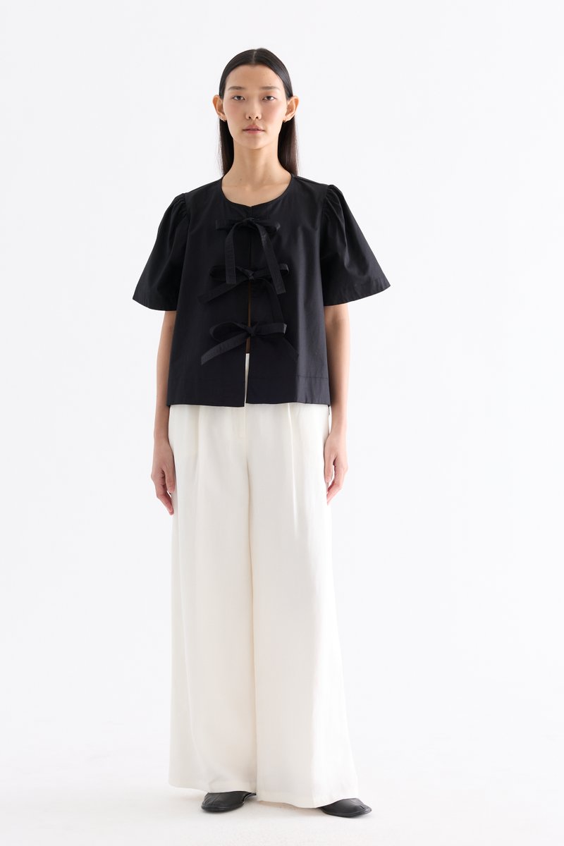 Bold bows. Cut from crisp and softly structured cotton, this blouse features a round neckline, short, slightly puffy sleeves and an open front with tie-strap closures. Worn in a relaxed fit.