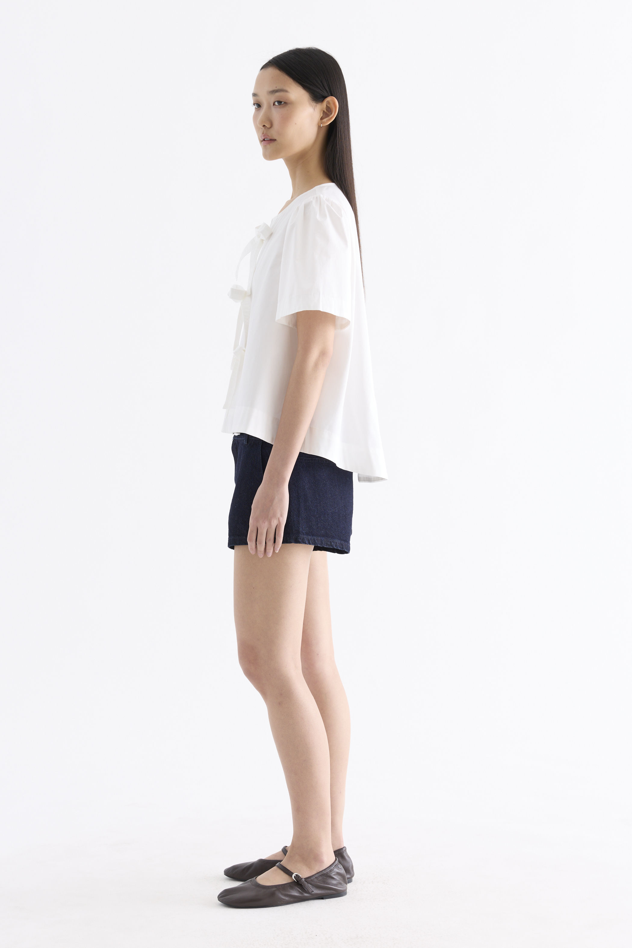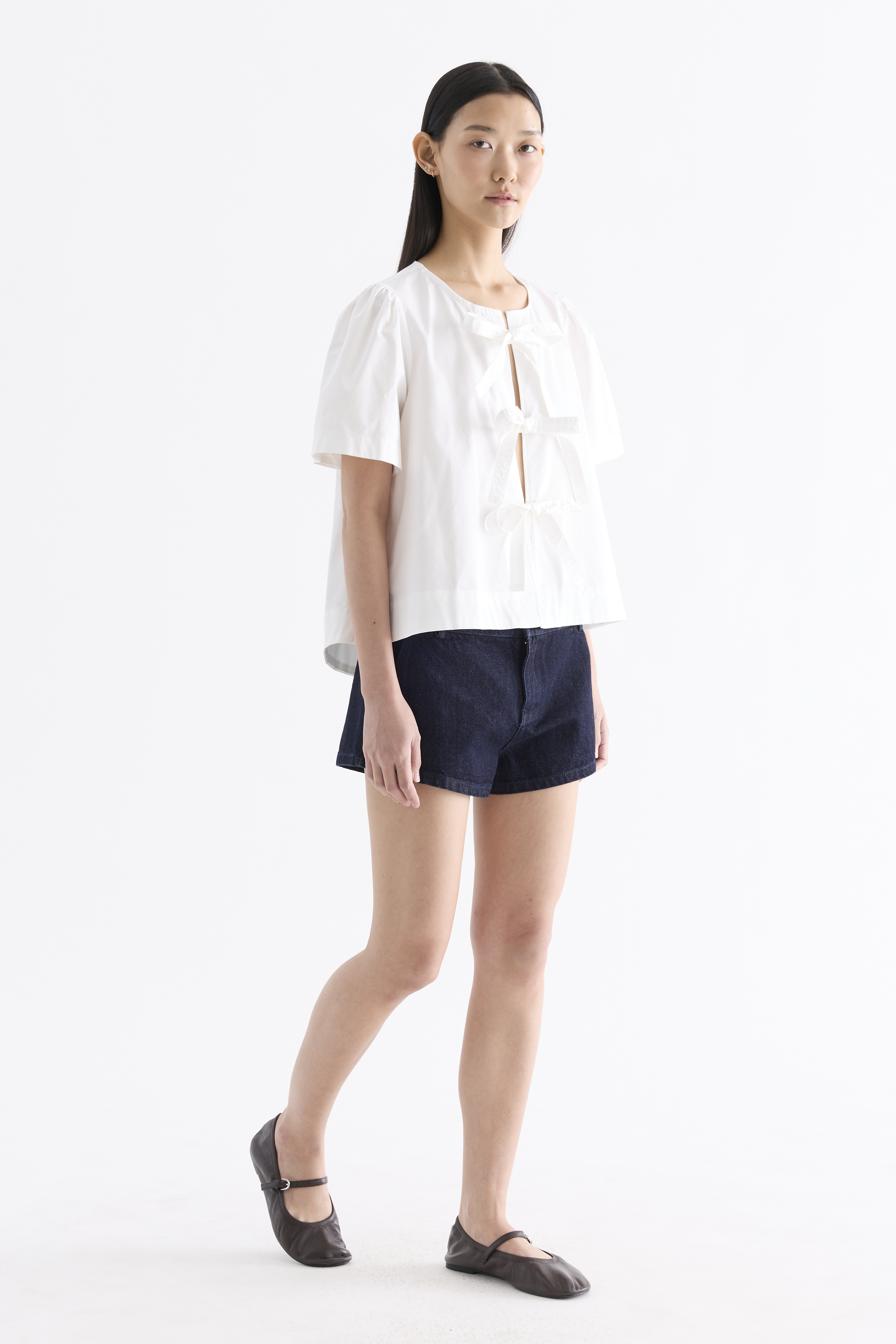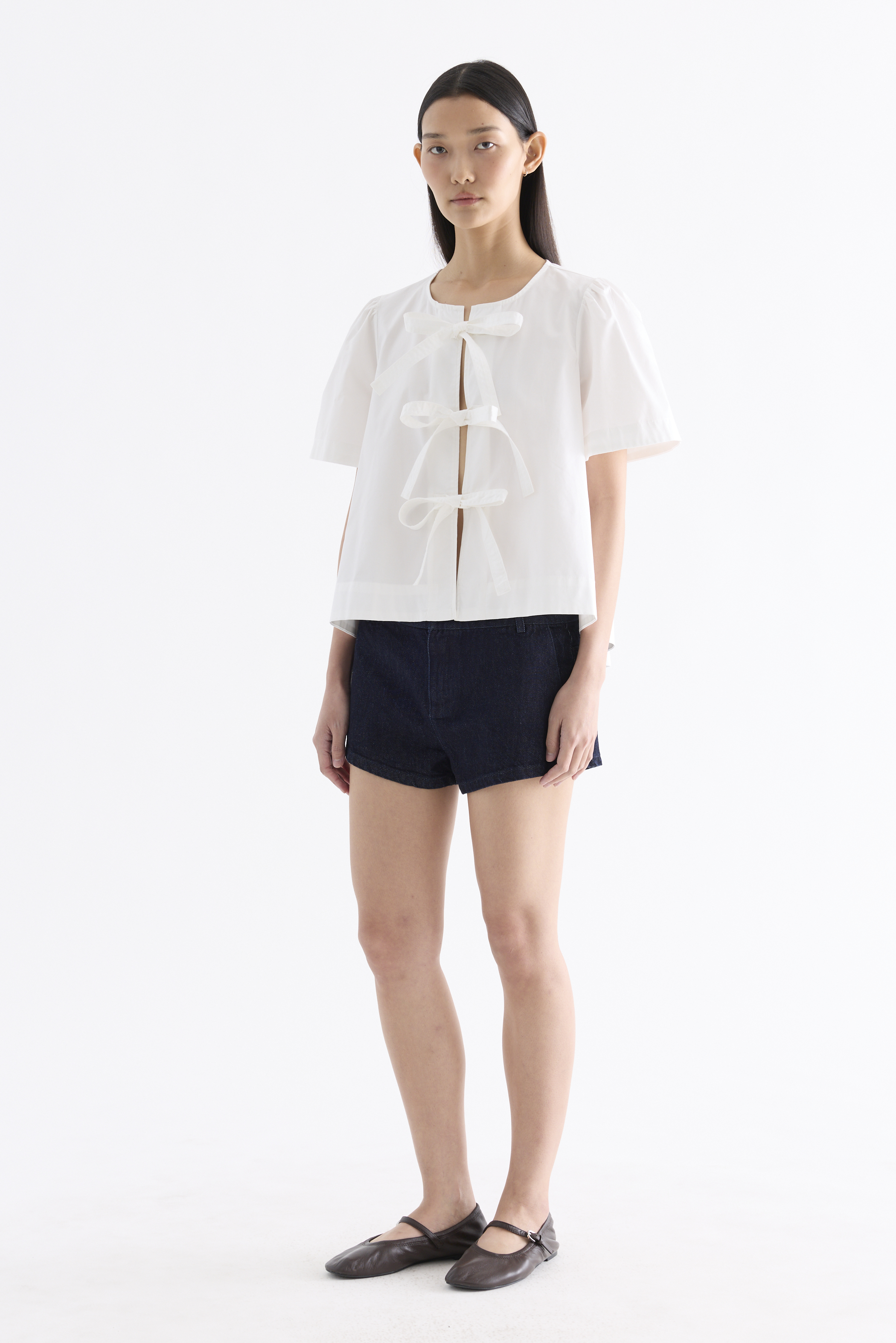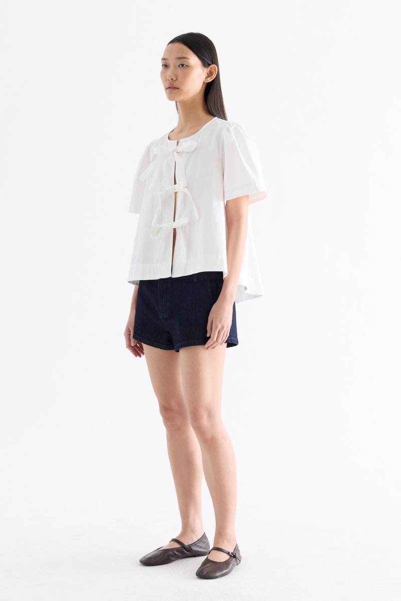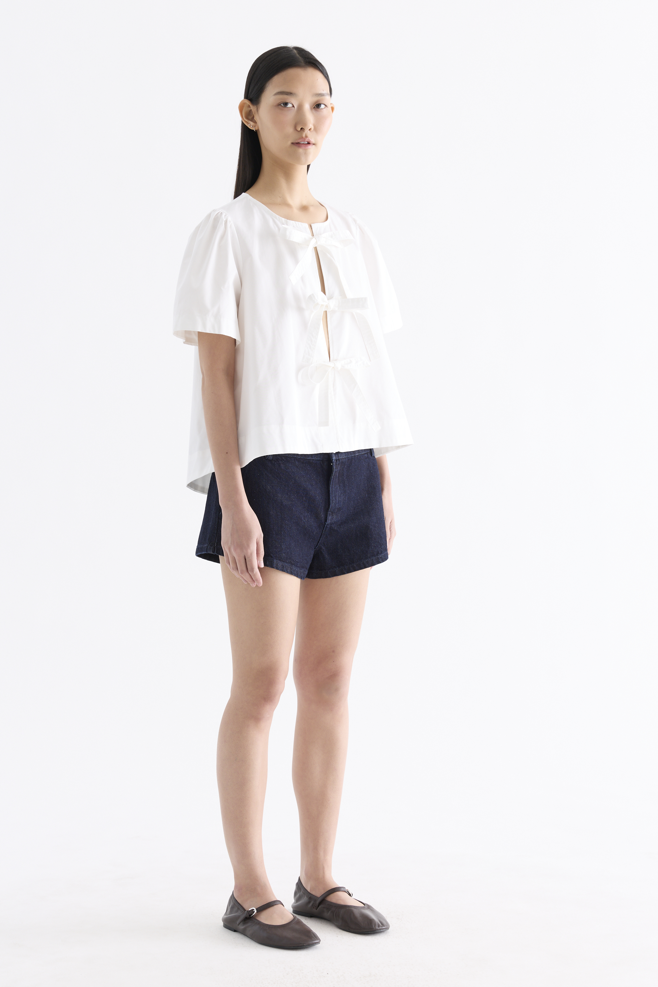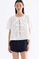 Bold bows. Cut from crisp and softly structured cotton, this blouse features a round neckline, short, slightly puffy sleeves and an open front with tie-strap closures. Worn in a relaxed fit.
