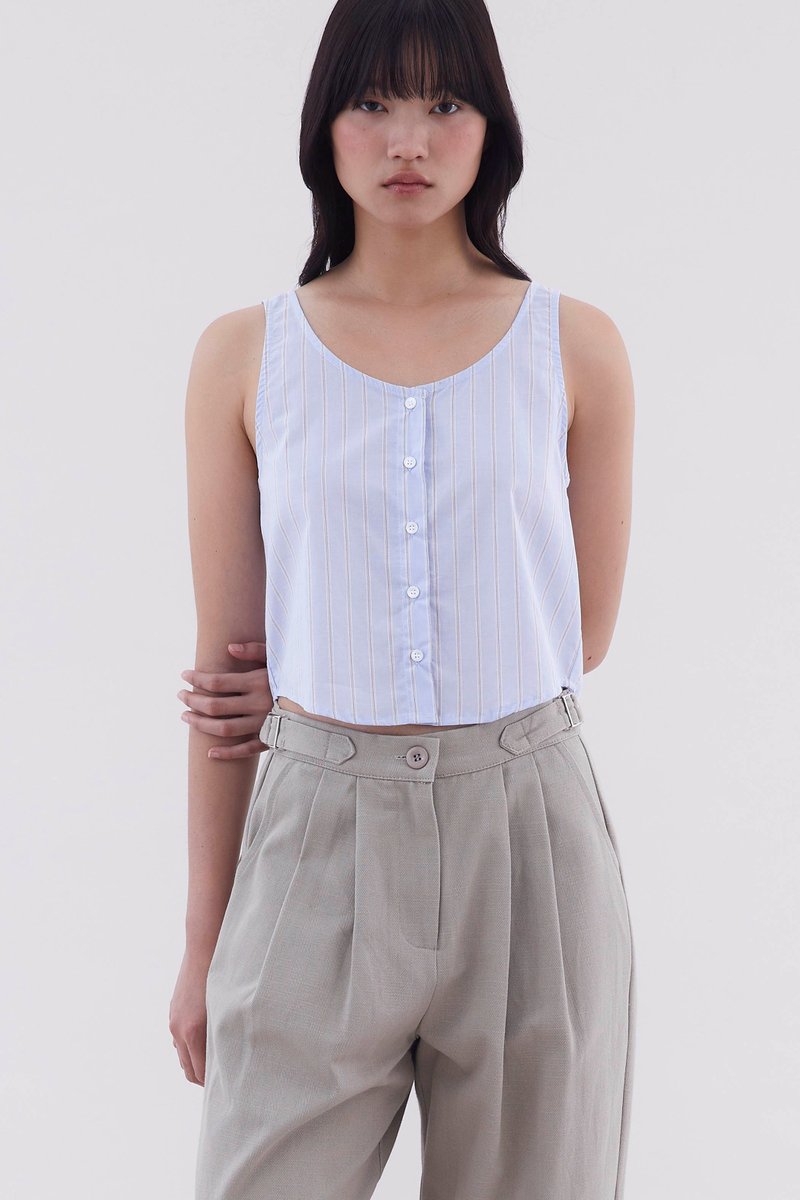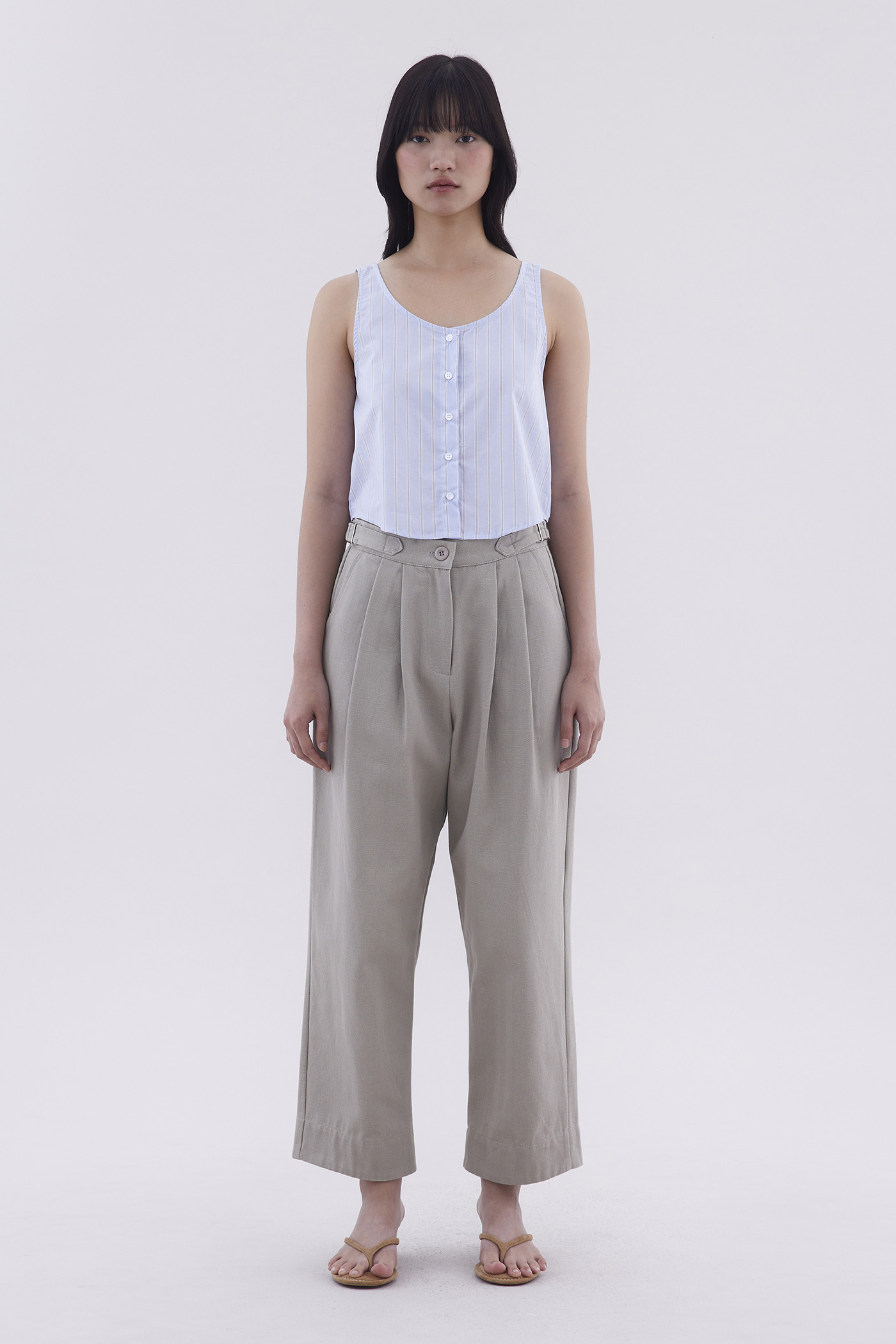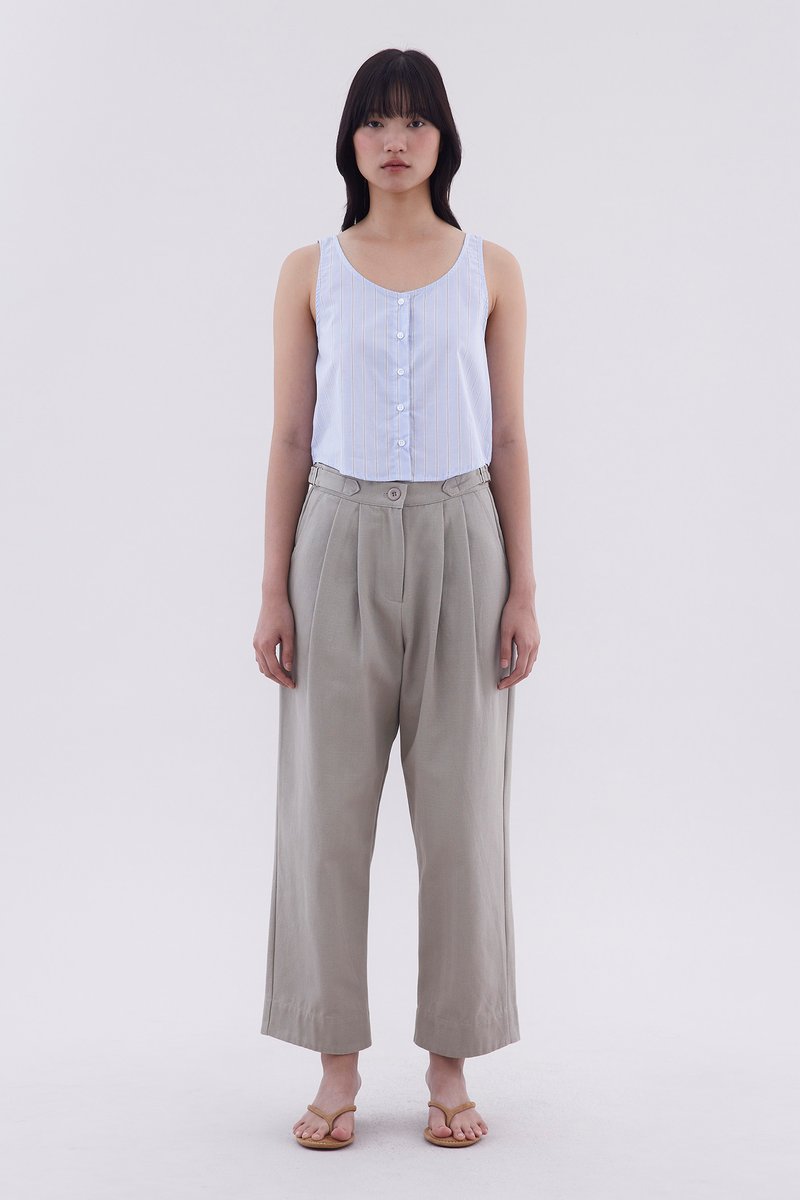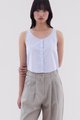 Cool off. Made from smooth and softly structured cotton, this sleeveless top features a wide round neckline and a front button-down closure. Fits relaxed in a cropped length.