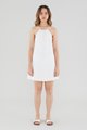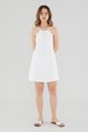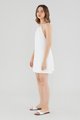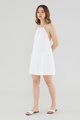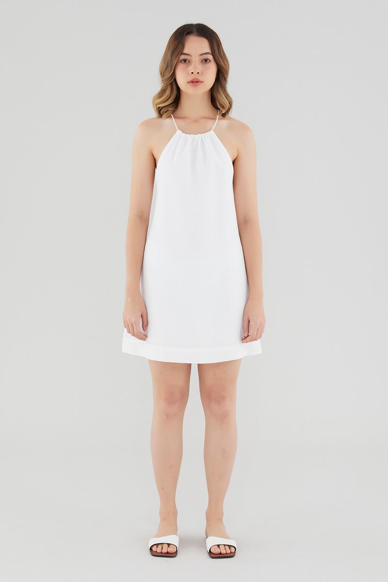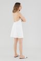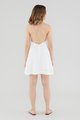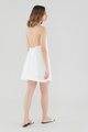 Catch some rays. Cut from smooth and softly structured fabric, this sleeveless mini dress features a round drawstring neckline, an open back with non-adjustable, criss-crossing straps and a back zip closure. Worn in a relaxed waistless fit.