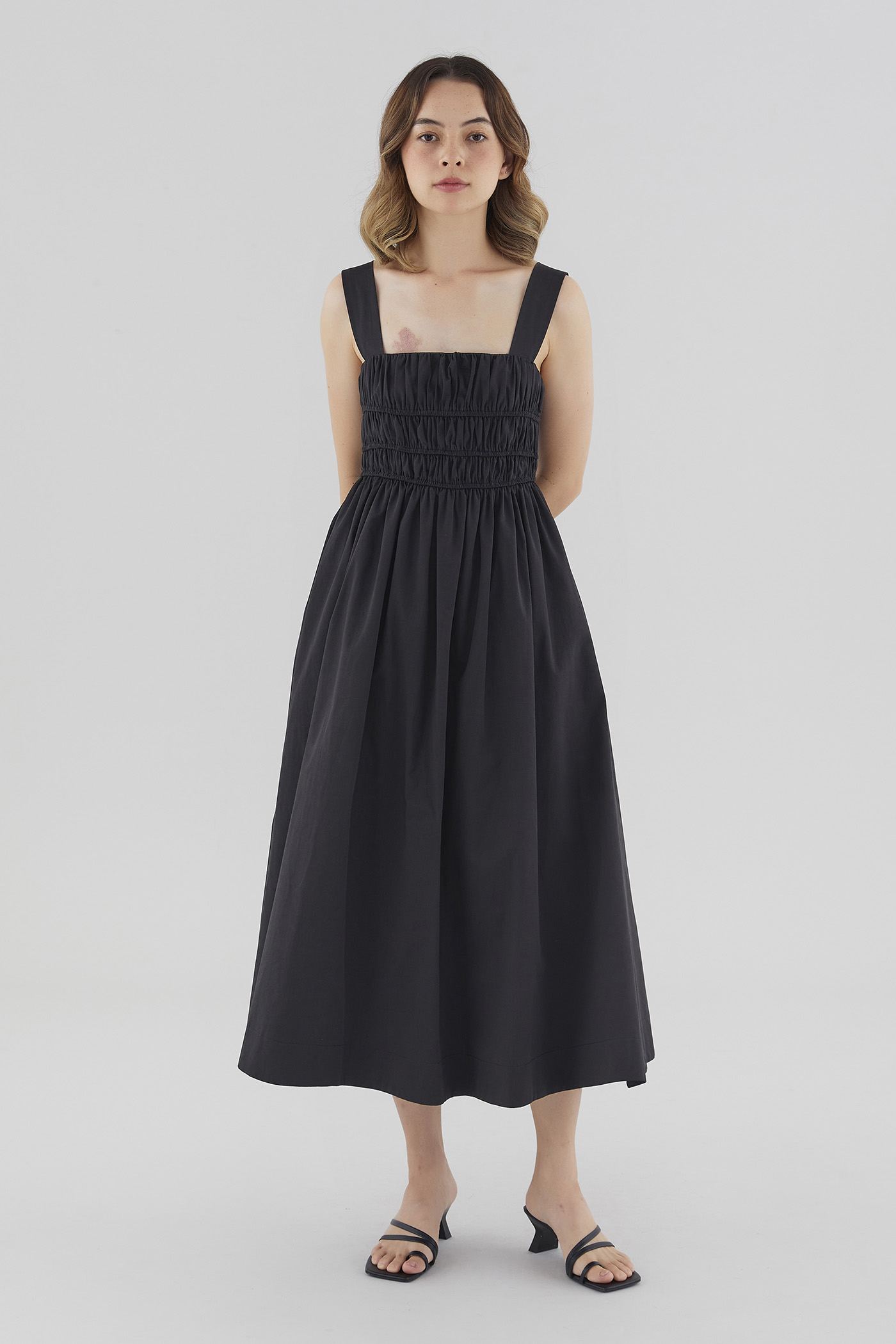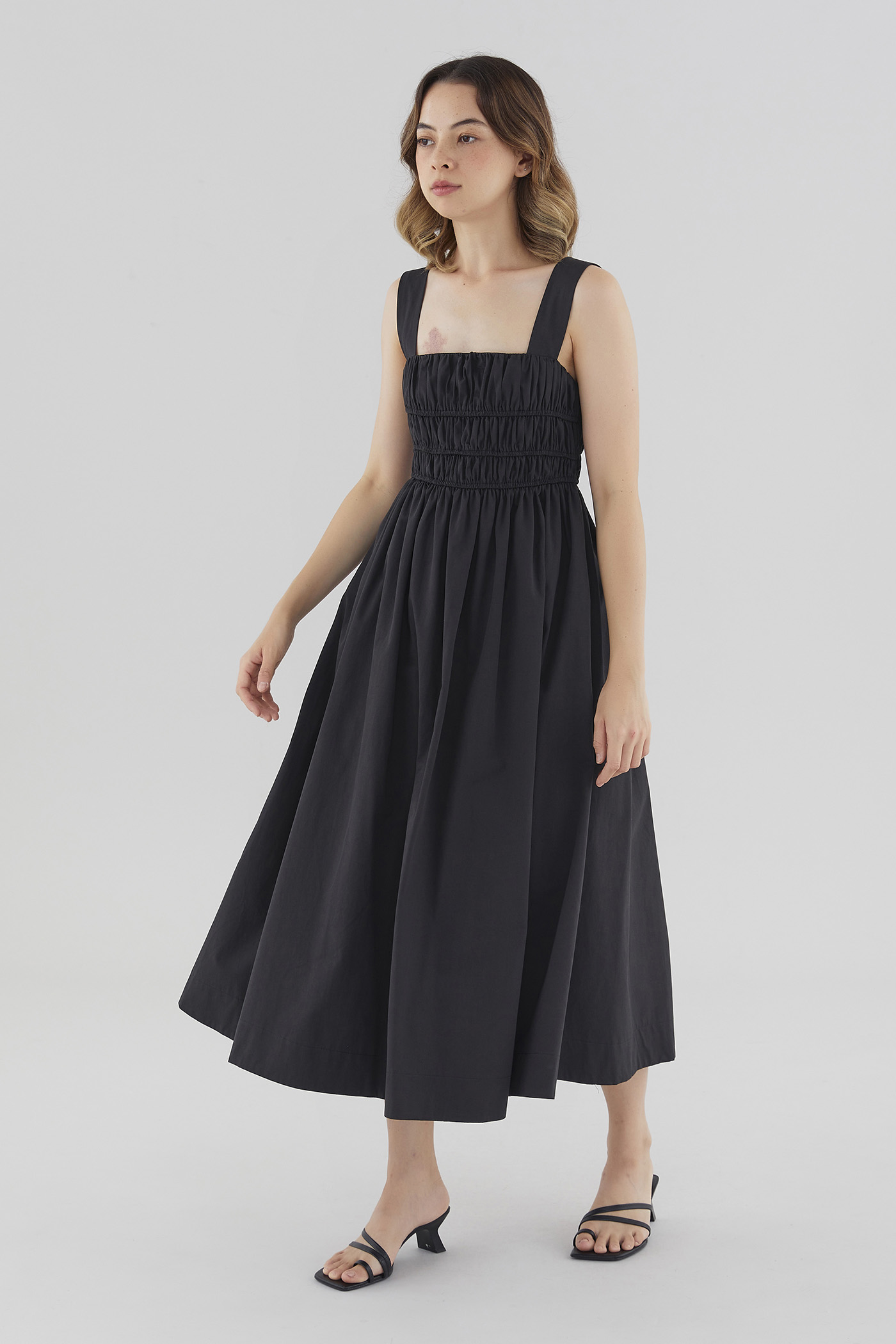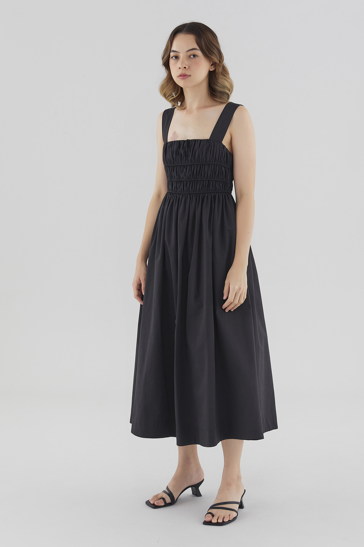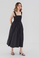 Everyday textures. Cut from non-stretch and softly structured cotton, this sleeveless maxi dress features a square neckline, wide non-adjustable straps, an elasticated ruched bodice and a back zip closure. Fits slimmer through the bust before flaring out in a relaxed skirt.