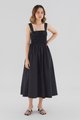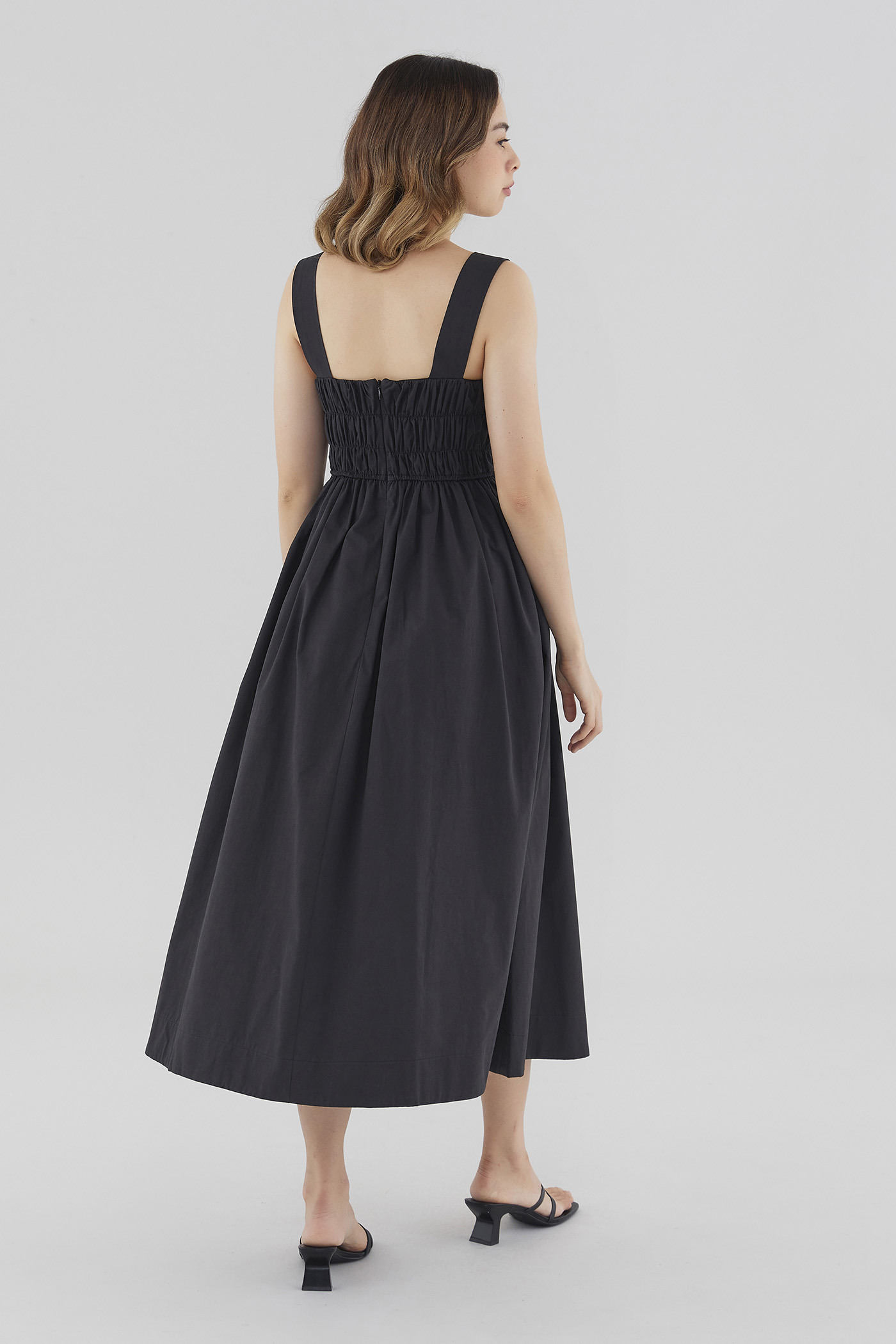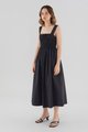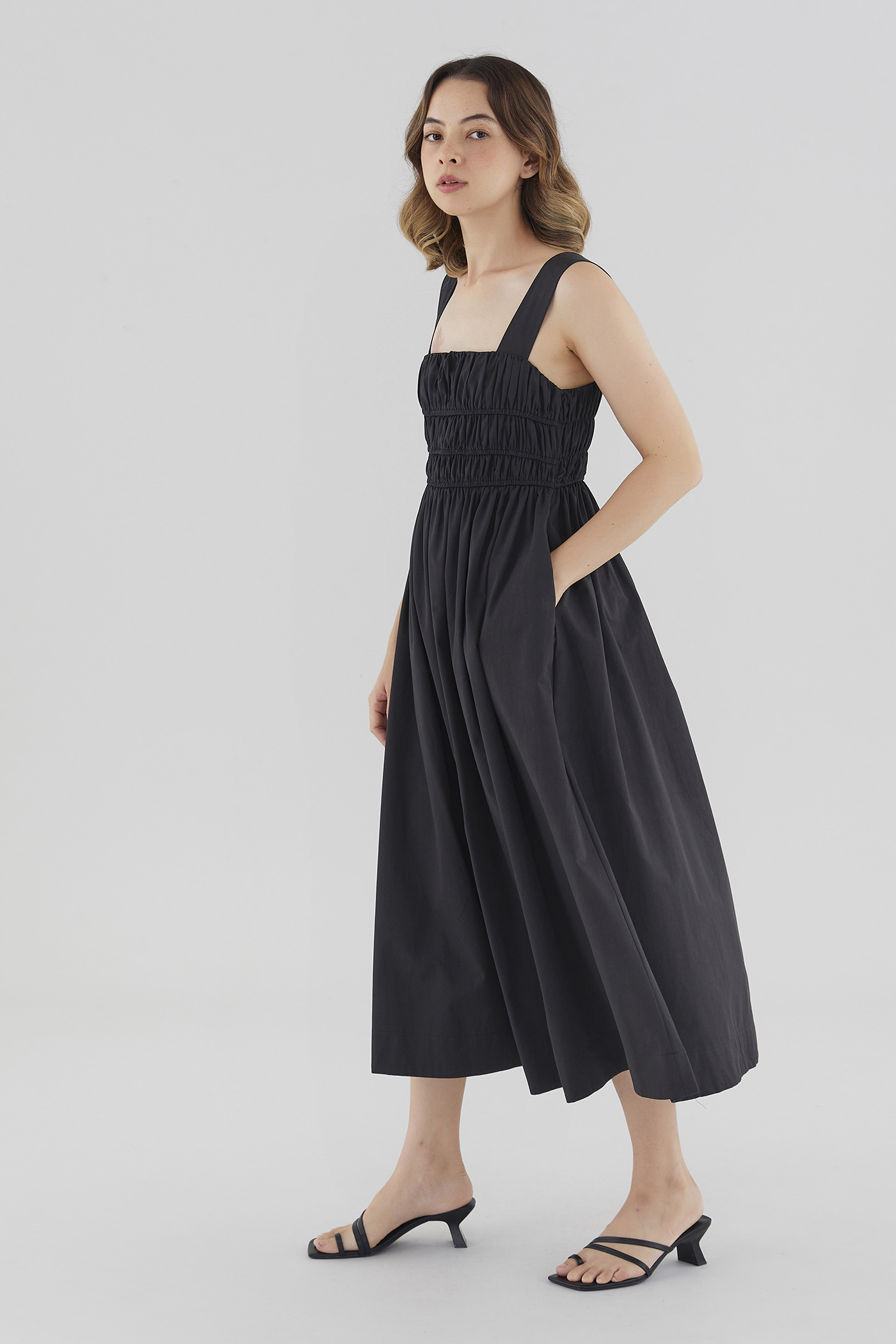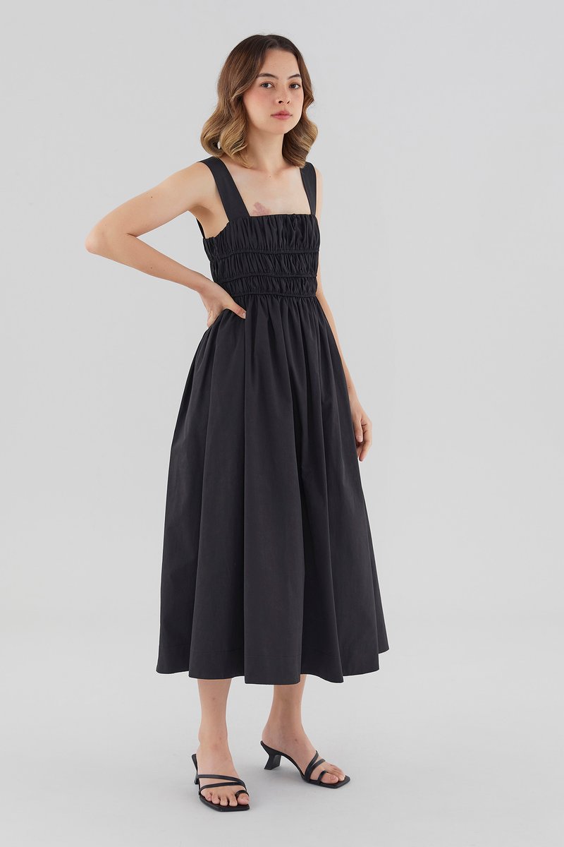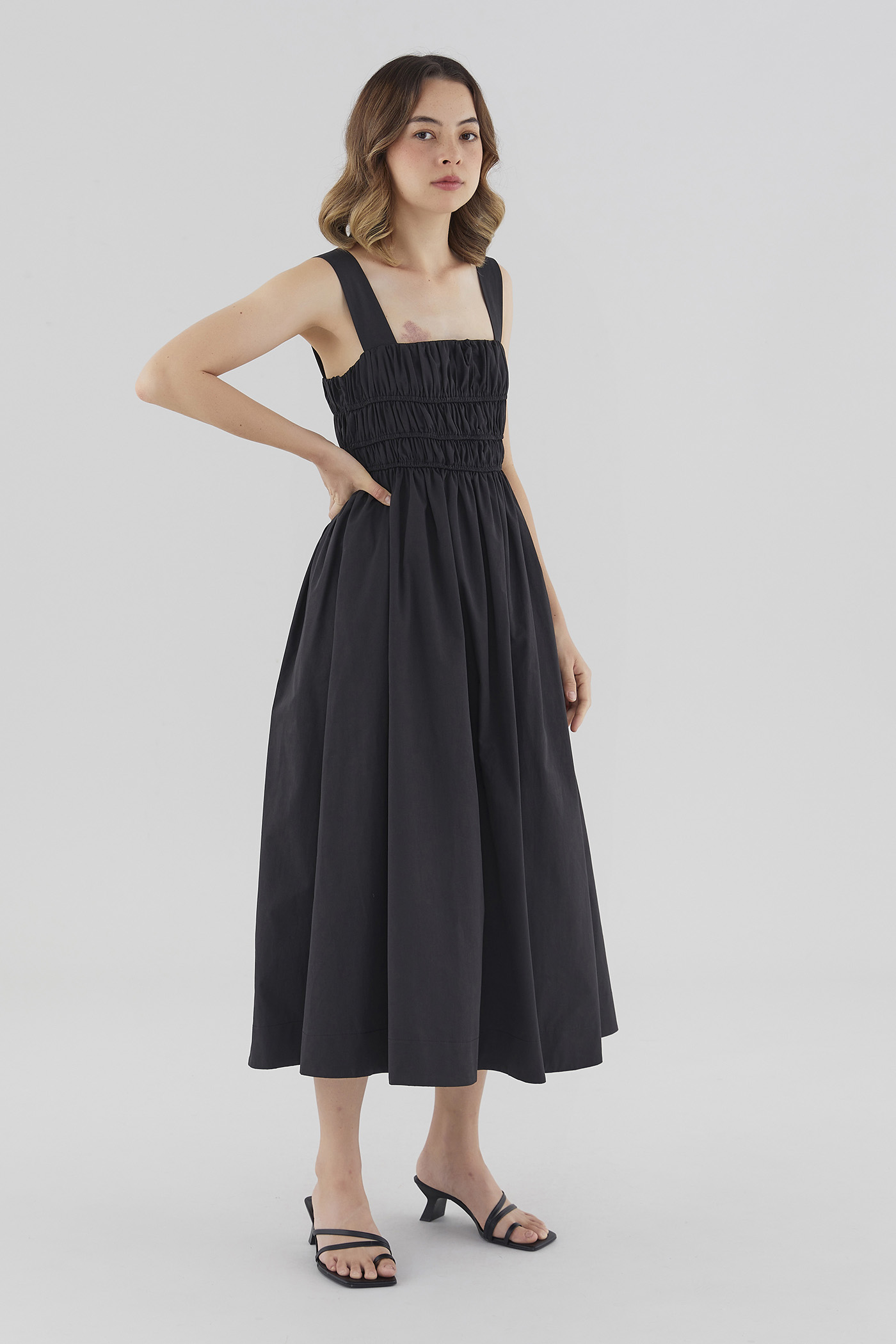 Everyday textures. Cut from non-stretch and softly structured cotton, this sleeveless maxi dress features a square neckline, wide non-adjustable straps, an elasticated ruched bodice and a back zip closure. Fits slimmer through the bust before flaring out in a relaxed skirt.