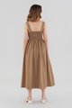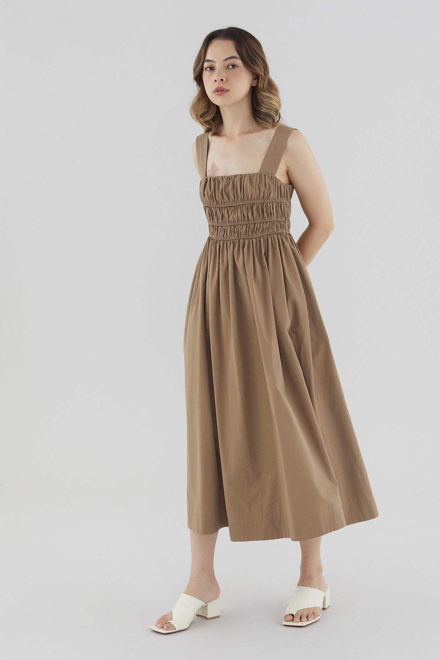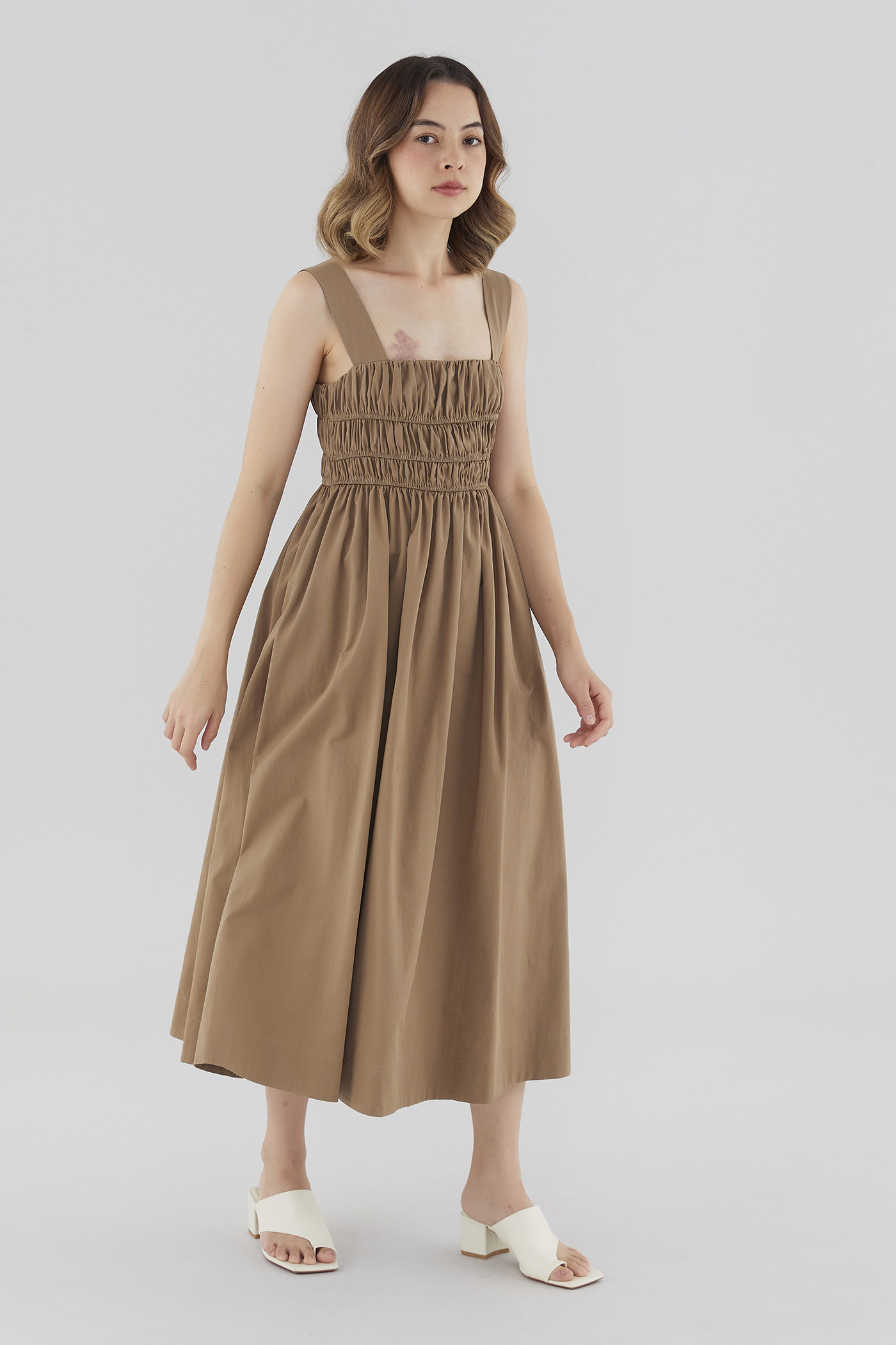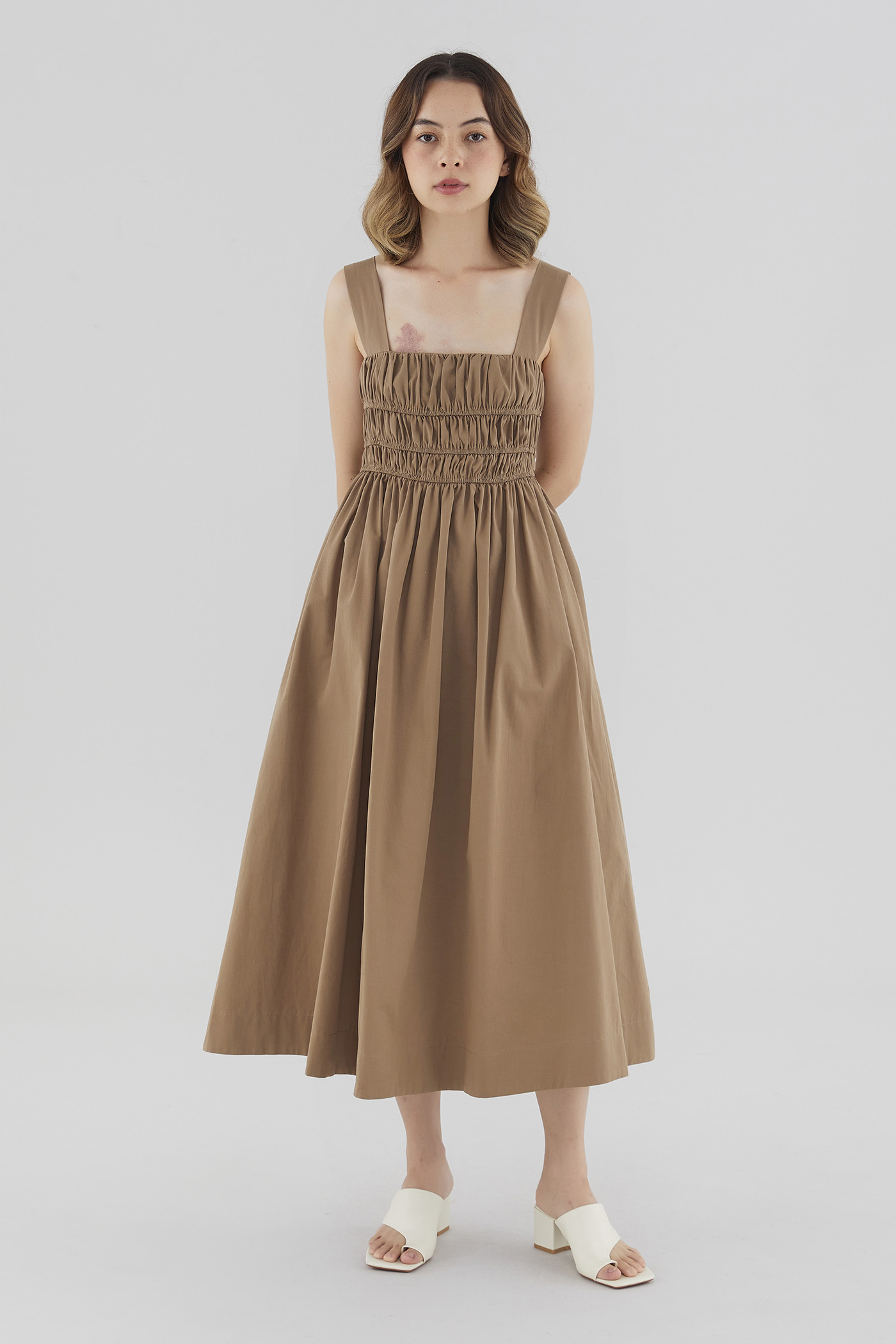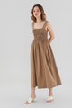 Everyday textures. Cut from non-stretch and softly structured cotton, this sleeveless maxi dress features a square neckline, wide non-adjustable straps, an elasticated ruched bodice and a back zip closure. Fits slimmer through the bust before flaring out in a relaxed skirt.