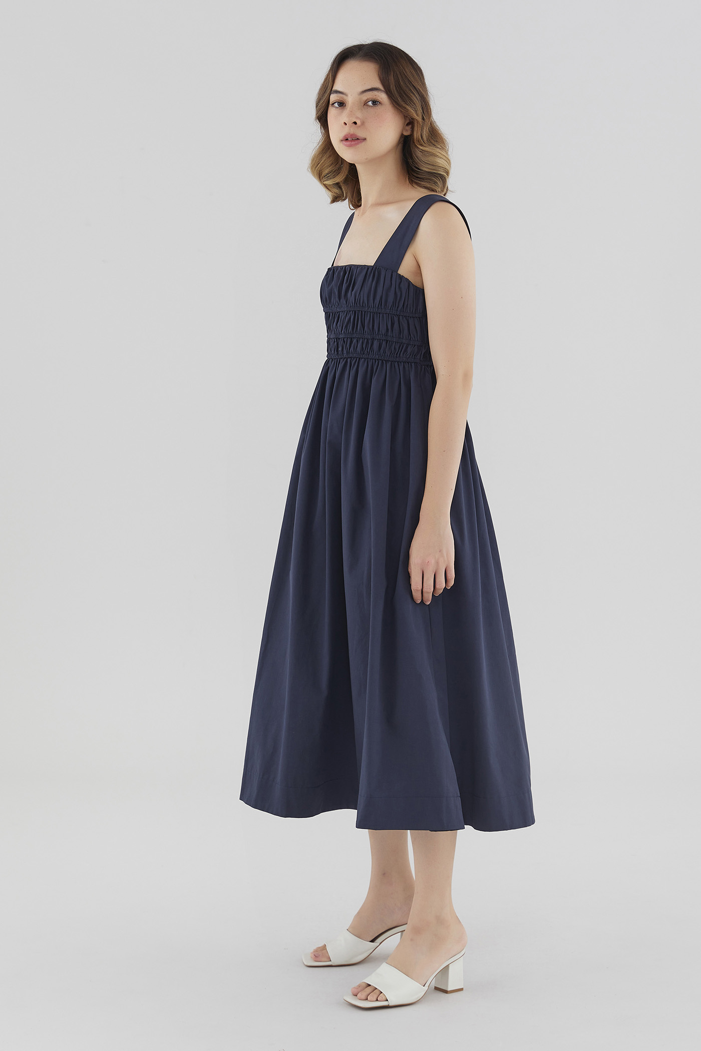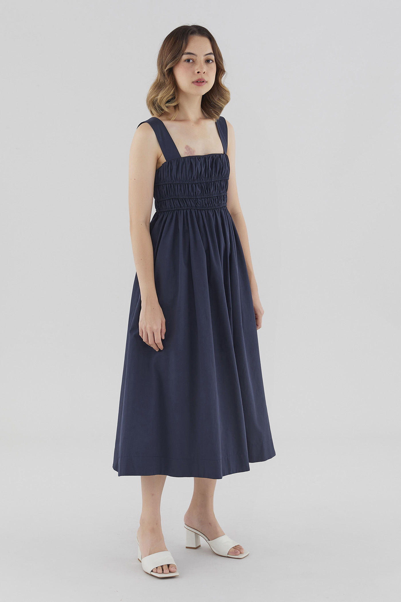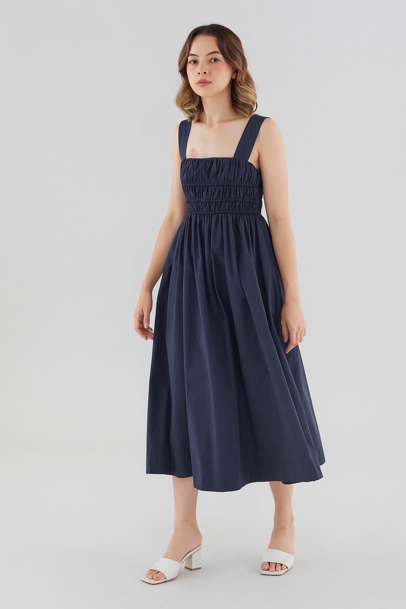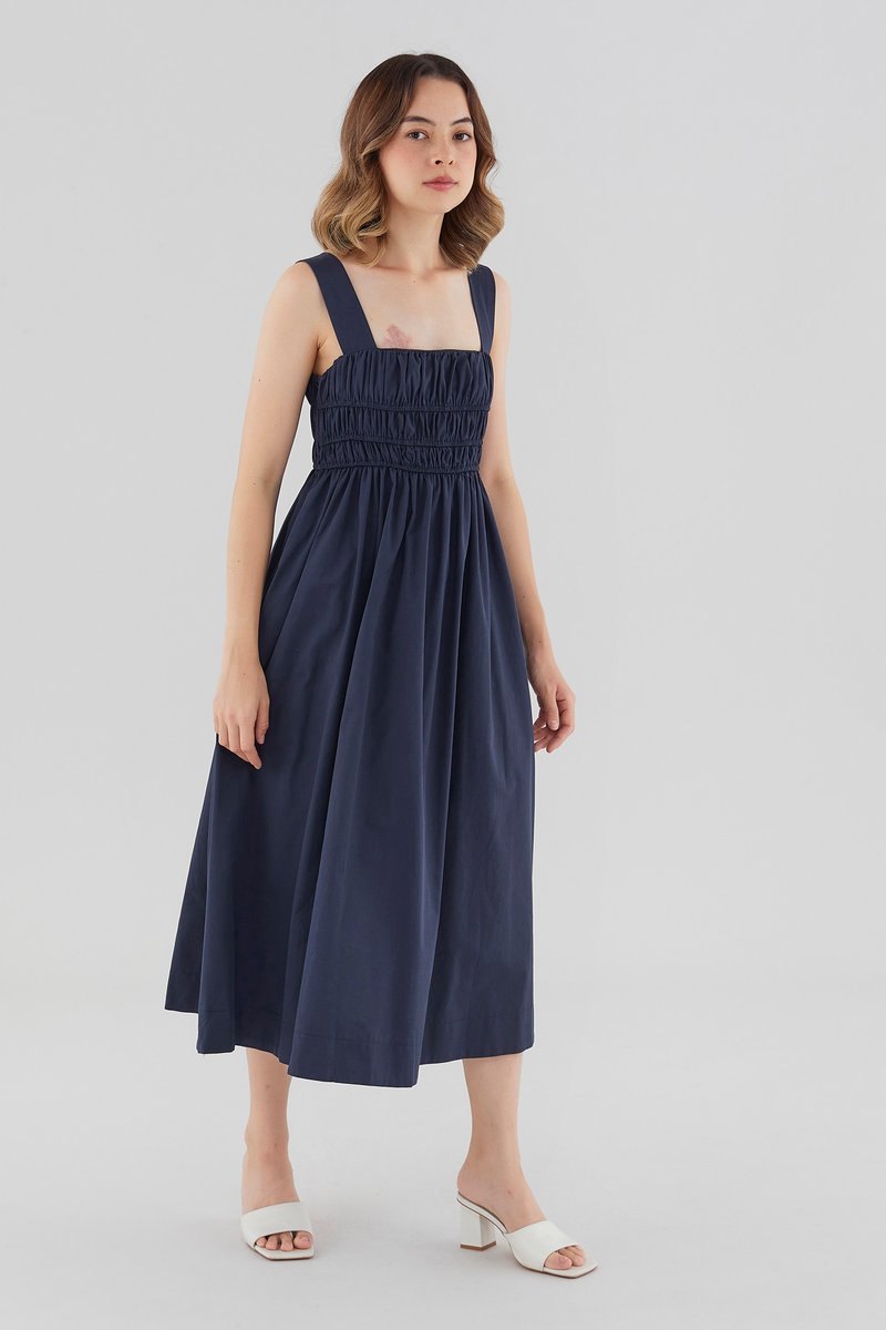 Everyday textures. Cut from non-stretch and softly structured cotton, this sleeveless maxi dress features a square neckline, wide non-adjustable straps, an elasticated ruched bodice and a back zip closure. Fits slimmer through the bust before flaring out in a relaxed skirt.