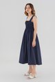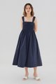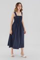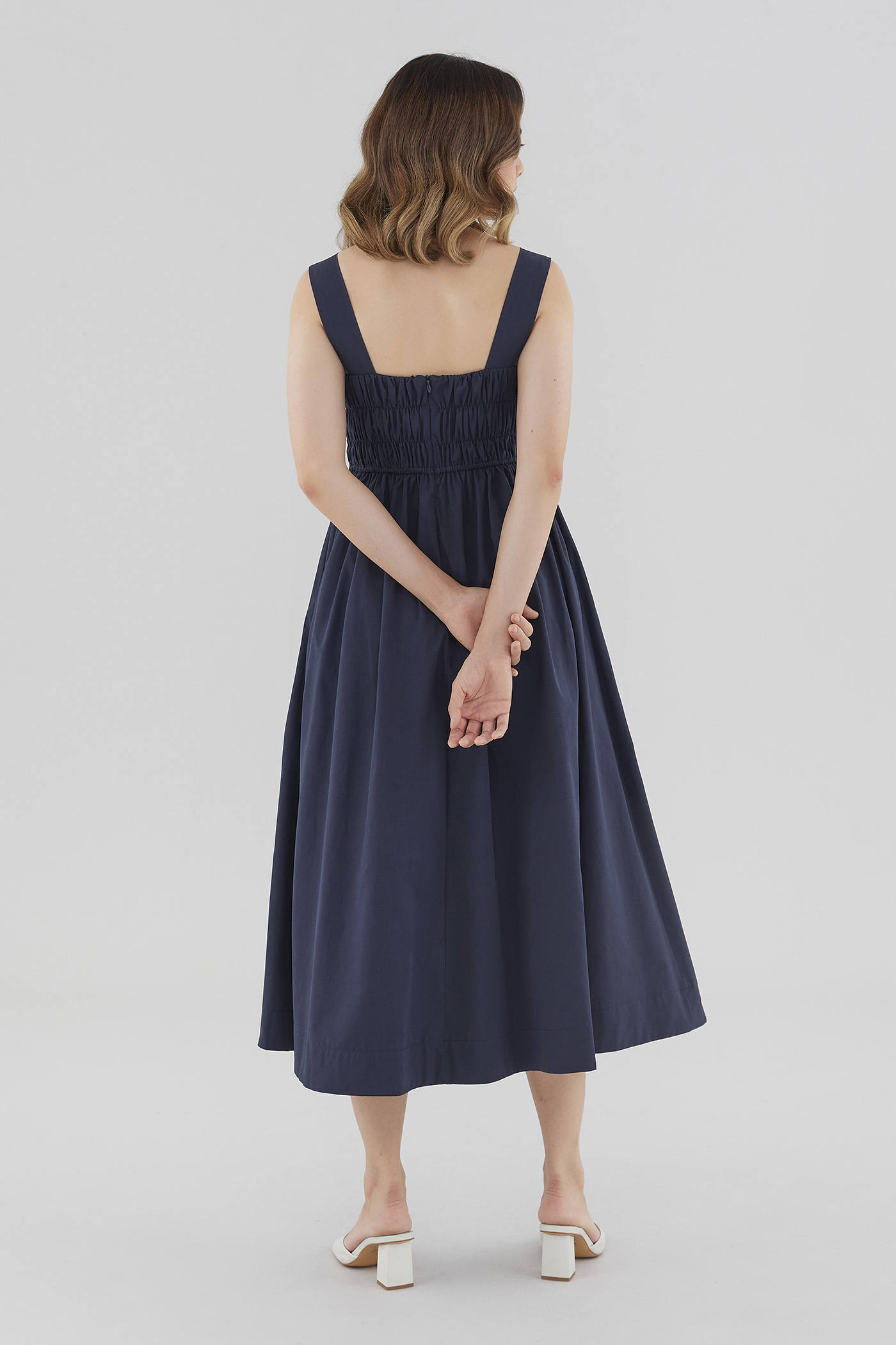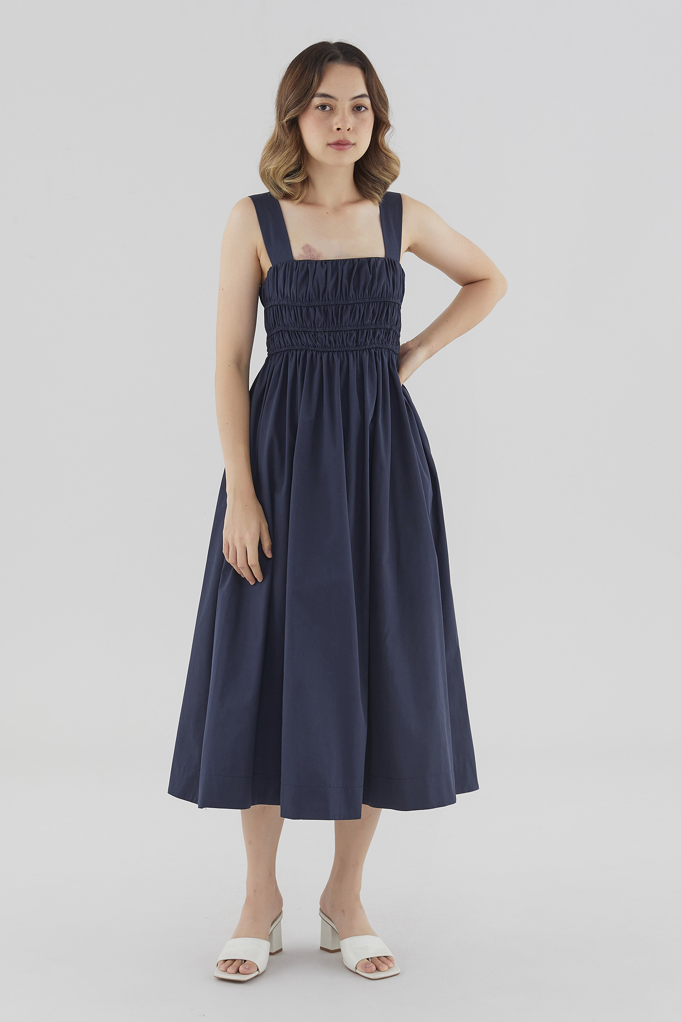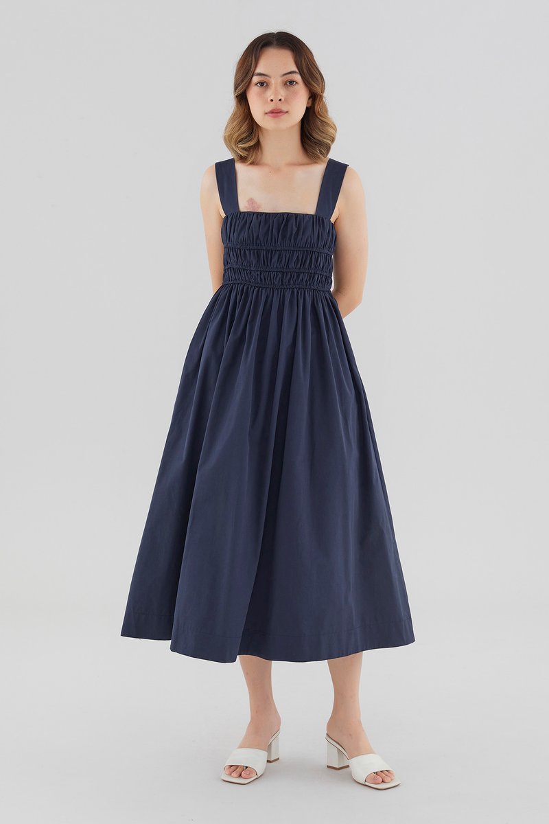 Everyday textures. Cut from non-stretch and softly structured cotton, this sleeveless maxi dress features a square neckline, wide non-adjustable straps, an elasticated ruched bodice and a back zip closure. Fits slimmer through the bust before flaring out in a relaxed skirt.