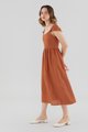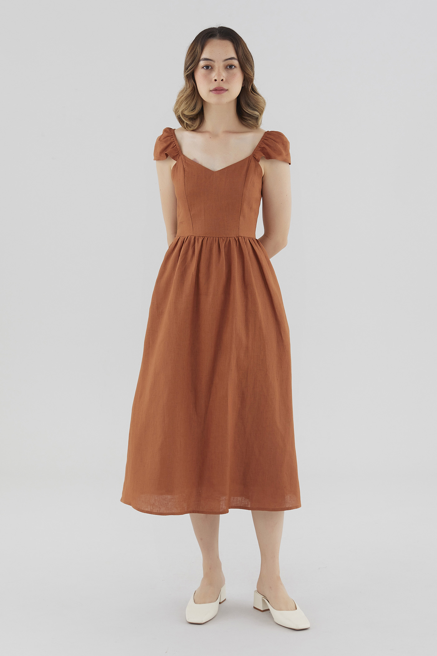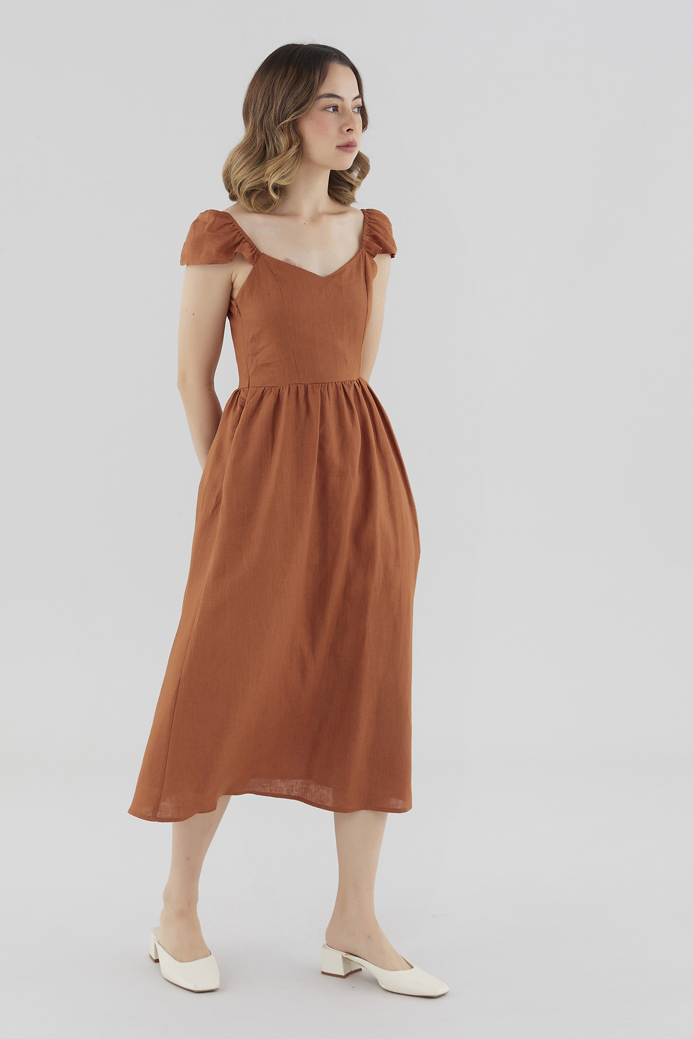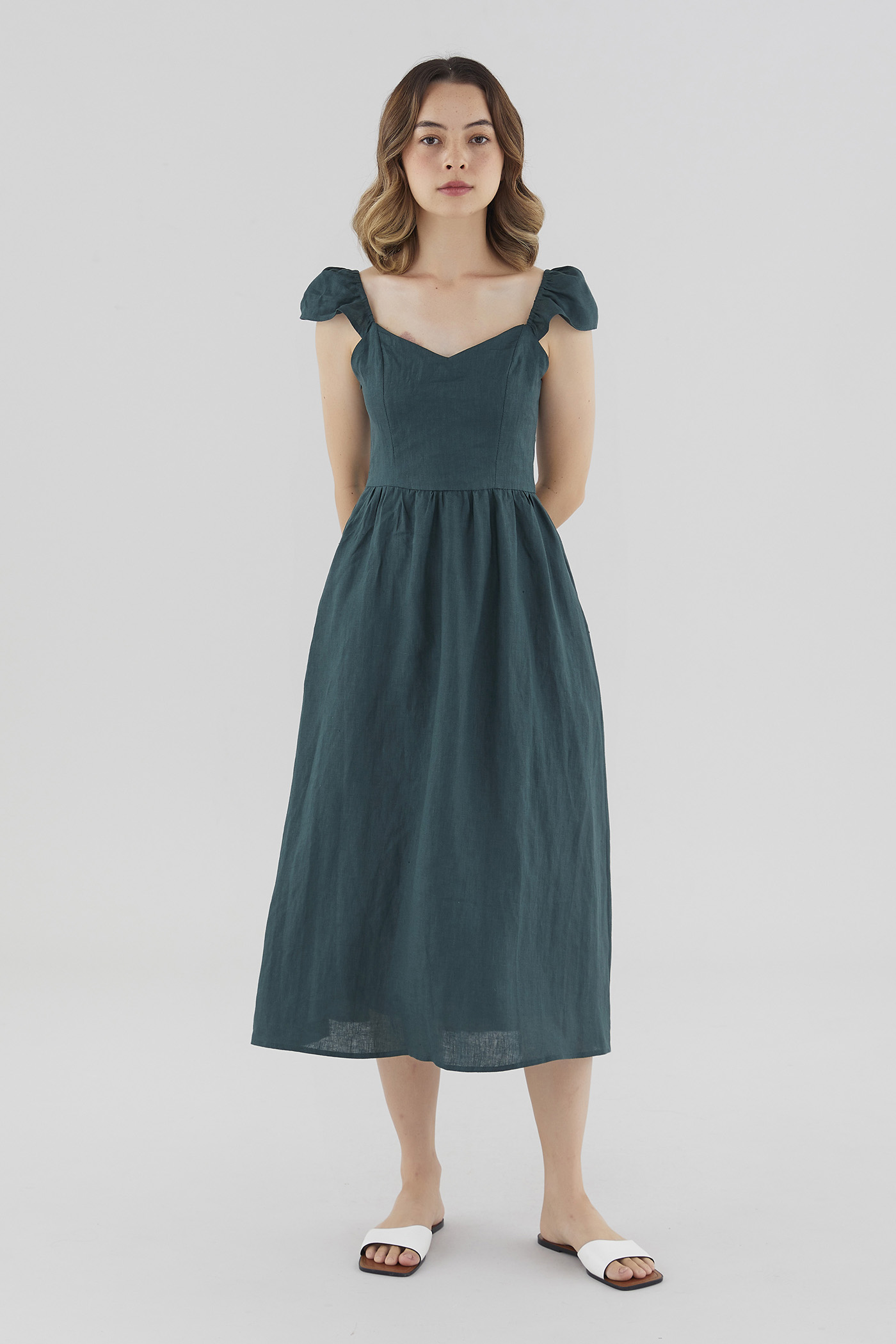How elegant. Cut from airy and softly structured 100% linen, this midi dress features a V-neckline, a panelled bodice, a side zip closure and short, elasticated cap sleeves that may be worn on or off the shoulder fabric. Fits slimmer at the waist before flaring out in a relaxed skirt.