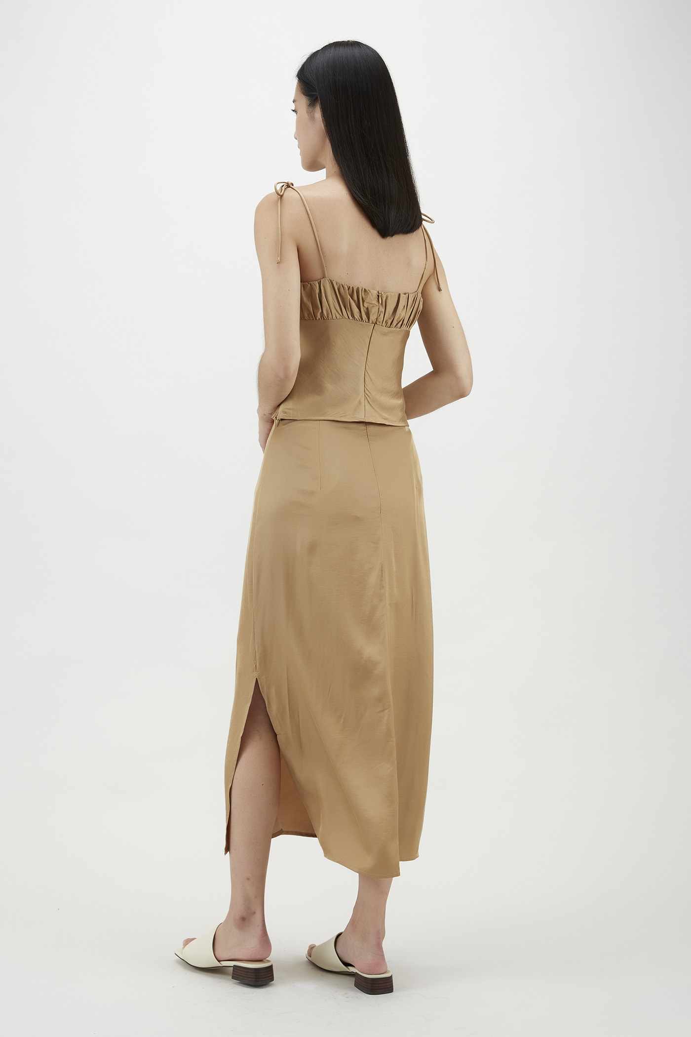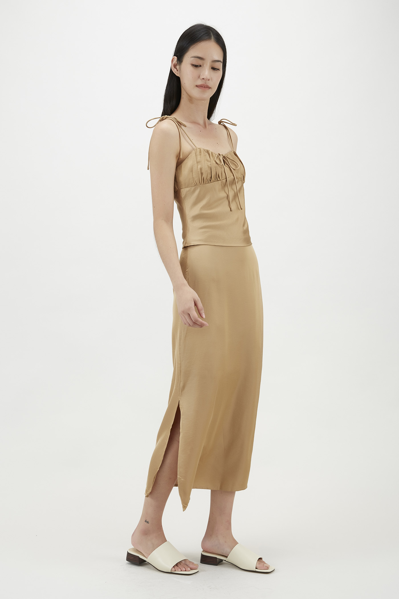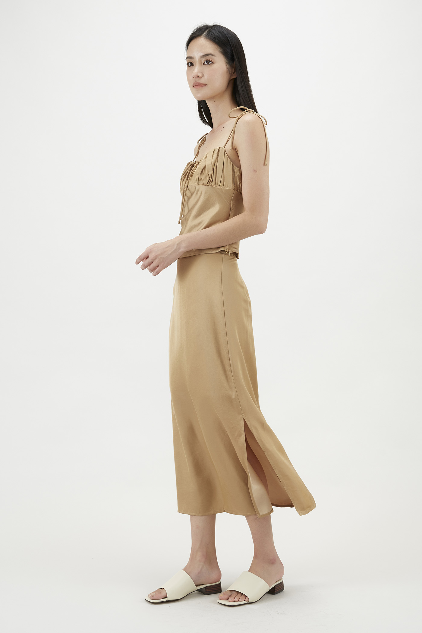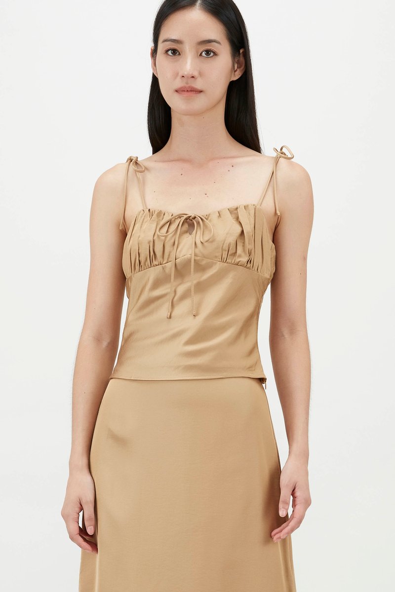 Easy silhouette, statement details. Made from soft and fully lined fabric, this sleeveless camisole flaunts an elegant sweetheart neckline, slim self-tying shoulder straps, a ruched bust and a self-tie closure on the front. Worn in a slim fit with zip closures on the side and back.