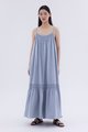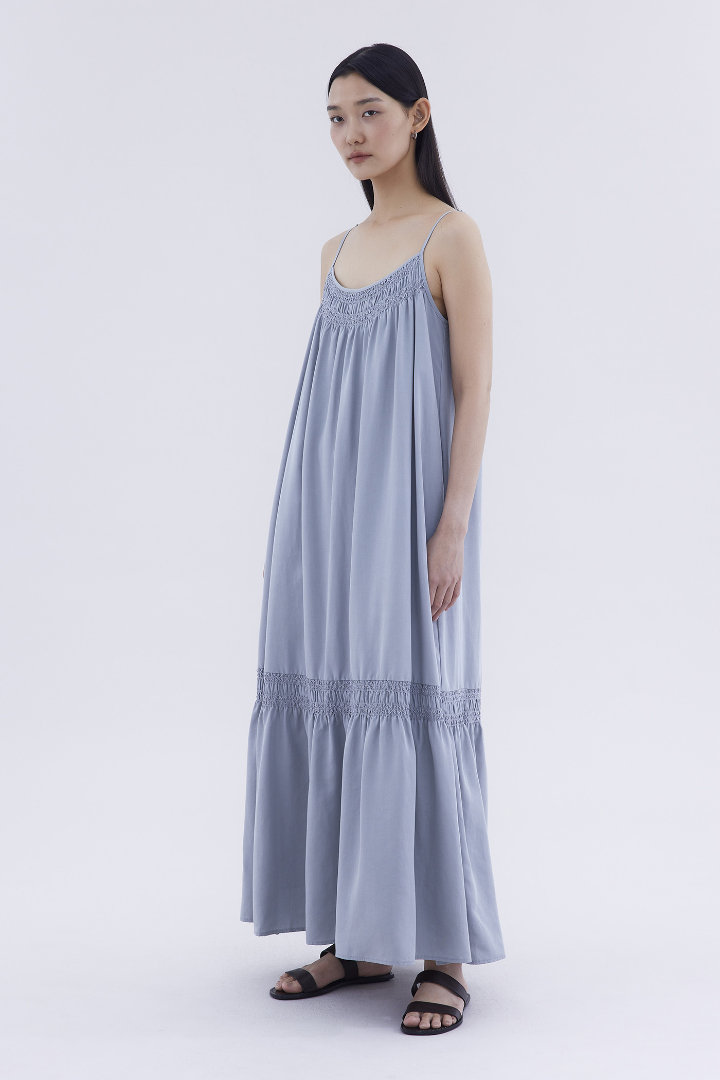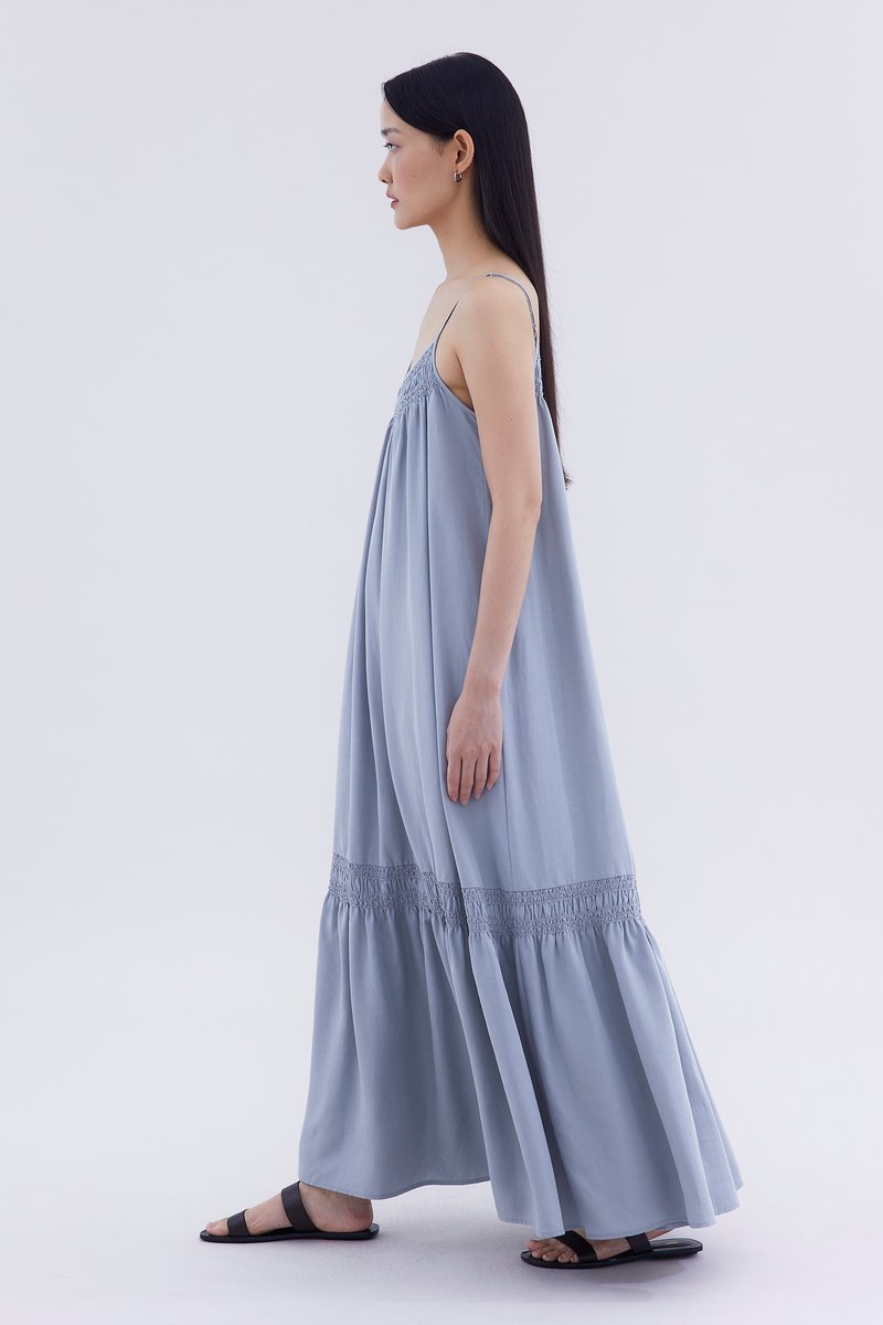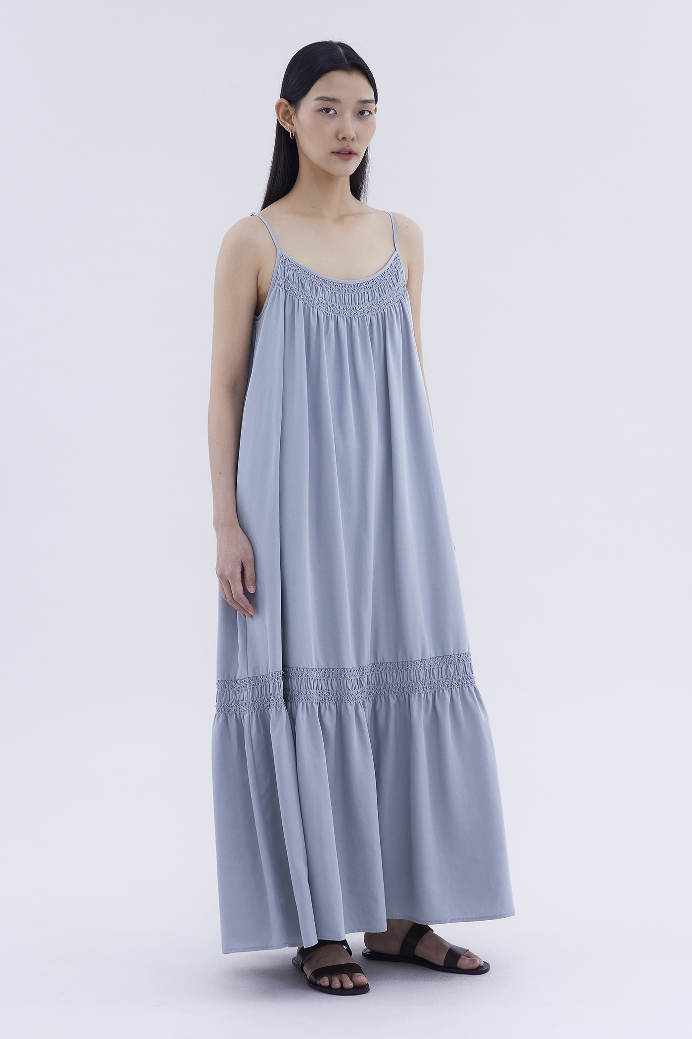 A touch of texture. Made from smooth and non-stretch fabric, this sleeveless maxi dress features a tiered silhouette, smocked neckline and slim adjustable shoulder straps. Worn in a relaxed fit.