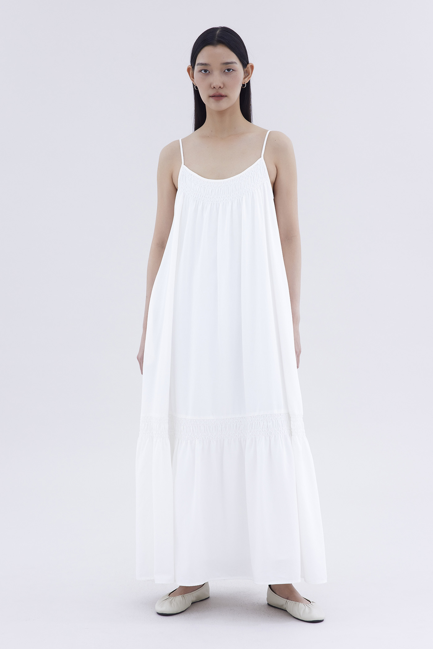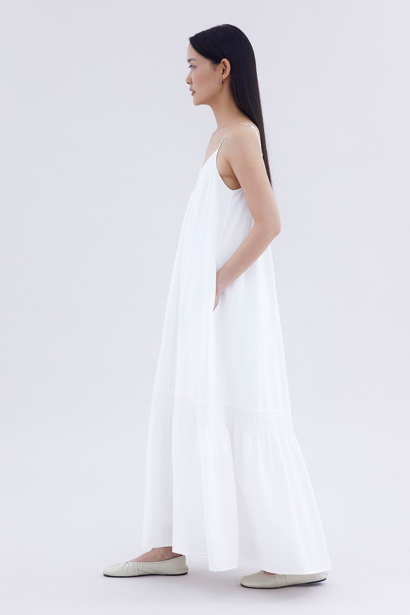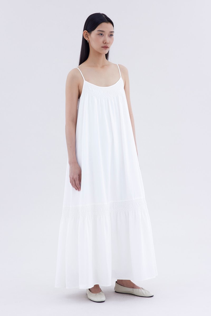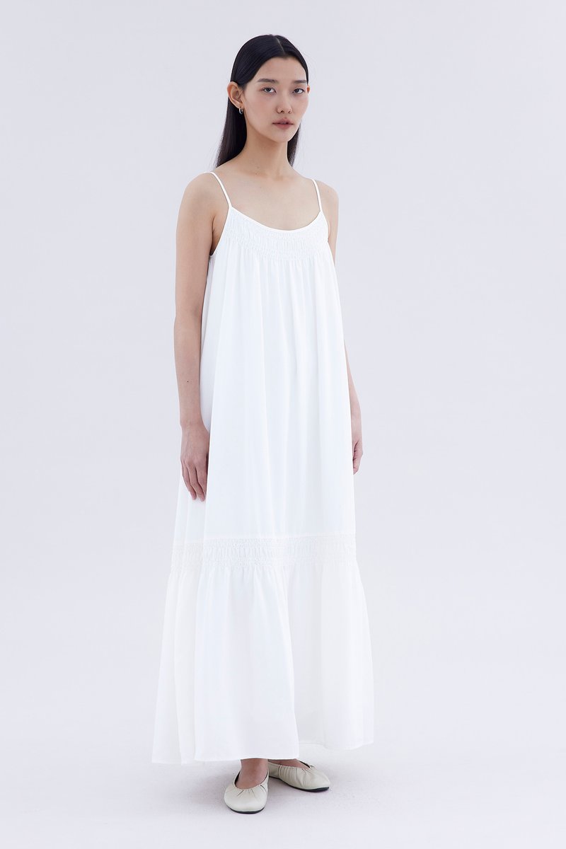 A touch of texture. Made from smooth and non-stretch fabric, this sleeveless maxi dress features a tiered silhouette, smocked neckline and slim adjustable shoulder straps. Worn in a relaxed fit.