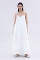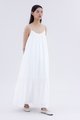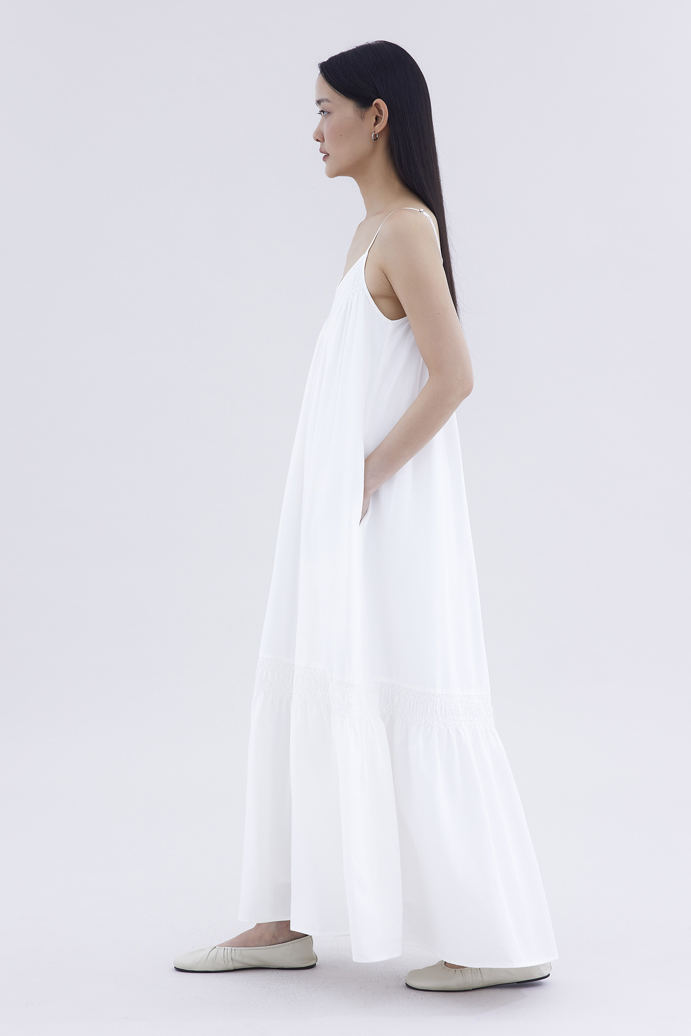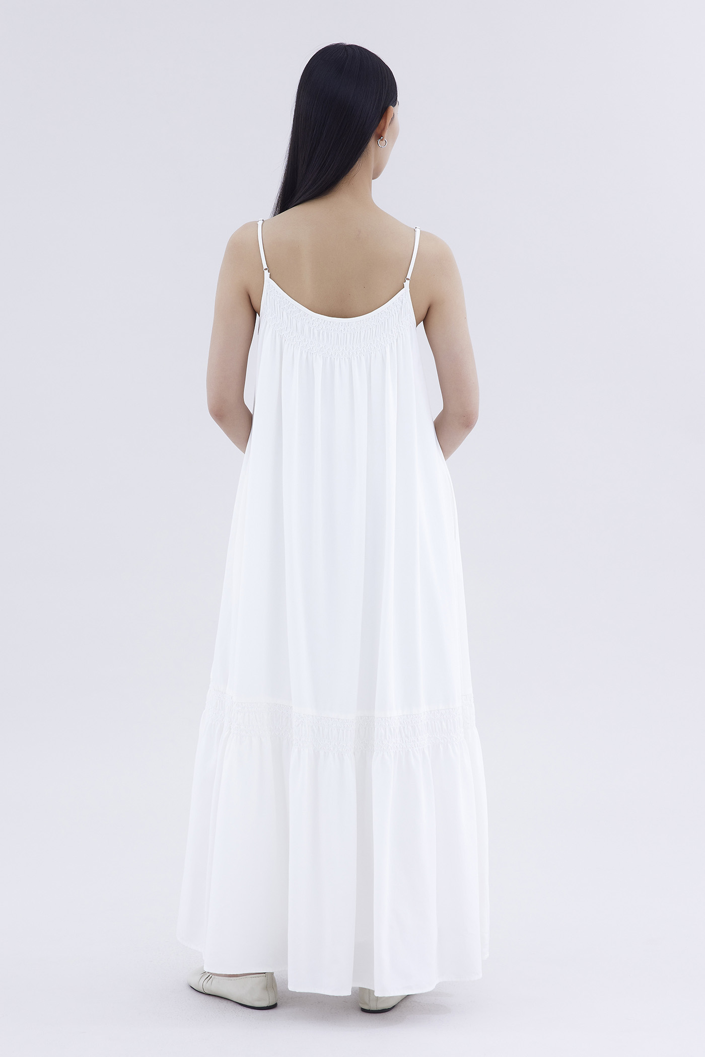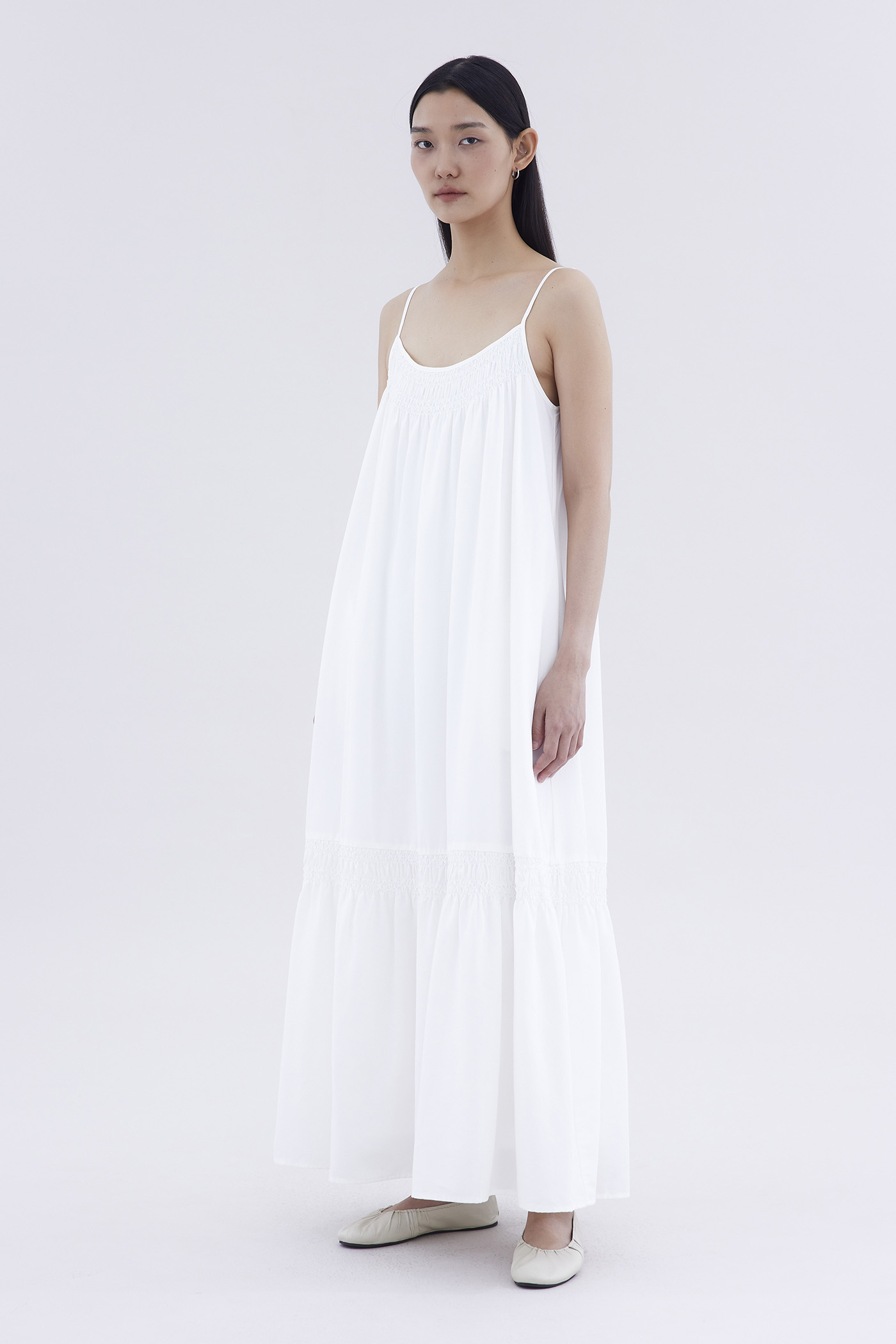 A touch of texture. Made from smooth and non-stretch fabric, this sleeveless maxi dress features a tiered silhouette, smocked neckline and slim adjustable shoulder straps. Worn in a relaxed fit.