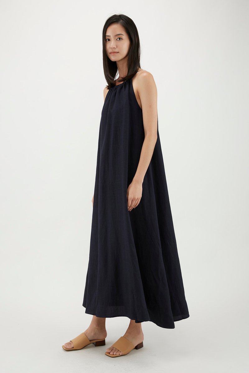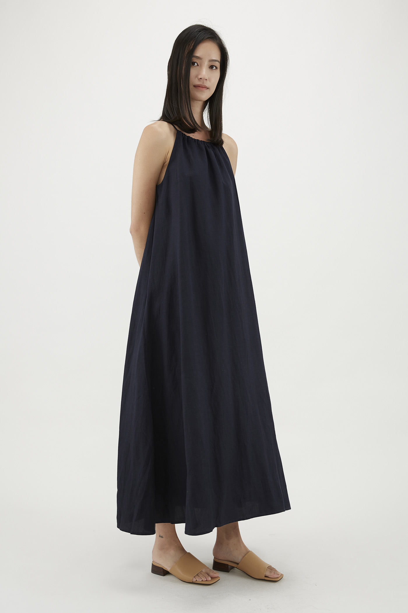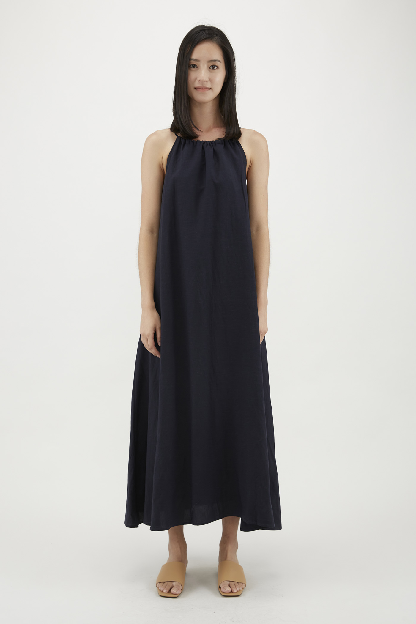 It doesn’t get more spacious than this. Made from fully lined fabric with a structured drape, this sleeveless maxi features slightly dropped arm holes and an adjustable drawstring neckline, linked to a self-tying closure at the back. Fits relaxed in a waistless, A-line silhouette.
