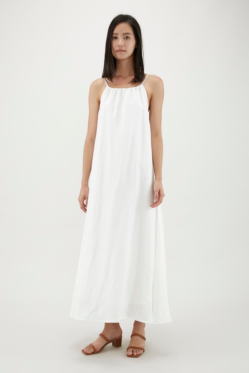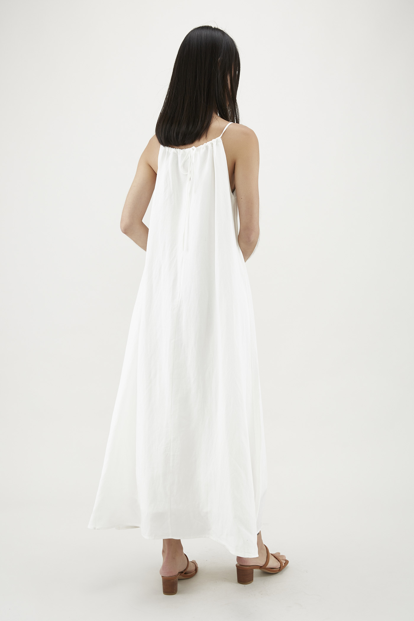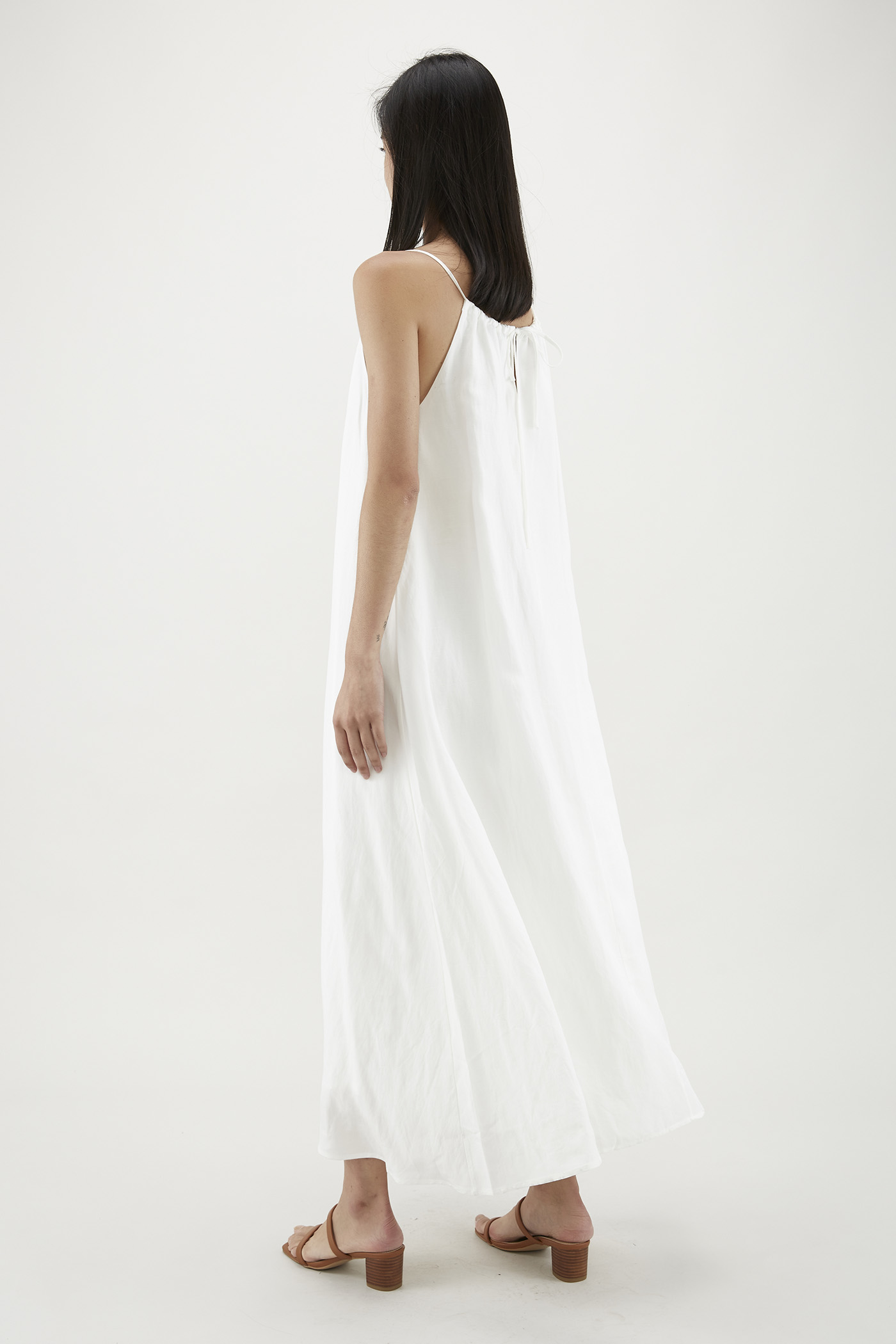 It doesn’t get more spacious than this. Made from fully lined fabric with a structured drape, this sleeveless maxi features slightly dropped arm holes and an adjustable drawstring neckline, linked to a self-tying closure at the back. Fits relaxed in a waistless, A-line silhouette.