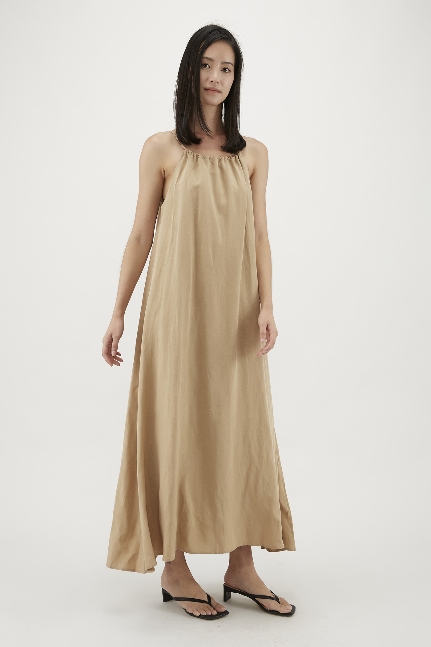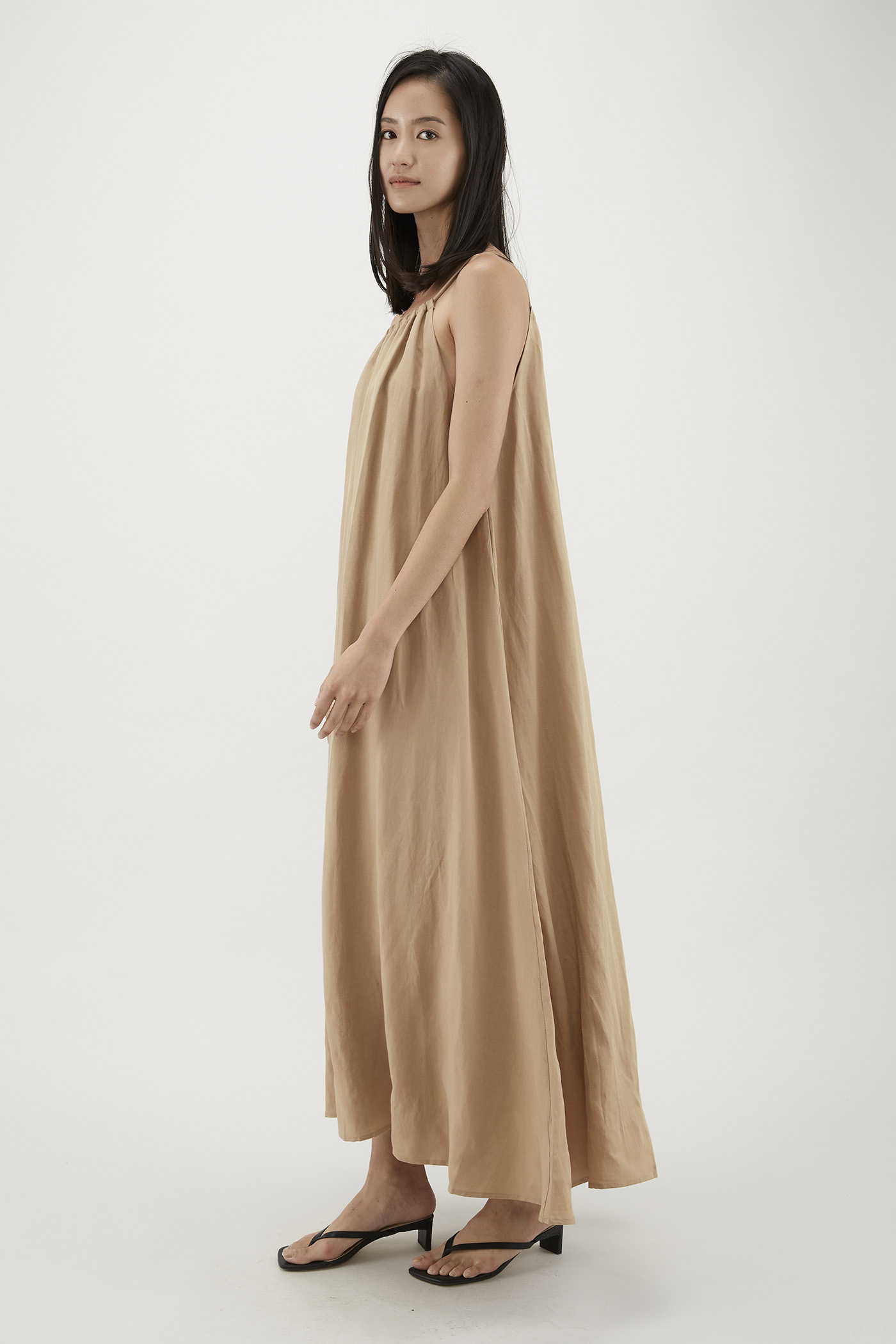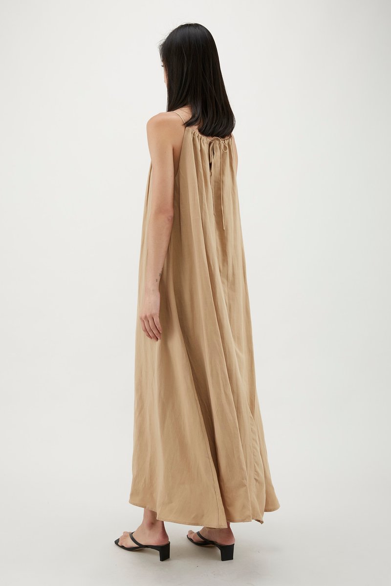 It doesn’t get more spacious than this. Made from fully lined fabric with a structured drape, this sleeveless maxi features slightly dropped arm holes and an adjustable drawstring neckline, linked to a self-tying closure at the back. Fits relaxed in a waistless, A-line silhouette.