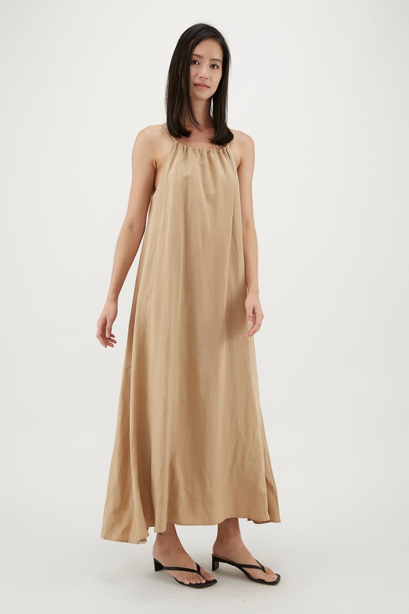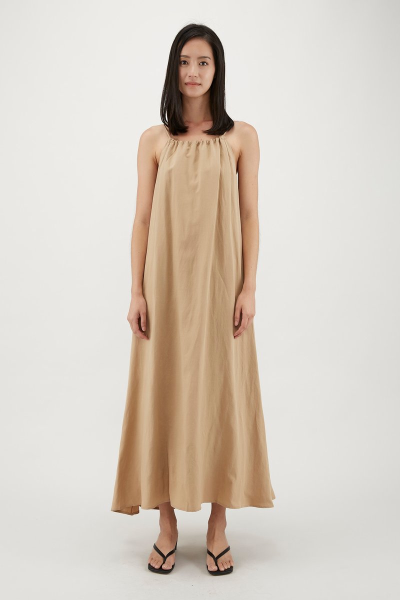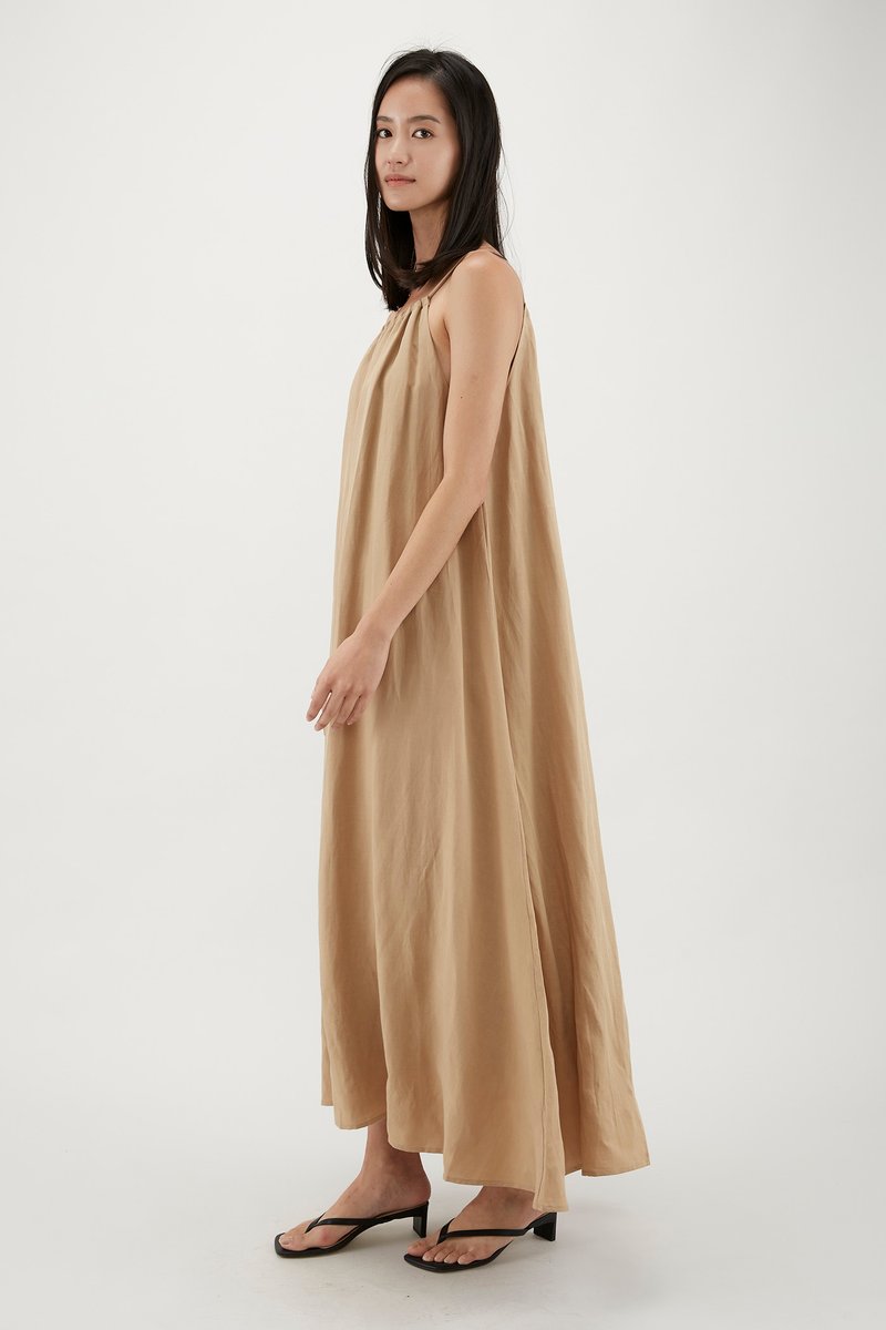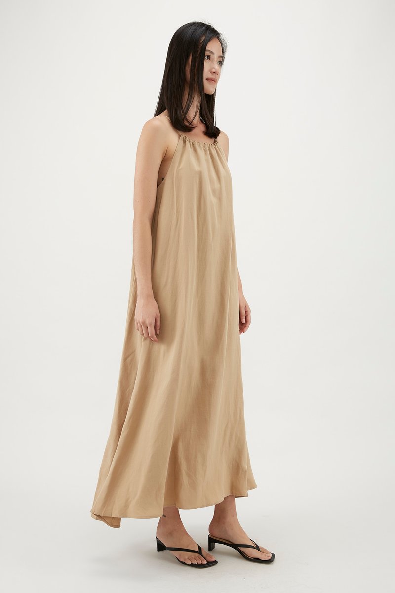 It doesn’t get more spacious than this. Made from fully lined fabric with a structured drape, this sleeveless maxi features slightly dropped arm holes and an adjustable drawstring neckline, linked to a self-tying closure at the back. Fits relaxed in a waistless, A-line silhouette.