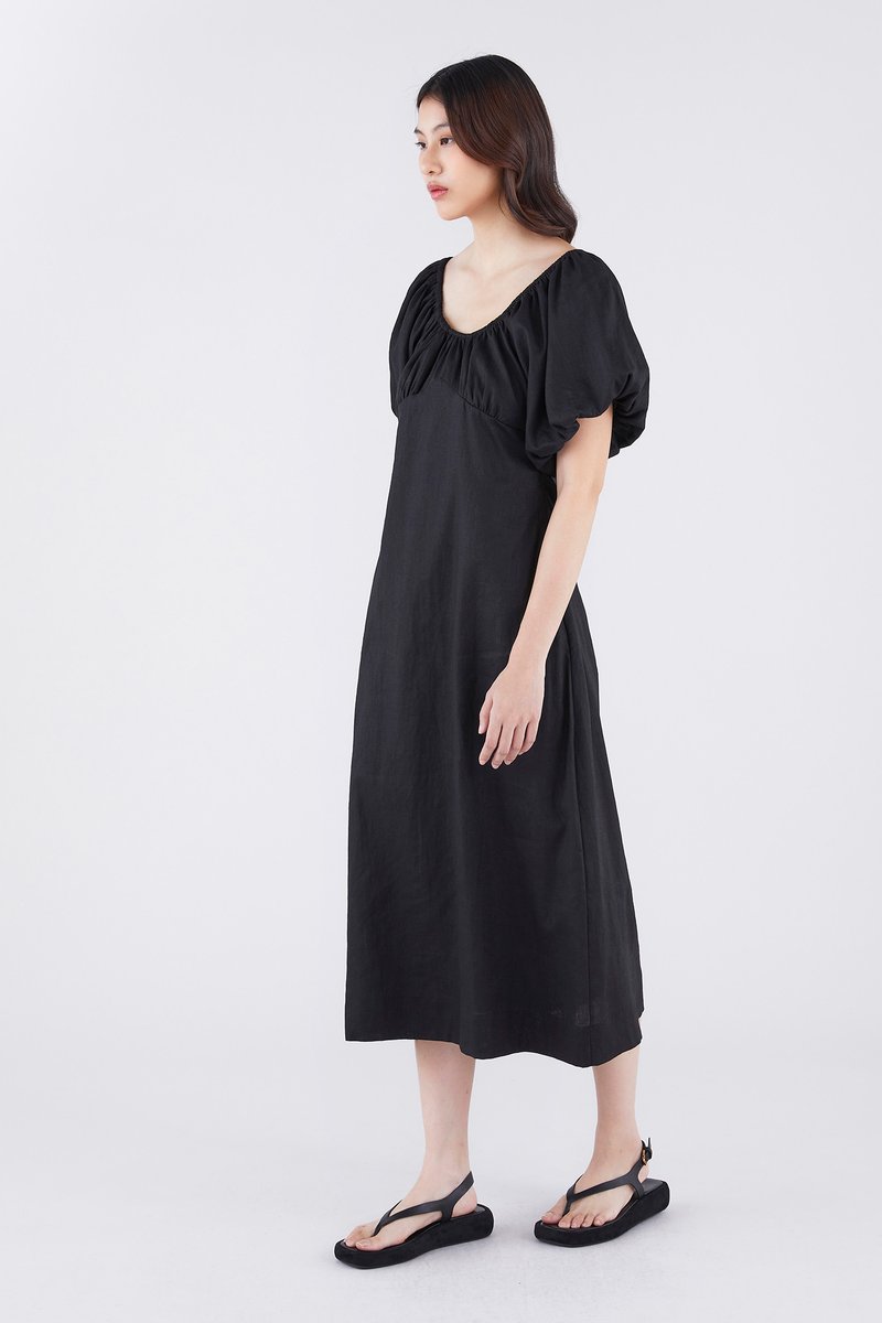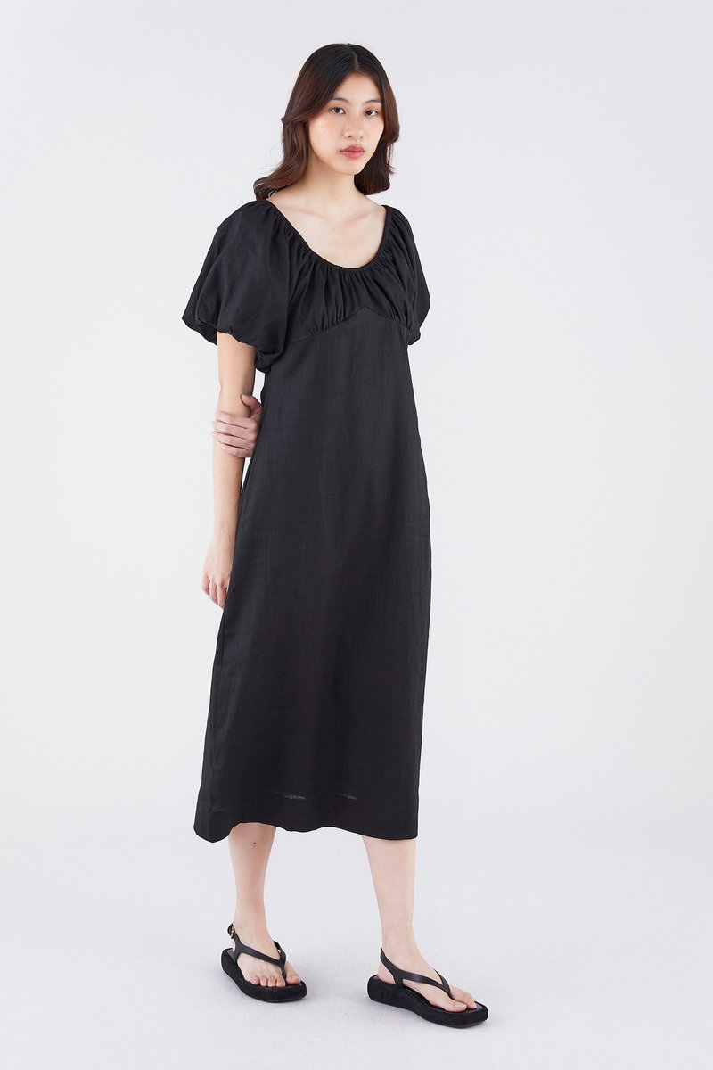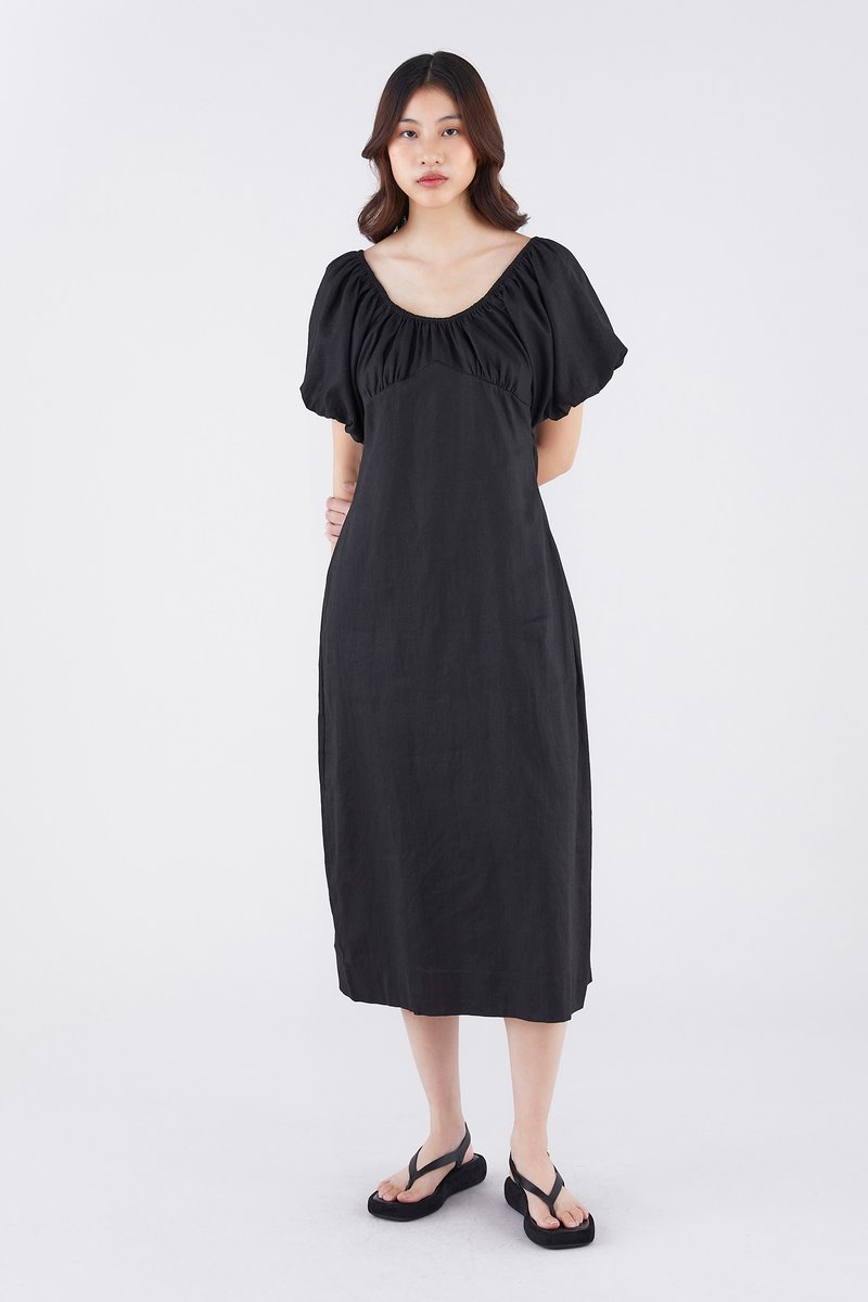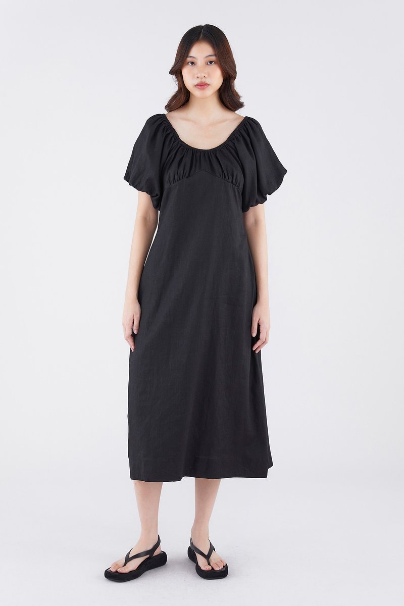 Big sleeve energy. Made from airy and softly structured linen, this midi-to-maxi dress features a ruched bust, a side zip closure and short puffed sleeves that may be styled on or off the shoulders. Fits relaxed in a waistless tent silhouette.