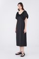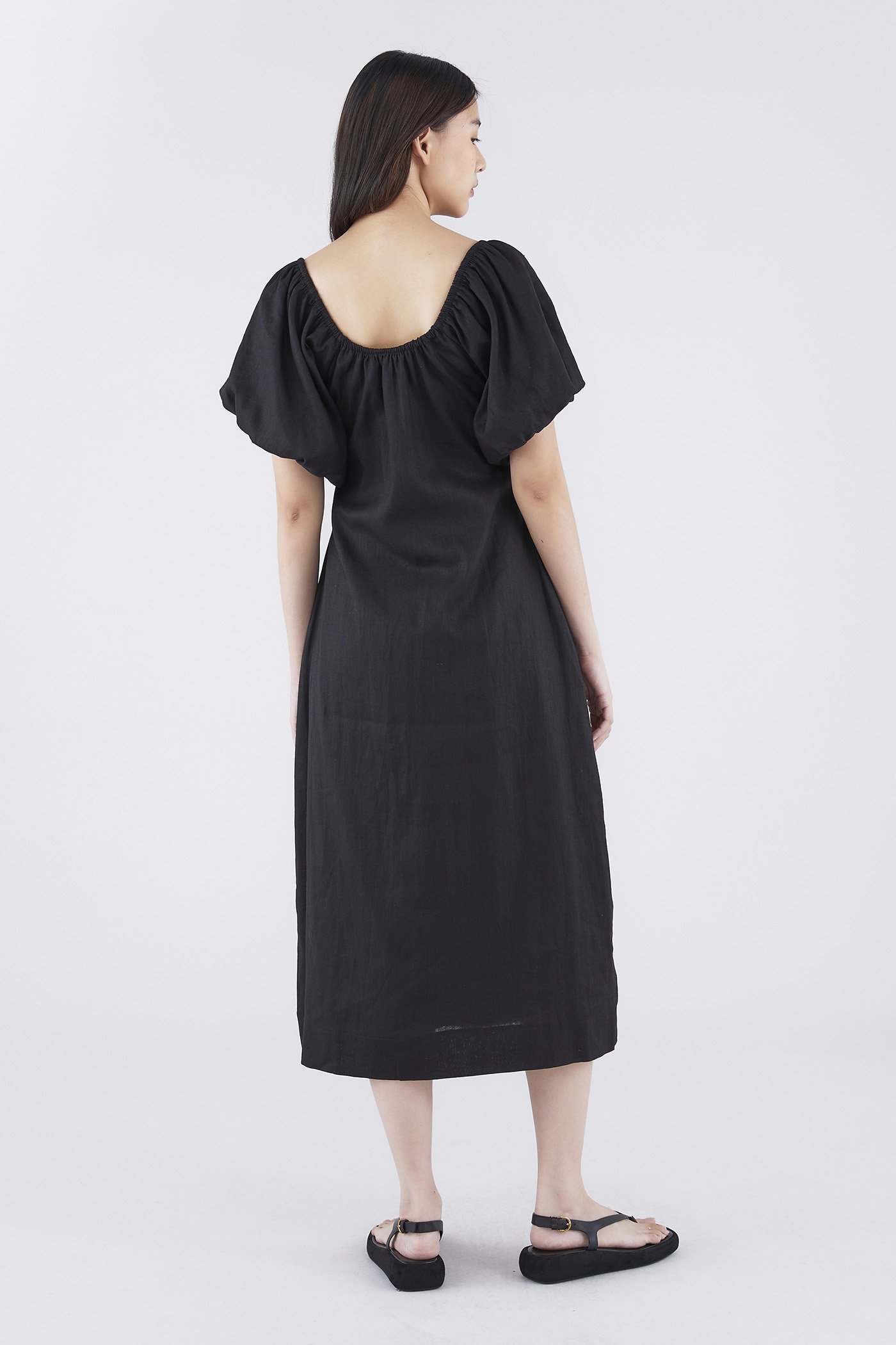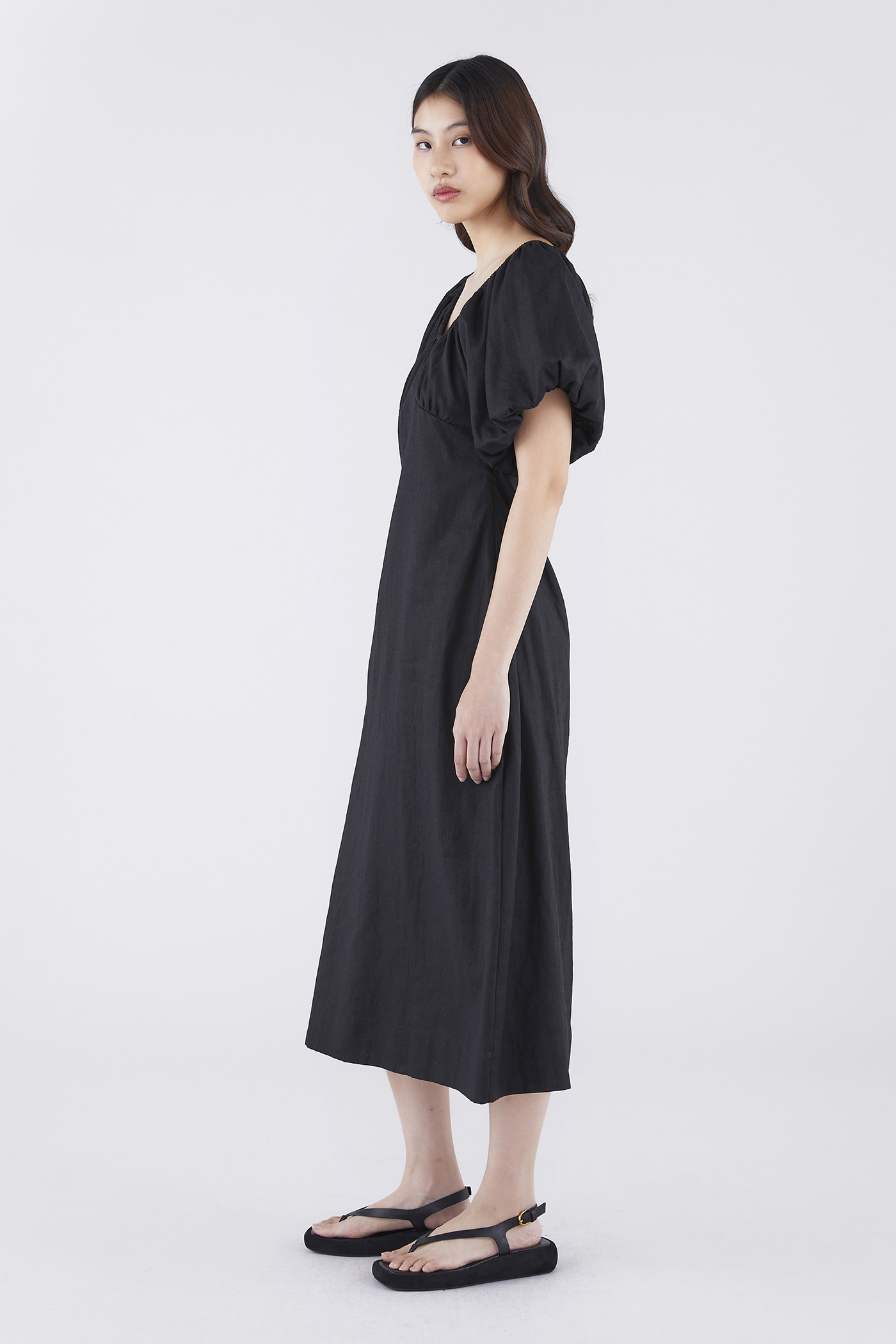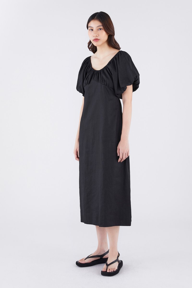 Big sleeve energy. Made from airy and softly structured linen, this midi-to-maxi dress features a ruched bust, a side zip closure and short puffed sleeves that may be styled on or off the shoulders. Fits relaxed in a waistless tent silhouette.